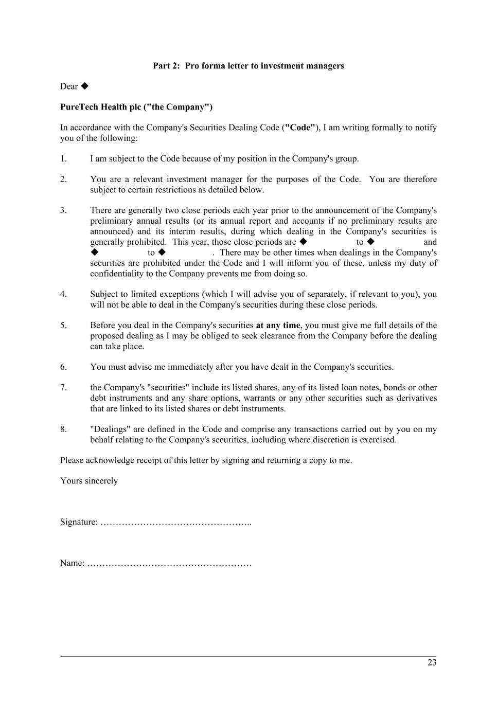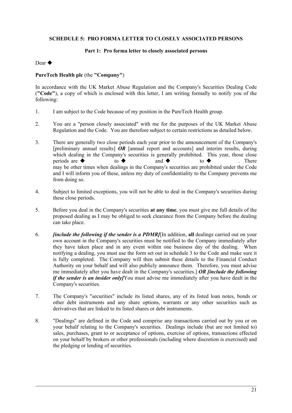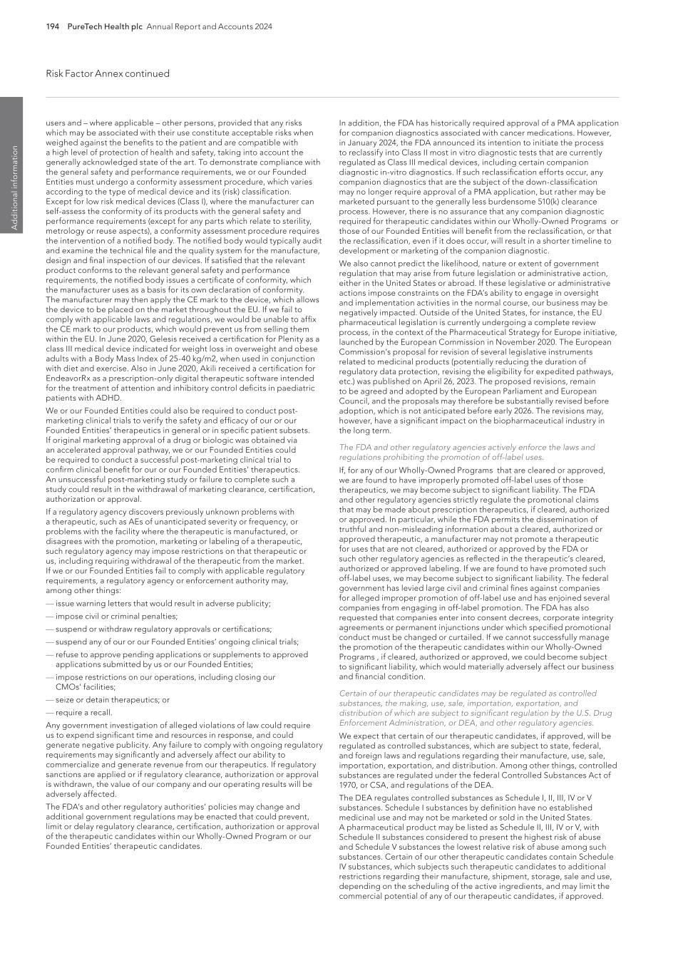 194 PureTech Health plc Annual Report and Accounts 2024 Risk Factor Annex continued A d d it io na l i nf o rm at io n In addition, the FDA has historically required approval of a PMA application for companion diagnostics associated with cancer medications. However, in January 2024, the FDA announced its intention to initiate the process to reclassify into Class II most in vitro diagnostic tests that are currently regulated as Class III medical devices, including certain companion diagnostic in-vitro diagnostics. If such reclassification efforts occur, any companion diagnostics that are the subject of the down-classification may no longer require approval of a PMA application, but rather may be marketed pursuant to the generally less burdensome 510(k) clearance process. However, there is no assurance that any companion diagnostic required for therapeutic candidates within our Wholly-Owned Programs or those of our Founded Entities will benefit from the reclassification, or that the reclassification, even if it does occur, will result in a shorter timeline to development or marketing of the companion diagnostic. We also cannot predict the likelihood, nature or extent of government regulation that may arise from future legislation or administrative action, either in the United States or abroad. If these legislative or administrative actions impose constraints on the FDA’s ability to engage in oversight and implementation activities in the normal course, our business may be negatively impacted. Outside of the United States, for instance, the EU pharmaceutical legislation is currently undergoing a complete review process, in the context of the Pharmaceutical Strategy for Europe initiative, launched by the European Commission in November 2020. The European Commission’s proposal for revision of several legislative instruments related to medicinal products (potentially reducing the duration of regulatory data protection, revising the eligibility for expedited pathways, etc.) was published on April 26, 2023. The proposed revisions, remain to be agreed and adopted by the European Parliament and European Council, and the proposals may therefore be substantially revised before adoption, which is not anticipated before early 2026. The revisions may, however, have a significant impact on the biopharmaceutical industry in the long term. The FDA and other regulatory agencies actively enforce the laws and regulations prohibiting the promotion of off-label uses. If, for any of our Wholly-Owned Programs that are cleared or approved, we are found to have improperly promoted off-label uses of those therapeutics, we may become subject to significant liability. The FDA and other regulatory agencies strictly regulate the promotional claims that may be made about prescription therapeutics, if cleared, authorized or approved. In particular, while the FDA permits the dissemination of truthful and non-misleading information about a cleared, authorized or approved therapeutic, a manufacturer may not promote a therapeutic for uses that are not cleared, authorized or approved by the FDA or such other regulatory agencies as reflected in the therapeutic’s cleared, authorized or approved labeling. If we are found to have promoted such off-label uses, we may become subject to significant liability. The federal government has levied large civil and criminal fines against companies for alleged improper promotion of off-label use and has enjoined several companies from engaging in off-label promotion. The FDA has also requested that companies enter into consent decrees, corporate integrity agreements or permanent injunctions under which specified promotional conduct must be changed or curtailed. If we cannot successfully manage the promotion of the therapeutic candidates within our Wholly-Owned Programs , if cleared, authorized or approved, we could become subject to significant liability, which would materially adversely affect our business and financial condition. Certain of our therapeutic candidates may be regulated as controlled substances, the making, use, sale, importation, exportation, and distribution of which are subject to significant regulation by the U.S. Drug Enforcement Administration, or DEA, and other regulatory agencies. We expect that certain of our therapeutic candidates, if approved, will be regulated as controlled substances, which are subject to state, federal, and foreign laws and regulations regarding their manufacture, use, sale, importation, exportation, and distribution. Among other things, controlled substances are regulated under the federal Controlled Substances Act of 1970, or CSA, and regulations of the DEA. The DEA regulates controlled substances as Schedule I, II, III, IV or V substances. Schedule I substances by definition have no established medicinal use and may not be marketed or sold in the United States. A pharmaceutical product may be listed as Schedule II, III, IV or V, with Schedule II substances considered to present the highest risk of abuse and Schedule V substances the lowest relative risk of abuse among such substances. Certain of our other therapeutic candidates contain Schedule IV substances, which subjects such therapeutic candidates to additional restrictions regarding their manufacture, shipment, storage, sale and use, depending on the scheduling of the active ingredients, and may limit the commercial potential of any of our therapeutic candidates, if approved. users and – where applicable – other persons, provided that any risks which may be associated with their use constitute acceptable risks when weighed against the benefits to the patient and are compatible with a high level of protection of health and safety, taking into account the generally acknowledged state of the art. To demonstrate compliance with the general safety and performance requirements, we or our Founded Entities must undergo a conformity assessment procedure, which varies according to the t