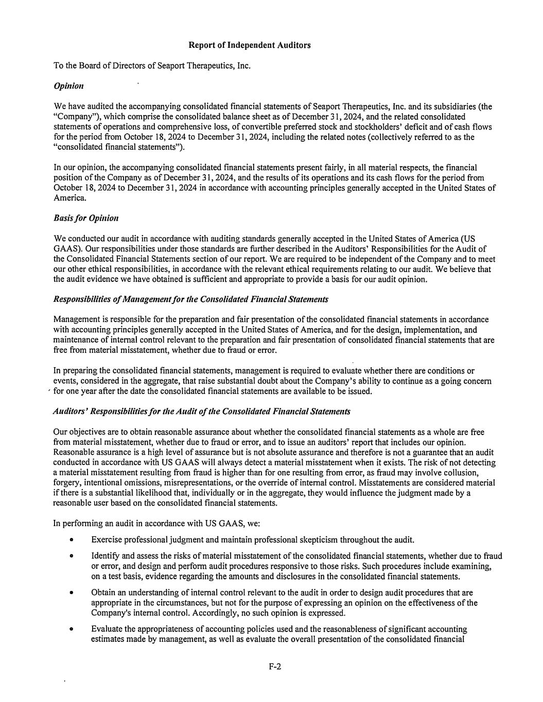 F-1 Seaport Therapeutics, Inc. INDEX TO CONSOLIDATED FINANCIAL STATEMENTS Audited Consolidated Financial Statements for the Period of October 18, 2024 through December 31, 2024 Report from Independent Auditors F-2 Consolidated Balance Sheet F-4 Consolidated Statement of Operations and Comprehensive Loss F-5 Consolidated Statement of Changes in Convertible Preferred Stock and Stockholders' Deficit F-6 Consolidated Statement of Cash Flows F-7 Notes to Consolidated Financial Statements F-8