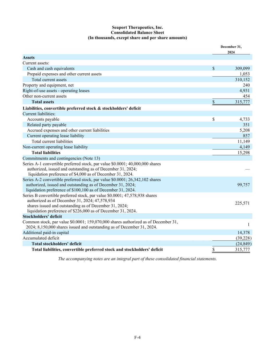 F-4 Seaport Therapeutics, Inc. Consolidated Balance Sheet (In thousands, except share and per share amounts) December 31, 2024 Assets Current assets: Cash and cash equivalents $ 309,099 Prepaid expenses and other current assets 1,053 Total current assets 310,152 Property and equipment, net 240 Right-of-use assets - operating leases 4,931 Other non-current assets 454 Total assets $ 315,777 Liabilities, convertible preferred stock & stockholders' deficit Current liabilities: Accounts payable $ 4,733 Related party payable 351 Accrued expenses and other current liabilities 5,208 Current operating lease liability 857 Total current liabilities 11,149 Non-current operating lease liability 4,149 Total liabilities 15,298 Commitments and contingencies (Note 13) Series A-1 convertible preferred stock, par value $0.0001; 40,000,000 shares authorized, issued and outstanding as of December 31, 2024; liquidation preference of $4,000 as of December 31, 2024. — Series A-2 convertible preferred stock, par value $0.0001; 26,342,102 shares authorized, issued and outstanding as of December 31, 2024; liquidation preference of $100,100 as of December 31, 2024. 99,757 Series B convertible preferred stock, par value $0.0001; 47,578,938 shares authorized as of December 31, 2024; 47,578,934 shares issued and outstanding as of December 31, 2024; liquidation preference of $226,000 as of December 31, 2024. 225,571 Stockholders' deficit Common stock, par value $0.0001; 159,070,000 shares authorized as of December 31, 2024; 8,150,000 shares issued and outstanding as of December 31, 2024. 1 Additional paid-in capital 14,378 Accumulated deficit (39,228 ) Total stockholders' deficit (24,849 ) Total liabilities, convertible preferred stock and stockholders' deficit $ 315,777 The accompanying notes are an integral part of these consolidated financial statements.