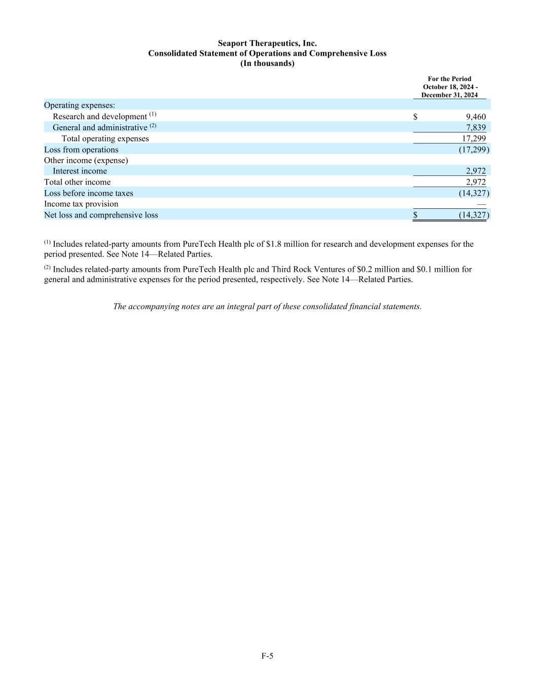 F-5 Seaport Therapeutics, Inc. Consolidated Statement of Operations and Comprehensive Loss (In thousands) For the Period October 18, 2024 - December 31, 2024 Operating expenses: Research and development (1) $ 9,460 General and administrative (2) 7,839 Total operating expenses 17,299 Loss from operations (17,299 ) Other income (expense) Interest income 2,972 Total other income 2,972 Loss before income taxes (14,327 ) Income tax provision — Net loss and comprehensive loss $ (14,327 ) (1) Includes related-party amounts from PureTech Health plc of $1.8 million for research and development expenses for the period presented. See Note 14—Related Parties. (2) Includes related-party amounts from PureTech Health plc and Third Rock Ventures of $0.2 million and $0.1 million for general and administrative expenses for the period presented, respectively. See Note 14—Related Parties. The accompanying notes are an integral part of these consolidated financial statements.