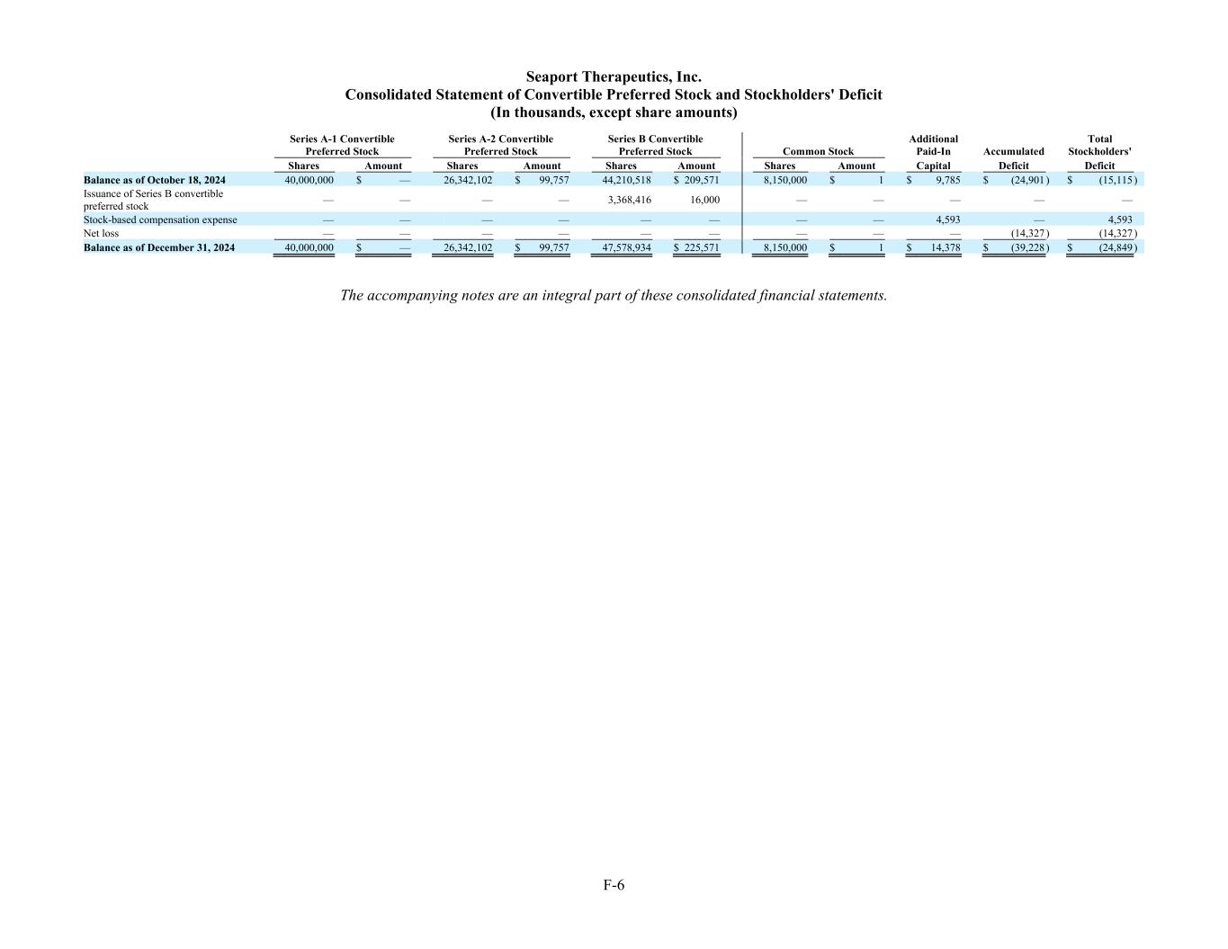 F-6 Seaport Therapeutics, Inc. Consolidated Statement of Convertible Preferred Stock and Stockholders' Deficit (In thousands, except share amounts) Series A-1 Convertible Preferred Stock Series A-2 Convertible Preferred Stock Series B Convertible Preferred Stock Common Stock Additional Paid-In Accumulated Total Stockholders' Shares Amount Shares Amount Shares Amount Shares Amount Capital Deficit Deficit Balance as of October 18, 2024 40,000,000 $ — 26,342,102 $ 99,757 44,210,518 $ 209,571 8,150,000 $ 1 $ 9,785 $ (24,901 ) $ (15,115 ) Issuance of Series B convertible preferred stock — — — — 3,368,416 16,000 — — — — — Stock-based compensation expense — — — — — — — — 4,593 — 4,593 Net loss — — — — — — — — — (14,327 ) (14,327 ) Balance as of December 31, 2024 40,000,000 $ — 26,342,102 $ 99,757 47,578,934 $ 225,571 8,150,000 $ 1 $ 14,378 $ (39,228 ) $ (24,849 ) The accompanying notes are an integral part of these consolidated financial statements.