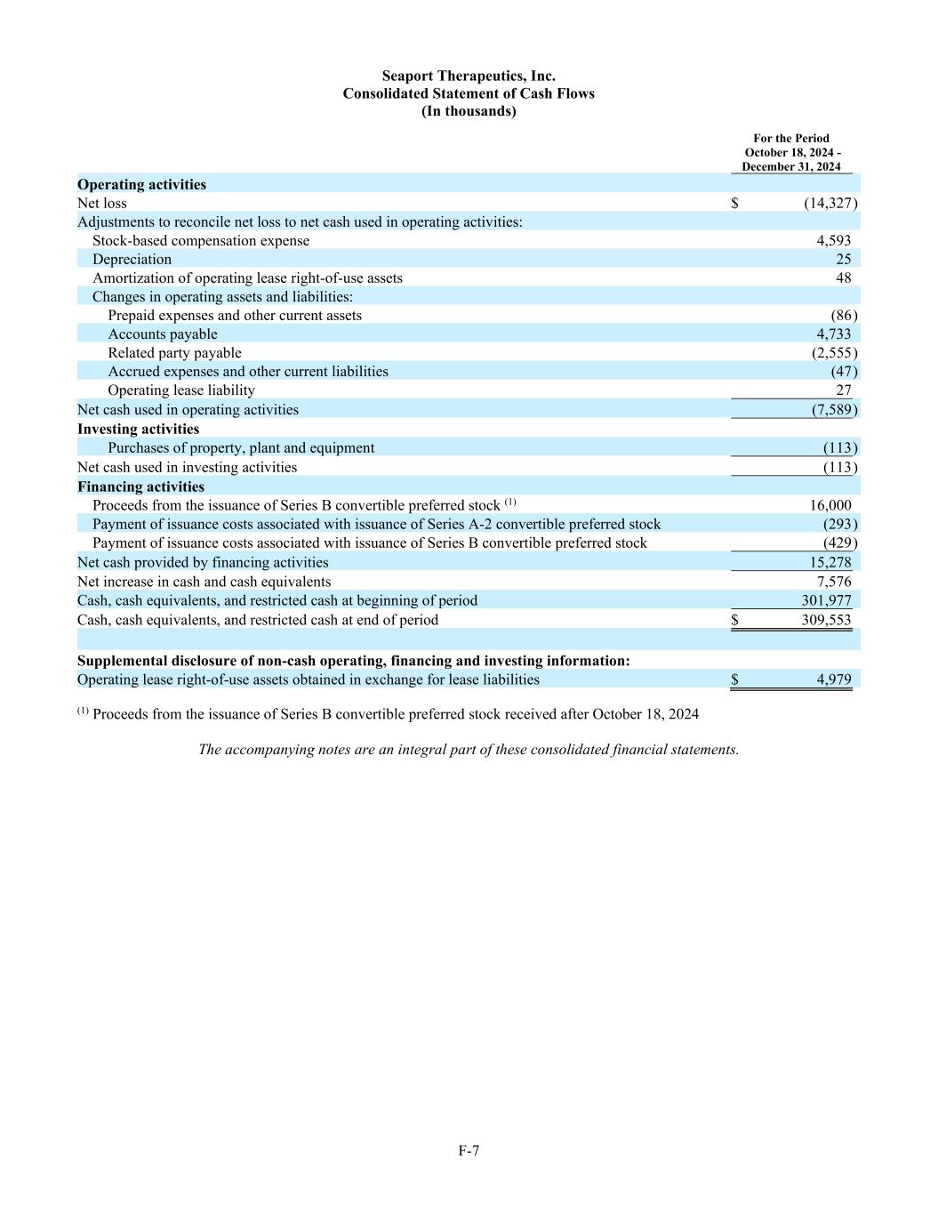F-7 Seaport Therapeutics, Inc. Consolidated Statement of Cash Flows (In thousands) For the Period October 18, 2024 - December 31, 2024 Operating activities Net loss $ (14,327 ) Adjustments to reconcile net loss to net cash used in operating activities: Stock-based compensation expense 4,593 Depreciation 25 Amortization of operating lease right-of-use assets 48 Changes in operating assets and liabilities: Prepaid expenses and other current assets (86 ) Accounts payable 4,733 Related party payable (2,555 ) Accrued expenses and other current liabilities (47 ) Operating lease liability 27 Net cash used in operating activities (7,589 ) Investing activities Purchases of property, plant and equipment (113 ) Net cash used in investing activities (113 ) Financing activities Proceeds from the issuance of Series B convertible preferred stock (1) 16,000 Payment of issuance costs associated with issuance of Series A-2 convertible preferred stock (293 ) Payment of issuance costs associated with issuance of Series B convertible preferred stock (429 ) Net cash provided by financing activities 15,278 Net increase in cash and cash equivalents 7,576 Cash, cash equivalents, and restricted cash at beginning of period 301,977 Cash, cash equivalents, and restricted cash at end of period $ 309,553 Supplemental disclosure of non-cash operating, financing and investing information: Operating lease right-of-use assets obtained in exchange for lease liabilities $ 4,979 (1) Proceeds from the issuance of Series B convertible preferred stock received after October 18, 2024 The accompanying notes are an integral part of these consolidated financial statements.