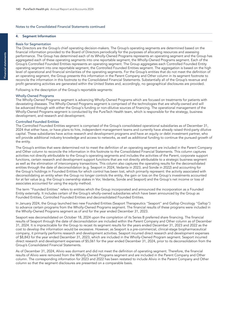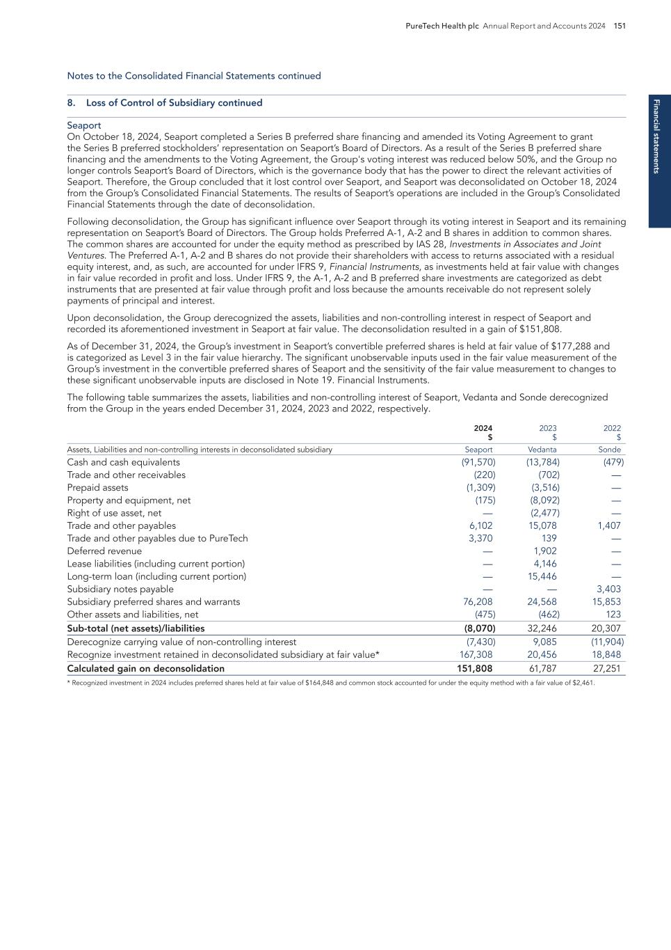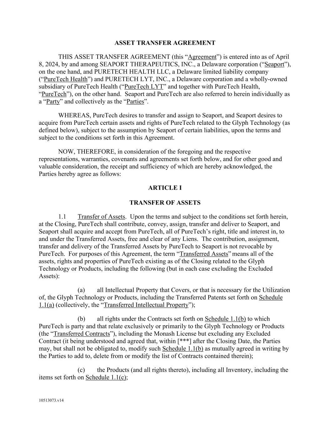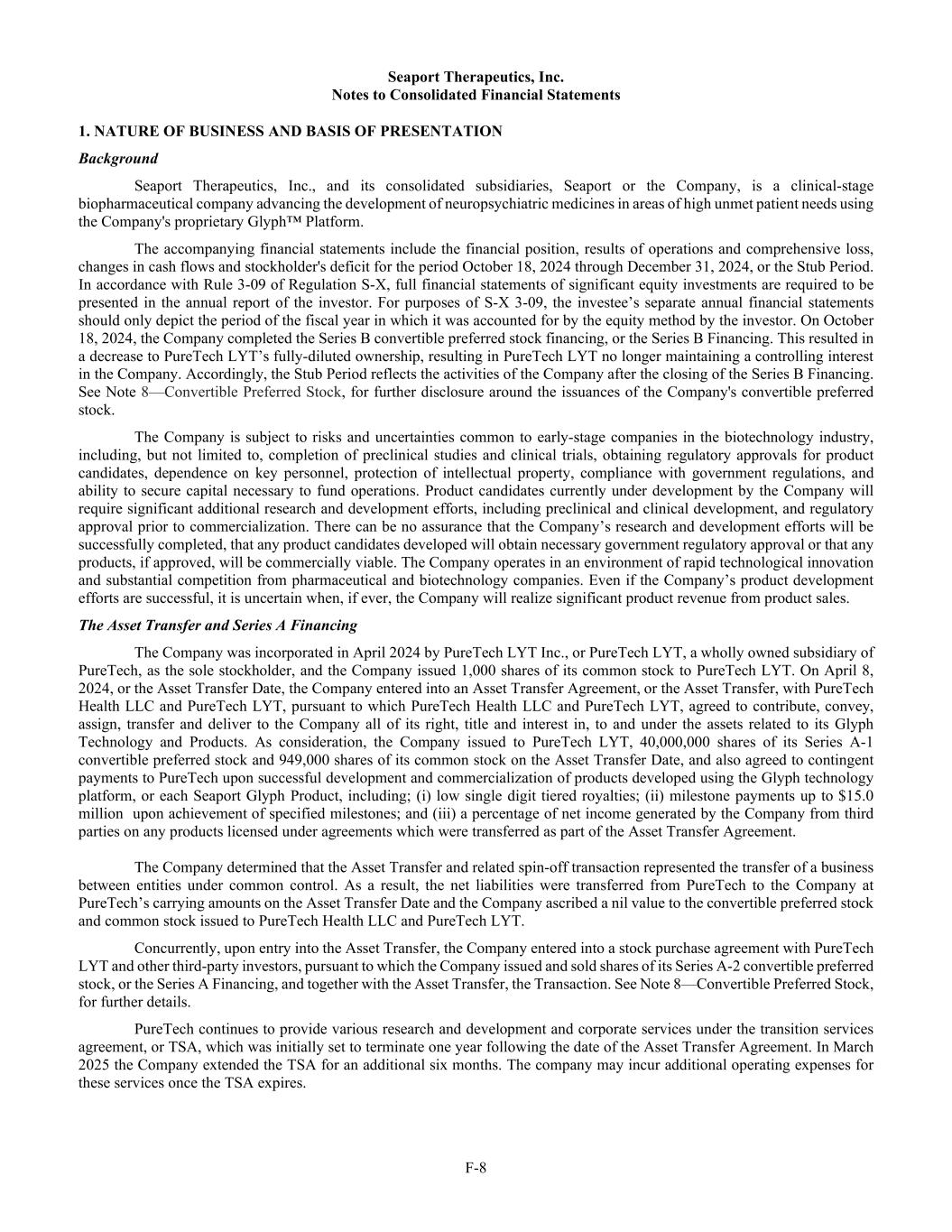 F-8 Seaport Therapeutics, Inc. Notes to Consolidated Financial Statements 1. NATURE OF BUSINESS AND BASIS OF PRESENTATION Background Seaport Therapeutics, Inc., and its consolidated subsidiaries, Seaport or the Company, is a clinical-stage biopharmaceutical company advancing the development of neuropsychiatric medicines in areas of high unmet patient needs using the Company's proprietary Glyph™ Platform. The accompanying financial statements include the financial position, results of operations and comprehensive loss, changes in cash flows and stockholder's deficit for the period October 18, 2024 through December 31, 2024, or the Stub Period. In accordance with Rule 3-09 of Regulation S-X, full financial statements of significant equity investments are required to be presented in the annual report of the investor. For purposes of S-X 3-09, the investee’s separate annual financial statements should only depict the period of the fiscal year in which it was accounted for by the equity method by the investor. On October 18, 2024, the Company completed the Series B convertible preferred stock financing, or the Series B Financing. This resulted in a decrease to PureTech LYT’s fully-diluted ownership, resulting in PureTech LYT no longer maintaining a controlling interest in the Company. Accordingly, the Stub Period reflects the activities of the Company after the closing of the Series B Financing. See Note 8—Convertible Preferred Stock, for further disclosure around the issuances of the Company's convertible preferred stock. The Company is subject to risks and uncertainties common to early-stage companies in the biotechnology industry, including, but not limited to, completion of preclinical studies and clinical trials, obtaining regulatory approvals for product candidates, dependence on key personnel, protection of intellectual property, compliance with government regulations, and ability to secure capital necessary to fund operations. Product candidates currently under development by the Company will require significant additional research and development efforts, including preclinical and clinical development, and regulatory approval prior to commercialization. There can be no assurance that the Company’s research and development efforts will be successfully completed, that any product candidates developed will obtain necessary government regulatory approval or that any products, if approved, will be commercially viable. The Company operates in an environment of rapid technological innovation and substantial competition from pharmaceutical and biotechnology companies. Even if the Company’s product development efforts are successful, it is uncertain when, if ever, the Company will realize significant product revenue from product sales. The Asset Transfer and Series A Financing The Company was incorporated in April 2024 by PureTech LYT Inc., or PureTech LYT, a wholly owned subsidiary of PureTech, as the sole stockholder, and the Company issued 1,000 shares of its common stock to PureTech LYT. On April 8, 2024, or the Asset Transfer Date, the Company entered into an Asset Transfer Agreement, or the Asset Transfer, with PureTech Health LLC and PureTech LYT, pursuant to which PureTech Health LLC and PureTech LYT, agreed to contribute, convey, assign, transfer and deliver to the Company all of its right, title and interest in, to and under the assets related to its Glyph Technology and Products. As consideration, the Company issued to PureTech LYT, 40,000,000 shares of its Series A-1 convertible preferred stock and 949,000 shares of its common stock on the Asset Transfer Date, and also agreed to contingent payments to PureTech upon successful development and commercialization of products developed using the Glyph technology platform, or each Seaport Glyph Product, including; (i) low single digit tiered royalties; (ii) milestone payments up to $15.0 million upon achievement of specified milestones; and (iii) a percentage of net income generated by the Company from third parties on any products licensed under agreements which were transferred as part of the Asset Transfer Agreement. The Company determined that the Asset Transfer and related spin-off transaction represented the transfer of a business between entities under common control. As a result, the net liabilities were transferred from PureTech to the Company at PureTech’s carrying amounts on the Asset Transfer Date and the Company ascribed a nil value to the convertible preferred stock and common stock issued to PureTech Health LLC and PureTech LYT. Concurrently, upon entry into the Asset Transfer, the Company entered into a stock purchase agreement with PureTech LYT and other third-party investors, pursuant to which the Company issued and sold shares of its Series A-2 convertible preferred stock, or the Series A Financing, and together with the Asset Transfer, the Transaction. See Note 8—Convertible Preferred Stock, for further details. PureTech continues to provide various research and development and corporate services under the transition services agreement, or TSA, which was initially set to terminate one year following the date of the Asset Transfer Agreement. In March 2025 the Company extended the TSA for an additional six months. The company may incur additional operating expenses for these services once the TSA expires.