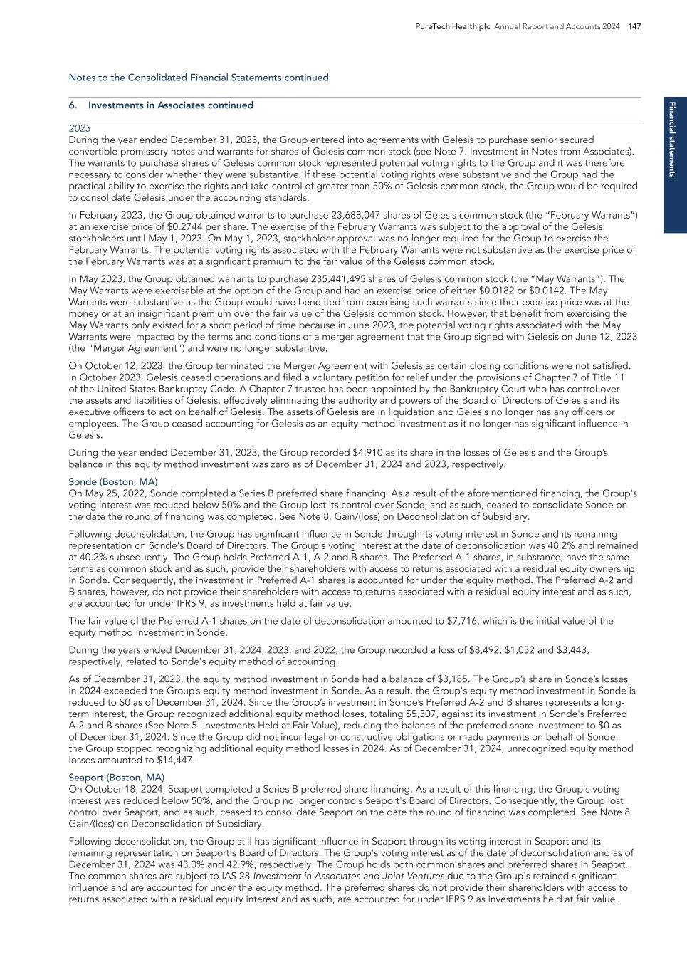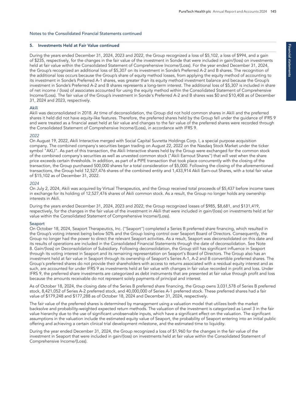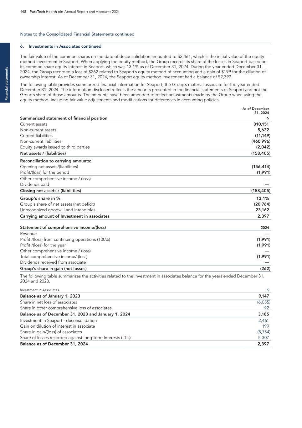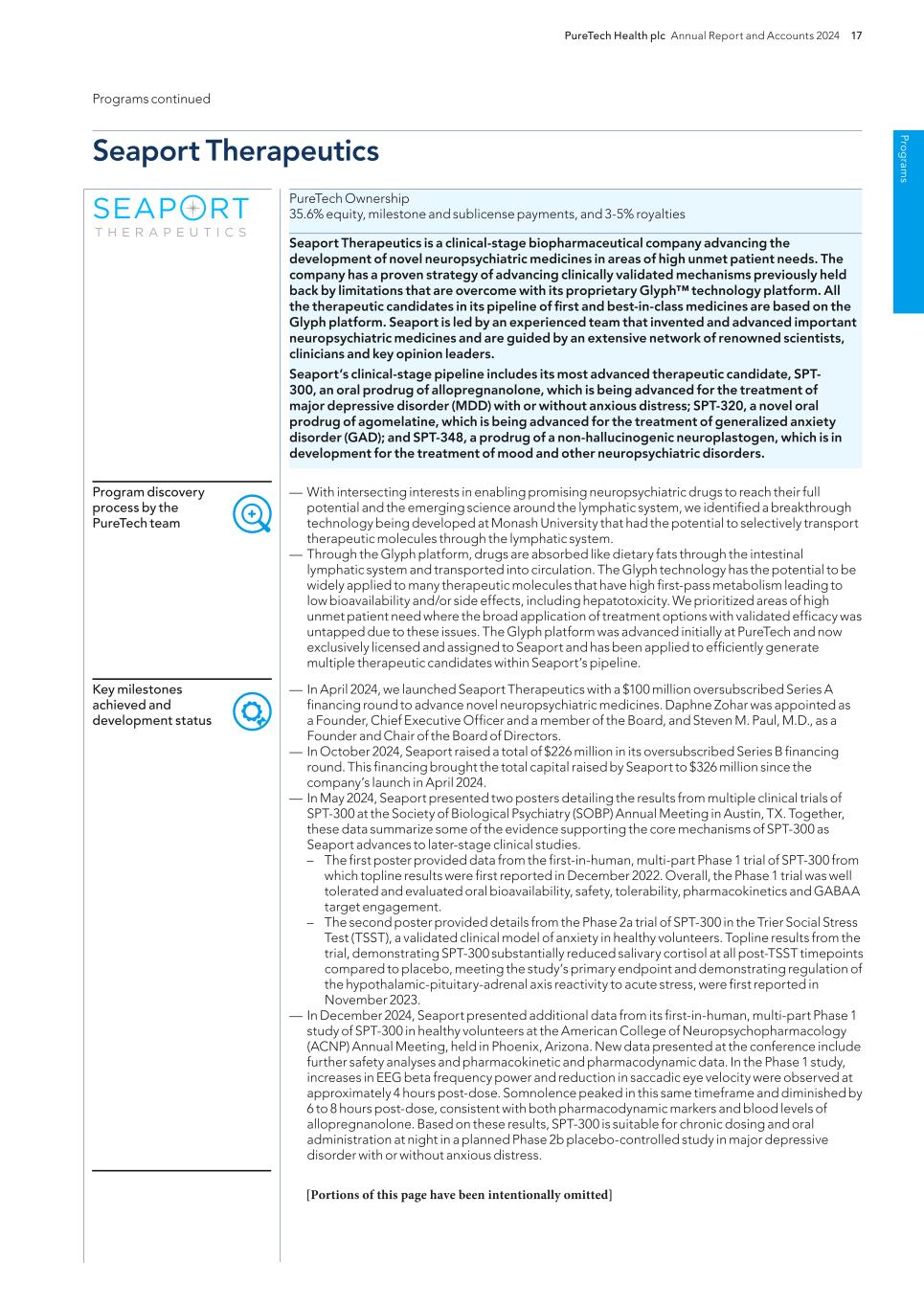 F-8 Seaport Therapeutics, Inc. Notes to Consolidated Financial Statements 1. NATURE OF BUSINESS AND BASIS OF PRESENTATION Background Seaport Therapeutics, Inc., and its consolidated subsidiaries, Seaport or the Company, is a clinical-stage biopharmaceutical company advancing the development of neuropsychiatric medicines in areas of high unmet patient needs using the Company's proprietary Glyph™ Platform. The accompanying financial statements include the financial position, results of operations and comprehensive loss, changes in cash flows and stockholder's deficit for the period October 18, 2024 through December 31, 2024, or the Stub Period. In accordance with Rule 3-09 of Regulation S-X, full financial statements of significant equity investments are required to be presented in the annual report of the investor. For purposes of S-X 3-09, the investee’s separate annual financial statements should only depict the period of the fiscal year in which it was accounted for by the equity method by the investor. On October 18, 2024, the Company completed the Series B convertible preferred stock financing, or the Series B Financing. This resulted in a decrease to PureTech LYT’s fully-diluted ownership, resulting in PureTech LYT no longer maintaining a controlling interest in the Company. Accordingly, the Stub Period reflects the activities of the Company after the closing of the Series B Financing. See Note 8—Convertible Preferred Stock, for further disclosure around the issuances of the Company's convertible preferred stock. The Company is subject to risks and uncertainties common to early-stage companies in the biotechnology industry, including, but not limited to, completion of preclinical studies and clinical trials, obtaining regulatory approvals for product candidates, dependence on key personnel, protection of intellectual property, compliance with government regulations, and ability to secure capital necessary to fund operations. Product candidates currently under development by the Company will require significant additional research and development efforts, including preclinical and clinical development, and regulatory approval prior to commercialization. There can be no assurance that the Company’s research and development efforts will be successfully completed, that any product candidates developed will obtain necessary government regulatory approval or that any products, if approved, will be commercially viable. The Company operates in an environment of rapid technological innovation and substantial competition from pharmaceutical and biotechnology companies. Even if the Company’s product development efforts are successful, it is uncertain when, if ever, the Company will realize significant product revenue from product sales. The Asset Transfer and Series A Financing The Company was incorporated in April 2024 by PureTech LYT Inc., or PureTech LYT, a wholly owned subsidiary of PureTech, as the sole stockholder, and the Company issued 1,000 shares of its common stock to PureTech LYT. On April 8, 2024, or the Asset Transfer Date, the Company entered into an Asset Transfer Agreement, or the Asset Transfer, with PureTech Health LLC and PureTech LYT, pursuant to which PureTech Health LLC and PureTech LYT, agreed to contribute, convey, assign, transfer and deliver to the Company all of its right, title and interest in, to and under the assets related to its Glyph Technology and Products. As consideration, the Company issued to PureTech LYT, 40,000,000 shares of its Series A-1 convertible preferred stock and 949,000 shares of its common stock on the Asset Transfer Date, and also agreed to contingent payments to PureTech upon successful development and commercialization of products developed using the Glyph technology platform, or each Seaport Glyph Product, including; (i) low single digit tiered royalties; (ii) milestone payments up to $15.0 million upon achievement of specified milestones; and (iii) a percentage of net income generated by the Company from third parties on any products licensed under agreements which were transferred as part of the Asset Transfer Agreement. The Company determined that the Asset Transfer and related spin-off transaction represented the transfer of a business between entities under common control. As a result, the net liabilities were transferred from PureTech to the Company at PureTech’s carrying amounts on the Asset Transfer Date and the Company ascribed a nil value to the convertible preferred stock and common stock issued to PureTech Health LLC and PureTech LYT. Concurrently, upon entry into the Asset Transfer, the Company entered into a stock purchase agreement with PureTech LYT and other third-party investors, pursuant to which the Company issued and sold shares of its Series A-2 convertible preferred stock, or the Series A Financing, and together with the Asset Transfer, the Transaction. See Note 8—Convertible Preferred Stock, for further details. PureTech continues to provide various research and development and corporate services under the transition services agreement, or TSA, which was initially set to terminate one year following the date of the Asset Transfer Agreement. In March 2025 the Company extended the TSA for an additional six months. The company may incur additional operating expenses for these services once the TSA expires.