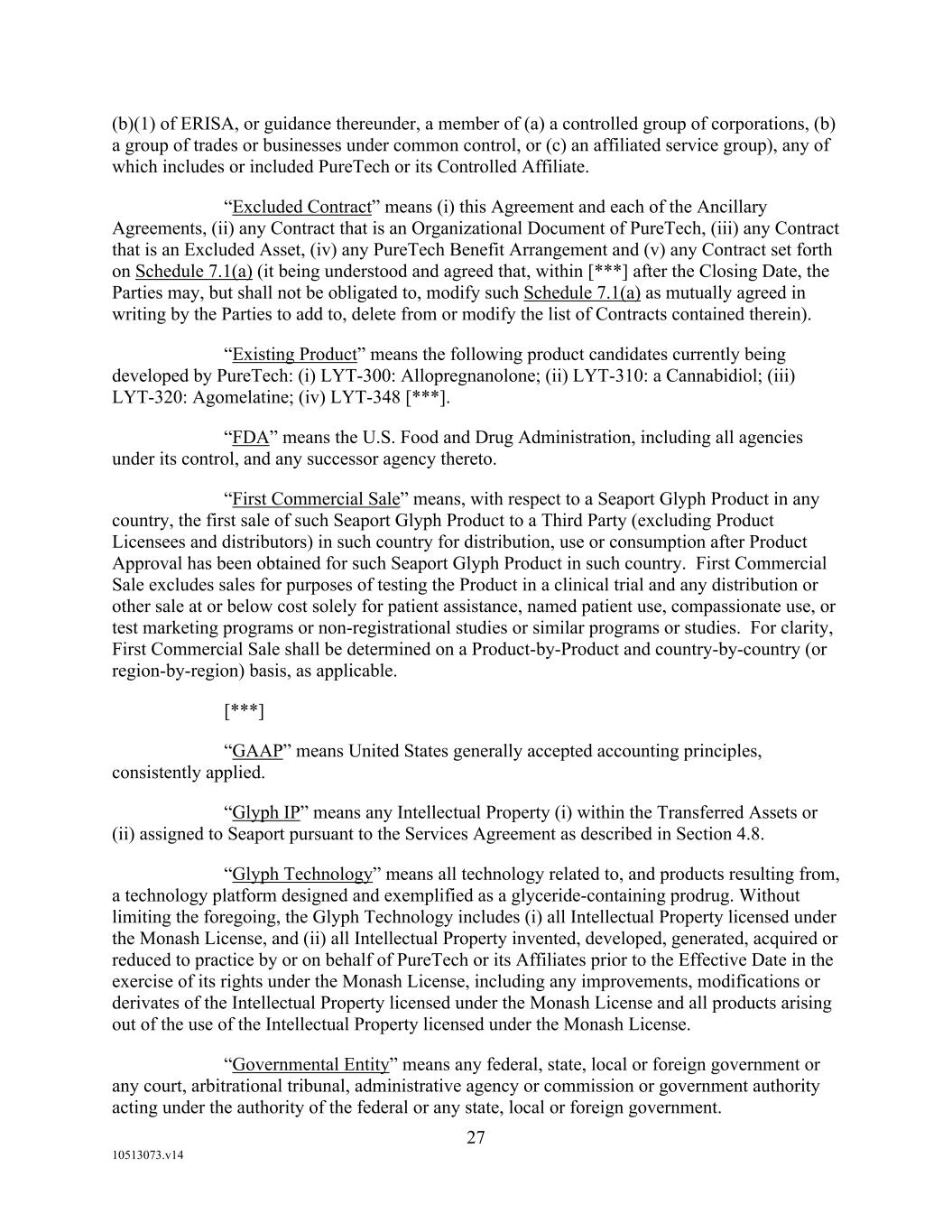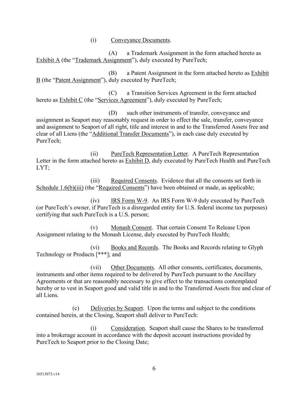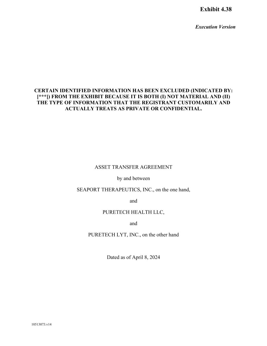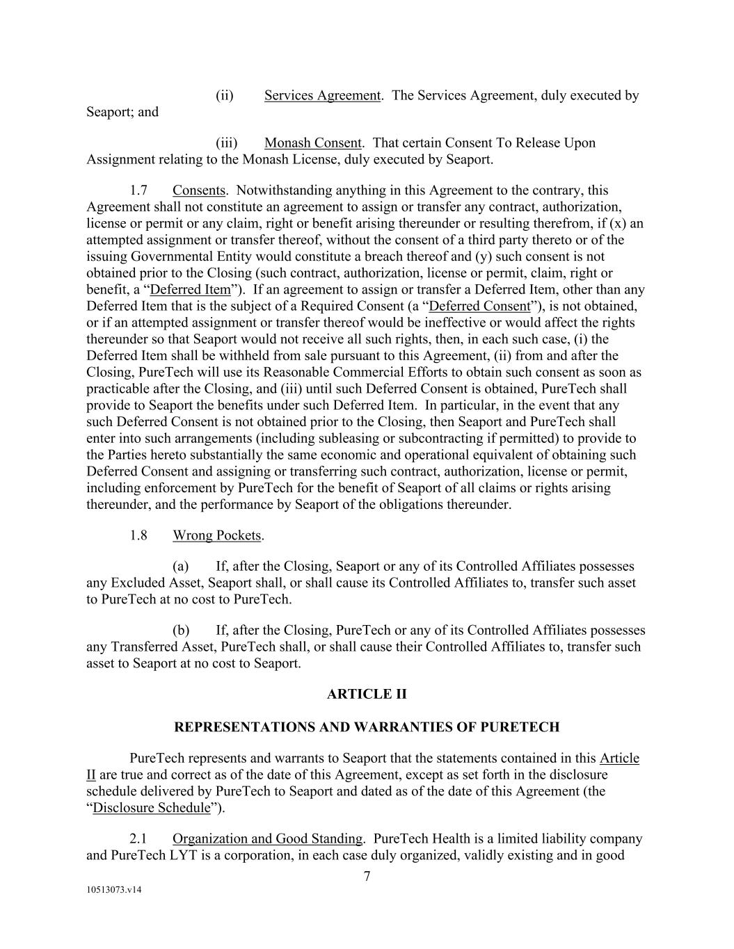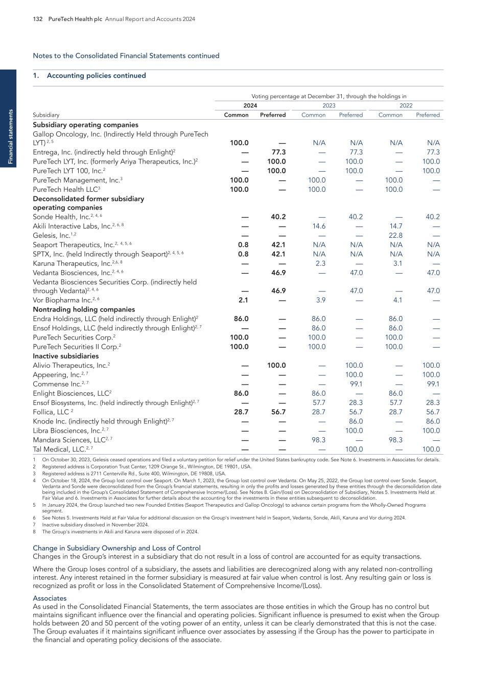 F-8 Seaport Therapeutics, Inc. Notes to Consolidated Financial Statements 1. NATURE OF BUSINESS AND BASIS OF PRESENTATION Background Seaport Therapeutics, Inc., and its consolidated subsidiaries, Seaport or the Company, is a clinical-stage biopharmaceutical company advancing the development of neuropsychiatric medicines in areas of high unmet patient needs using the Company's proprietary Glyph™ Platform. The accompanying financial statements include the financial position, results of operations and comprehensive loss, changes in cash flows and stockholder's deficit for the period October 18, 2024 through December 31, 2024, or the Stub Period. In accordance with Rule 3-09 of Regulation S-X, full financial statements of significant equity investments are required to be presented in the annual report of the investor. For purposes of S-X 3-09, the investee’s separate annual financial statements should only depict the period of the fiscal year in which it was accounted for by the equity method by the investor. On October 18, 2024, the Company completed the Series B convertible preferred stock financing, or the Series B Financing. This resulted in a decrease to PureTech LYT’s fully-diluted ownership, resulting in PureTech LYT no longer maintaining a controlling interest in the Company. Accordingly, the Stub Period reflects the activities of the Company after the closing of the Series B Financing. See Note 8—Convertible Preferred Stock, for further disclosure around the issuances of the Company's convertible preferred stock. The Company is subject to risks and uncertainties common to early-stage companies in the biotechnology industry, including, but not limited to, completion of preclinical studies and clinical trials, obtaining regulatory approvals for product candidates, dependence on key personnel, protection of intellectual property, compliance with government regulations, and ability to secure capital necessary to fund operations. Product candidates currently under development by the Company will require significant additional research and development efforts, including preclinical and clinical development, and regulatory approval prior to commercialization. There can be no assurance that the Company’s research and development efforts will be successfully completed, that any product candidates developed will obtain necessary government regulatory approval or that any products, if approved, will be commercially viable. The Company operates in an environment of rapid technological innovation and substantial competition from pharmaceutical and biotechnology companies. Even if the Company’s product development efforts are successful, it is uncertain when, if ever, the Company will realize significant product revenue from product sales. The Asset Transfer and Series A Financing The Company was incorporated in April 2024 by PureTech LYT Inc., or PureTech LYT, a wholly owned subsidiary of PureTech, as the sole stockholder, and the Company issued 1,000 shares of its common stock to PureTech LYT. On April 8, 2024, or the Asset Transfer Date, the Company entered into an Asset Transfer Agreement, or the Asset Transfer, with PureTech Health LLC and PureTech LYT, pursuant to which PureTech Health LLC and PureTech LYT, agreed to contribute, convey, assign, transfer and deliver to the Company all of its right, title and interest in, to and under the assets related to its Glyph Technology and Products. As consideration, the Company issued to PureTech LYT, 40,000,000 shares of its Series A-1 convertible preferred stock and 949,000 shares of its common stock on the Asset Transfer Date, and also agreed to contingent payments to PureTech upon successful development and commercialization of products developed using the Glyph technology platform, or each Seaport Glyph Product, including; (i) low single digit tiered royalties; (ii) milestone payments up to $15.0 million upon achievement of specified milestones; and (iii) a percentage of net income generated by the Company from third parties on any products licensed under agreements which were transferred as part of the Asset Transfer Agreement. The Company determined that the Asset Transfer and related spin-off transaction represented the transfer of a business between entities under common control. As a result, the net liabilities were transferred from PureTech to the Company at PureTech’s carrying amounts on the Asset Transfer Date and the Company ascribed a nil value to the convertible preferred stock and common stock issued to PureTech Health LLC and PureTech LYT. Concurrently, upon entry into the Asset Transfer, the Company entered into a stock purchase agreement with PureTech LYT and other third-party investors, pursuant to which the Company issued and sold shares of its Series A-2 convertible preferred stock, or the Series A Financing, and together with the Asset Transfer, the Transaction. See Note 8—Convertible Preferred Stock, for further details. PureTech continues to provide various research and development and corporate services under the transition services agreement, or TSA, which was initially set to terminate one year following the date of the Asset Transfer Agreement. In March 2025 the Company extended the TSA for an additional six months. The company may incur additional operating expenses for these services once the TSA expires.