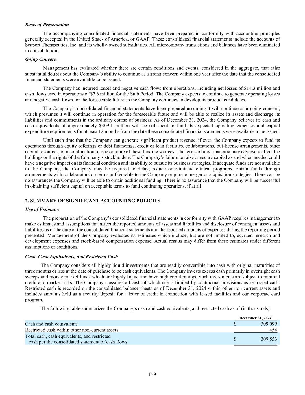F-9 Basis of Presentation The accompanying consolidated financial statements have been prepared in conformity with accounting principles generally accepted in the United States of America, or GAAP. These consolidated financial statements include the accounts of Seaport Therapeutics, Inc. and its wholly-owned subsidiaries. All intercompany transactions and balances have been eliminated in consolidation. Going Concern Management has evaluated whether there are certain conditions and events, considered in the aggregate, that raise substantial doubt about the Company’s ability to continue as a going concern within one year after the date that the consolidated financial statements were available to be issued. The Company has incurred losses and negative cash flows from operations, including net losses of $14.3 million and cash flows used in operations of $7.6 million for the Stub Period. The Company expects to continue to generate operating losses and negative cash flows for the foreseeable future as the Company continues to develop its product candidates. The Company’s consolidated financial statements have been prepared assuming it will continue as a going concern, which presumes it will continue in operation for the foreseeable future and will be able to realize its assets and discharge its liabilities and commitments in the ordinary course of business. As of December 31, 2024, the Company believes its cash and cash equivalents of approximately $309.1 million will be sufficient to fund its expected operating expenses and capital expenditure requirements for at least 12 months from the date these consolidated financial statements were available to be issued. Until such time that the Company can generate significant product revenue, if ever, the Company expects to fund its operations through equity offerings or debt financings, credit or loan facilities, collaborations, out-license arrangements, other capital resources, or a combination of one or more of these funding sources. The terms of any financing may adversely affect the holdings or the rights of the Company’s stockholders. The Company’s failure to raise or secure capital as and when needed could have a negative impact on its financial condition and its ability to pursue its business strategies. If adequate funds are not available to the Company, the Company may be required to delay, reduce or eliminate clinical programs, obtain funds through arrangements with collaborators on terms unfavorable to the Company or pursue merger or acquisition strategies. There can be no assurances the Company will be able to obtain additional funding. There is no assurance that the Company will be successful in obtaining sufficient capital on acceptable terms to fund continuing operations, if at all. 2. SUMMARY OF SIGNIFICANT ACCOUNTING POLICIES Use of Estimates The preparation of the Company’s consolidated financial statements in conformity with GAAP requires management to make estimates and assumptions that affect the reported amounts of assets and liabilities and disclosure of contingent assets and liabilities as of the date of the consolidated financial statements and the reported amounts of expenses during the reporting period presented. Management of the Company evaluates its estimates which include, but are not limited to, accrued research and development expenses and stock-based compensation expense. Actual results may differ from these estimates under different assumptions or conditions. Cash, Cash Equivalents, and Restricted Cash The Company considers all highly liquid investments that are readily convertible into cash with original maturities of three months or less at the date of purchase to be cash equivalents. The Company invests excess cash primarily in overnight cash sweeps and money market funds which are highly liquid and have high credit ratings. Such investments are subject to minimal credit and market risks. The Company classifies all cash of which use is limited by contractual provisions as restricted cash. Restricted cash is recorded on the consolidated balance sheets as of December 31, 2024 within other non-current assets and includes amounts held as a security deposit for a letter of credit in connection with leased facilities and our corporate card program. The following table summarizes the Company’s cash and cash equivalents, and restricted cash as of (in thousands): December 31, 2024 Cash and cash equivalents $ 309,099 Restricted cash within other non-current assets 454 Total cash, cash equivalents, and restricted cash per the consolidated statement of cash flows $ 309,553