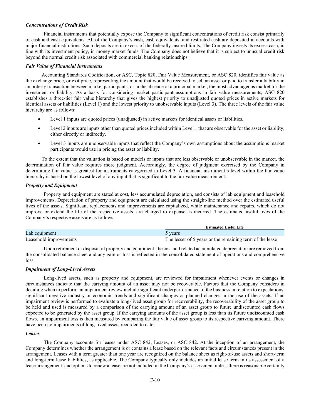 F-10 Concentrations of Credit Risk Financial instruments that potentially expose the Company to significant concentrations of credit risk consist primarily of cash and cash equivalents. All of the Company’s cash, cash equivalents, and restricted cash are deposited in accounts with major financial institutions. Such deposits are in excess of the federally insured limits. The Company invests its excess cash, in line with its investment policy, in money market funds. The Company does not believe that it is subject to unusual credit risk beyond the normal credit risk associated with commercial banking relationships. Fair Value of Financial Instruments Accounting Standards Codification, or ASC, Topic 820, Fair Value Measurement, or ASC 820, identifies fair value as the exchange price, or exit price, representing the amount that would be received to sell an asset or paid to transfer a liability in an orderly transaction between market participants, or in the absence of a principal market, the most advantageous market for the investment or liability. As a basis for considering market participant assumptions in fair value measurements, ASC 820 establishes a three-tier fair value hierarchy that gives the highest priority to unadjusted quoted prices in active markets for identical assets or liabilities (Level 1) and the lowest priority to unobservable inputs (Level 3). The three levels of the fair value hierarchy are as follows: • Level 1 inputs are quoted prices (unadjusted) in active markets for identical assets or liabilities. • Level 2 inputs are inputs other than quoted prices included within Level 1 that are observable for the asset or liability, either directly or indirectly. • Level 3 inputs are unobservable inputs that reflect the Company’s own assumptions about the assumptions market participants would use in pricing the asset or liability. To the extent that the valuation is based on models or inputs that are less observable or unobservable in the market, the determination of fair value requires more judgment. Accordingly, the degree of judgment exercised by the Company in determining fair value is greatest for instruments categorized in Level 3. A financial instrument’s level within the fair value hierarchy is based on the lowest level of any input that is significant to the fair value measurement. Property and Equipment Property and equipment are stated at cost, less accumulated depreciation, and consists of lab equipment and leasehold improvements. Depreciation of property and equipment are calculated using the straight-line method over the estimated useful lives of the assets. Significant replacements and improvements are capitalized, while maintenance and repairs, which do not improve or extend the life of the respective assets, are charged to expense as incurred. The estimated useful lives of the Company’s respective assets are as follows: Estimated Useful Life Lab equipment 5 years Leasehold improvements The lesser of 5 years or the remaining term of the lease Upon retirement or disposal of property and equipment, the cost and related accumulated depreciation are removed from the consolidated balance sheet and any gain or loss is reflected in the consolidated statement of operations and comprehensive loss. Impairment of Long-Lived Assets Long-lived assets, such as property and equipment, are reviewed for impairment whenever events or changes in circumstances indicate that the carrying amount of an asset may not be recoverable. Factors that the Company considers in deciding when to perform an impairment review include significant underperformance of the business in relation to expectations, significant negative industry or economic trends and significant changes or planned changes in the use of the assets. If an impairment review is performed to evaluate a long-lived asset group for recoverability, the recoverability of the asset group to be held and used is measured by a comparison of the carrying amount of an asset group to future undiscounted cash flows expected to be generated by the asset group. If the carrying amounts of the asset group is less than its future undiscounted cash flows, an impairment loss is then measured by comparing the fair value of asset group to its respective carrying amount. There have been no impairments of long-lived assets recorded to date. Leases The Company accounts for leases under ASC 842, Leases, or ASC 842. At the inception of an arrangement, the Company determines whether the arrangement is or contains a lease based on the relevant facts and circumstances present in the arrangement. Leases with a term greater than one year are recognized on the balance sheet as right-of-use assets and short-term and long-term lease liabilities, as applicable. The Company typically only includes an initial lease term in its assessment of a lease arrangement, and options to renew a lease are not included in the Company’s assessment unless there is reasonable certainty