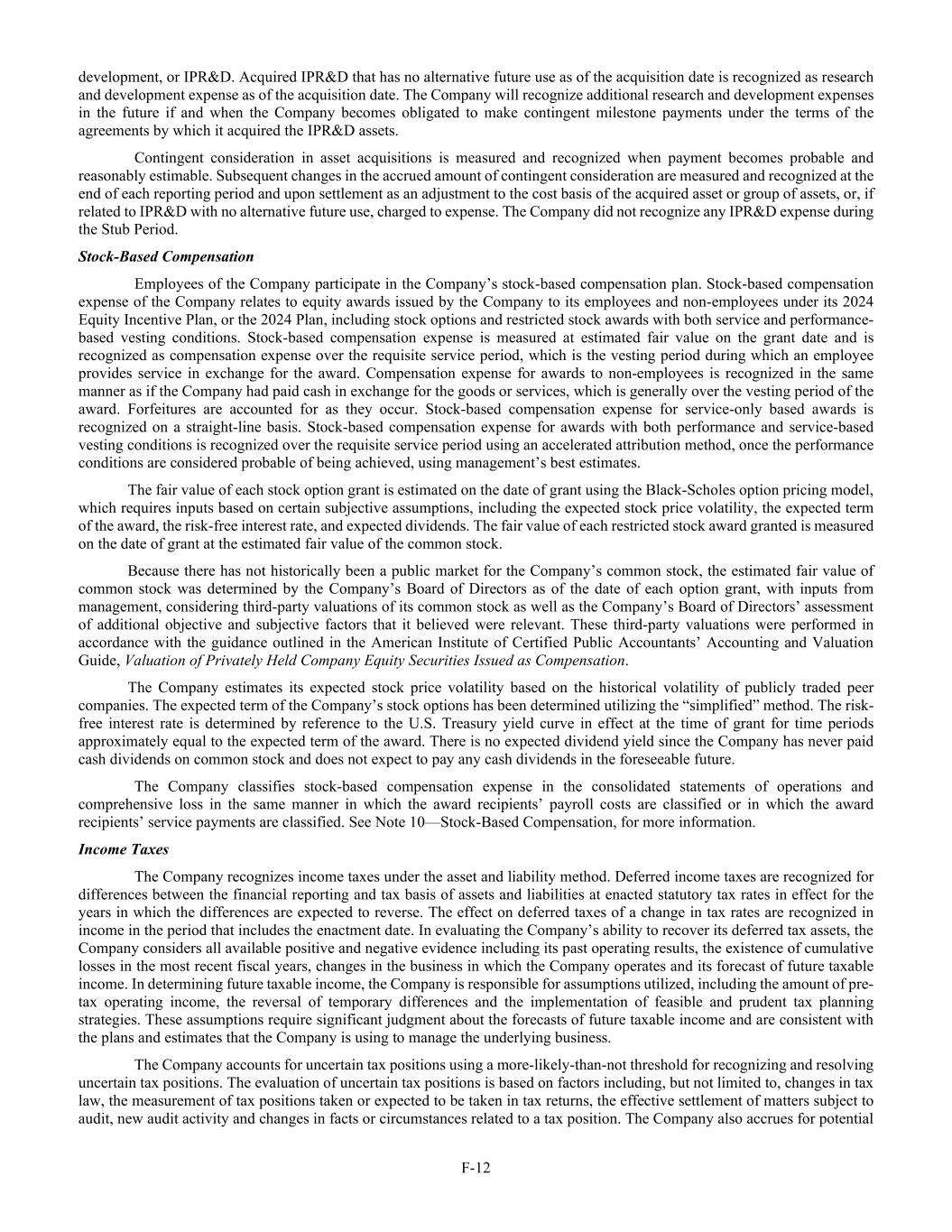 F-12 development, or IPR&D. Acquired IPR&D that has no alternative future use as of the acquisition date is recognized as research and development expense as of the acquisition date. The Company will recognize additional research and development expenses in the future if and when the Company becomes obligated to make contingent milestone payments under the terms of the agreements by which it acquired the IPR&D assets. Contingent consideration in asset acquisitions is measured and recognized when payment becomes probable and reasonably estimable. Subsequent changes in the accrued amount of contingent consideration are measured and recognized at the end of each reporting period and upon settlement as an adjustment to the cost basis of the acquired asset or group of assets, or, if related to IPR&D with no alternative future use, charged to expense. The Company did not recognize any IPR&D expense during the Stub Period. Stock-Based Compensation Employees of the Company participate in the Company’s stock-based compensation plan. Stock-based compensation expense of the Company relates to equity awards issued by the Company to its employees and non-employees under its 2024 Equity Incentive Plan, or the 2024 Plan, including stock options and restricted stock awards with both service and performance- based vesting conditions. Stock-based compensation expense is measured at estimated fair value on the grant date and is recognized as compensation expense over the requisite service period, which is the vesting period during which an employee provides service in exchange for the award. Compensation expense for awards to non-employees is recognized in the same manner as if the Company had paid cash in exchange for the goods or services, which is generally over the vesting period of the award. Forfeitures are accounted for as they occur. Stock-based compensation expense for service-only based awards is recognized on a straight-line basis. Stock-based compensation expense for awards with both performance and service-based vesting conditions is recognized over the requisite service period using an accelerated attribution method, once the performance conditions are considered probable of being achieved, using management’s best estimates. The fair value of each stock option grant is estimated on the date of grant using the Black-Scholes option pricing model, which requires inputs based on certain subjective assumptions, including the expected stock price volatility, the expected term of the award, the risk-free interest rate, and expected dividends. The fair value of each restricted stock award granted is measured on the date of grant at the estimated fair value of the common stock. Because there has not historically been a public market for the Company’s common stock, the estimated fair value of common stock was determined by the Company’s Board of Directors as of the date of each option grant, with inputs from management, considering third-party valuations of its common stock as well as the Company’s Board of Directors’ assessment of additional objective and subjective factors that it believed were relevant. These third-party valuations were performed in accordance with the guidance outlined in the American Institute of Certified Public Accountants’ Accounting and Valuation Guide, Valuation of Privately Held Company Equity Securities Issued as Compensation. The Company estimates its expected stock price volatility based on the historical volatility of publicly traded peer companies. The expected term of the Company’s stock options has been determined utilizing the “simplified” method. The risk- free interest rate is determined by reference to the U.S. Treasury yield curve in effect at the time of grant for time periods approximately equal to the expected term of the award. There is no expected dividend yield since the Company has never paid cash dividends on common stock and does not expect to pay any cash dividends in the foreseeable future. The Company classifies stock-based compensation expense in the consolidated statements of operations and comprehensive loss in the same manner in which the award recipients’ payroll costs are classified or in which the award recipients’ service payments are classified. See Note 10—Stock-Based Compensation, for more information. Income Taxes The Company recognizes income taxes under the asset and liability method. Deferred income taxes are recognized for differences between the financial reporting and tax basis of assets and liabilities at enacted statutory tax rates in effect for the years in which the differences are expected to reverse. The effect on deferred taxes of a change in tax rates are recognized in income in the period that includes the enactment date. In evaluating the Company’s ability to recover its deferred tax assets, the Company considers all available positive and negative evidence including its past operating results, the existence of cumulative losses in the most recent fiscal years, changes in the business in which the Company operates and its forecast of future taxable income. In determining future taxable income, the Company is responsible for assumptions utilized, including the amount of pre- tax operating income, the reversal of temporary differences and the implementation of feasible and prudent tax planning strategies. These assumptions require significant judgment about the forecasts of future taxable income and are consistent with the plans and estimates that the Company is using to manage the underlying business. The Company accounts for uncertain tax positions using a more-likely-than-not threshold for recognizing and resolving uncertain tax positions. The evaluation of uncertain tax positions is based on factors including, but not limited to, changes in tax law, the measurement of tax positions taken or expected to be taken in tax returns, the effective settlement of matters subject to audit, new audit acti