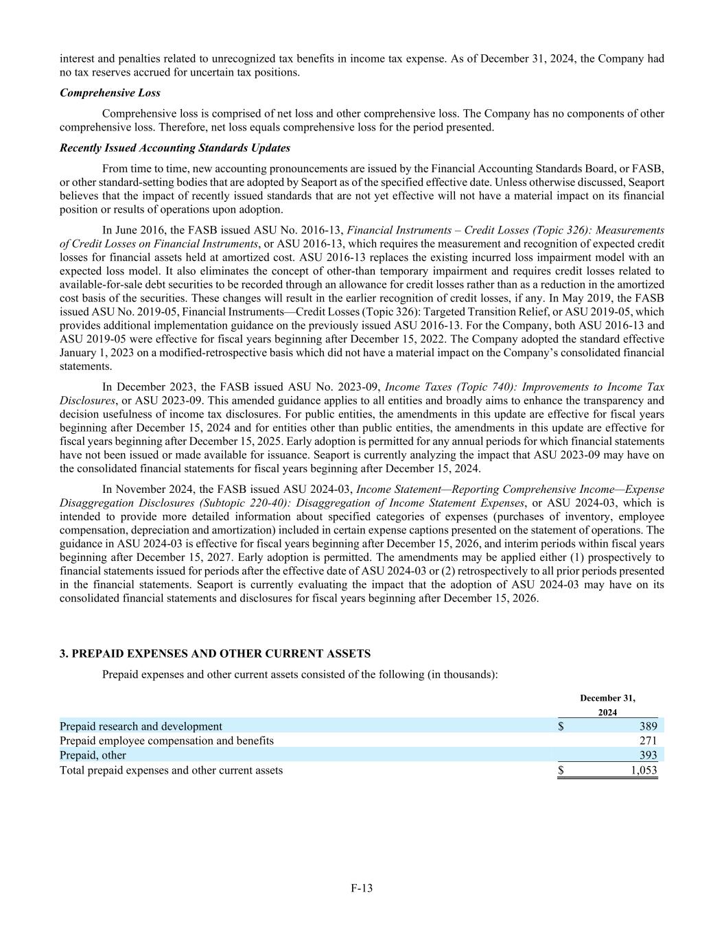 F-13 interest and penalties related to unrecognized tax benefits in income tax expense. As of December 31, 2024, the Company had no tax reserves accrued for uncertain tax positions. Comprehensive Loss Comprehensive loss is comprised of net loss and other comprehensive loss. The Company has no components of other comprehensive loss. Therefore, net loss equals comprehensive loss for the period presented. Recently Issued Accounting Standards Updates From time to time, new accounting pronouncements are issued by the Financial Accounting Standards Board, or FASB, or other standard-setting bodies that are adopted by Seaport as of the specified effective date. Unless otherwise discussed, Seaport believes that the impact of recently issued standards that are not yet effective will not have a material impact on its financial position or results of operations upon adoption. In June 2016, the FASB issued ASU No. 2016-13, Financial Instruments – Credit Losses (Topic 326): Measurements of Credit Losses on Financial Instruments, or ASU 2016-13, which requires the measurement and recognition of expected credit losses for financial assets held at amortized cost. ASU 2016-13 replaces the existing incurred loss impairment model with an expected loss model. It also eliminates the concept of other-than temporary impairment and requires credit losses related to available-for-sale debt securities to be recorded through an allowance for credit losses rather than as a reduction in the amortized cost basis of the securities. These changes will result in the earlier recognition of credit losses, if any. In May 2019, the FASB issued ASU No. 2019-05, Financial Instruments—Credit Losses (Topic 326): Targeted Transition Relief, or ASU 2019-05, which provides additional implementation guidance on the previously issued ASU 2016-13. For the Company, both ASU 2016-13 and ASU 2019-05 were effective for fiscal years beginning after December 15, 2022. The Company adopted the standard effective January 1, 2023 on a modified-retrospective basis which did not have a material impact on the Company’s consolidated financial statements. In December 2023, the FASB issued ASU No. 2023-09, Income Taxes (Topic 740): Improvements to Income Tax Disclosures, or ASU 2023-09. This amended guidance applies to all entities and broadly aims to enhance the transparency and decision usefulness of income tax disclosures. For public entities, the amendments in this update are effective for fiscal years beginning after December 15, 2024 and for entities other than public entities, the amendments in this update are effective for fiscal years beginning after December 15, 2025. Early adoption is permitted for any annual periods for which financial statements have not been issued or made available for issuance. Seaport is currently analyzing the impact that ASU 2023-09 may have on the consolidated financial statements for fiscal years beginning after December 15, 2024. In November 2024, the FASB issued ASU 2024-03, Income Statement—Reporting Comprehensive Income—Expense Disaggregation Disclosures (Subtopic 220-40): Disaggregation of Income Statement Expenses, or ASU 2024-03, which is intended to provide more detailed information about specified categories of expenses (purchases of inventory, employee compensation, depreciation and amortization) included in certain expense captions presented on the statement of operations. The guidance in ASU 2024-03 is effective for fiscal years beginning after December 15, 2026, and interim periods within fiscal years beginning after December 15, 2027. Early adoption is permitted. The amendments may be applied either (1) prospectively to financial statements issued for periods after the effective date of ASU 2024-03 or (2) retrospectively to all prior periods presented in the financial statements. Seaport is currently evaluating the impact that the adoption of ASU 2024-03 may have on its consolidated financial statements and disclosures for fiscal years beginning after December 15, 2026. 3. PREPAID EXPENSES AND OTHER CURRENT ASSETS Prepaid expenses and other current assets consisted of the following (in thousands): December 31, 2024 Prepaid research and development $ 389 Prepaid employee compensation and benefits 271 Prepaid, other 393 Total prepaid expenses and other current assets $ 1,053