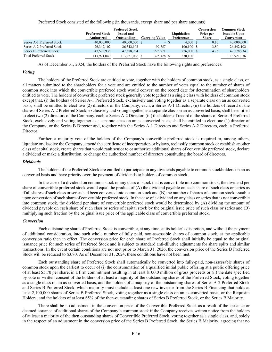 F-16 Preferred Stock consisted of the following (in thousands, except share and per share amounts): Preferred Stock Authorized Preferred Stock Issued and Outstanding Carrying Value Liquidation Preference Conversion Price per Share Common Stock Issuable Upon Conversion Series A-1 Preferred Stock 40,000,000 40,000,000 $ - $ 4,000 $ 0.10 40,000,000 Series A-2 Preferred Stock 26,342,102 26,342,102 99,757 100,100 $ 3.80 26,342,102 Series B Preferred Stock 47,578,938 47,578,934 225,571 226,000 $ 4.75 47,578,934 Total Preferred Stock 113,921,040 113,921,036 $ 325,328 $ 330,100 113,921,036 As of December 31, 2024, the holders of the Preferred Stock have the following rights and preferences: Voting The holders of the Preferred Stock are entitled to vote, together with the holders of common stock, as a single class, on all matters submitted to the shareholders for a vote and are entitled to the number of votes equal to the number of shares of common stock into which the convertible preferred stock would convert on the record date for determination of shareholders entitled to vote. The holders of convertible preferred stock generally vote together as a single class with holders of common stock except that, (i) the holders of Series A-1 Preferred Stock, exclusively and voting together as a separate class on an as converted basis, shall be entitled to elect two (2) directors of the Company, each, a Series A-1 Director, (ii) the holders of record of the shares of Series A-2 Preferred Stock, exclusively and voting together as a separate class on an as converted basis, shall be entitled to elect two (2) directors of the Company, each, a Series A-2 Director, (iii) the holders of record of the shares of Series B Preferred Stock, exclusively and voting together as a separate class on an as converted basis, shall be entitled to elect one (1) director of the Company, or the Series B Director and, together with the Series A-1 Directors and Series A-2 Directors, each, a Preferred Director. Further, a majority vote of the holders of the Company's convertible preferred stock is required to, among others, liquidate or dissolve the Company, amend the certificate of incorporation or bylaws, reclassify common stock or establish another class of capital stock, create shares that would rank senior to or authorize additional shares of convertible preferred stock, declare a dividend or make a distribution, or change the authorized number of directors constituting the board of directors. Dividends The holders of the Preferred Stock are entitled to participate in any dividends payable to common stockholders on an as converted basis and have priority over the payment of dividends to holders of common stock. In the case of a dividend on common stock or any class of stock that is convertible into common stock, the dividend per share of convertible preferred stock would equal the product of (A) the dividend payable on each share of such class or series as if all shares of such class or series had been converted into common stock and (B) the number of shares of common stock issuable upon conversion of such share of convertible preferred stock. In the case of a dividend on any class or series that is not convertible into common stock, the dividend per share of convertible preferred stock would be determined by (A) dividing the amount of dividend payable on each share of such class or series of capital stock by the original issue price of such class or series and (B) multiplying such fraction by the original issue price of the applicable class of convertible preferred stock. Conversion Each outstanding share of Preferred Stock is convertible, at any time, at its holder’s discretion, and without the payment of additional consideration, into such whole number of fully paid, non-assessable shares of common stock, at the applicable conversion ratio then in effect. The conversion price for each share of Preferred Stock shall initially be equal to the original issuance price for such series of Preferred Stock and is subject to standard anti-dilutive adjustments for share splits and similar transactions. In the event certain conditions are not met prior to March 31, 2026, the conversion price of the Series B Preferred Stock will be reduced to $3.80. As of December 31, 2024, these conditions have not been met. Each outstanding share of Preferred Stock shall automatically be converted into fully-paid, non-assessable shares of common stock upon the earliest to occur of (i) the consummation of a qualified initial public offering at a public offering price of at least $5.70 per share, in a firm commitment resulting in at least $100.0 million of gross proceeds or (ii) the date specified by vote or written consent of the holders of at least a majority of the outstanding shares of the Preferred Stock, voting together as a single class on an as-converted basis, and the holders of a majority of the outstanding shares of Series A-2 Preferred Stock and Series B Preferred Stock, which majority must include at least one new investor from the Series B Financing that holds at least 2,100,000 shares of Series B Preferred Stock, voting together as a single class on an as-converted basis, or the Requisite Holders, and the holders of at least 65% of the then-outstanding shares of Series B Preferred Stock, or the Series B Majority. There shall be no adjustment in the conversion price of the Convertible Preferred Stock as a result of the issuance or deemed issuance of additional shares of the Company’s common stock if the Company receives written notice from the holders of at least a majority of the then outstanding shares of Convertible Preferred Stock, voting together as a single class, and, solely in the respect of an adjustment in the conversion price of the Series B Preferred Stock, the Series B Majority, agreeing that no