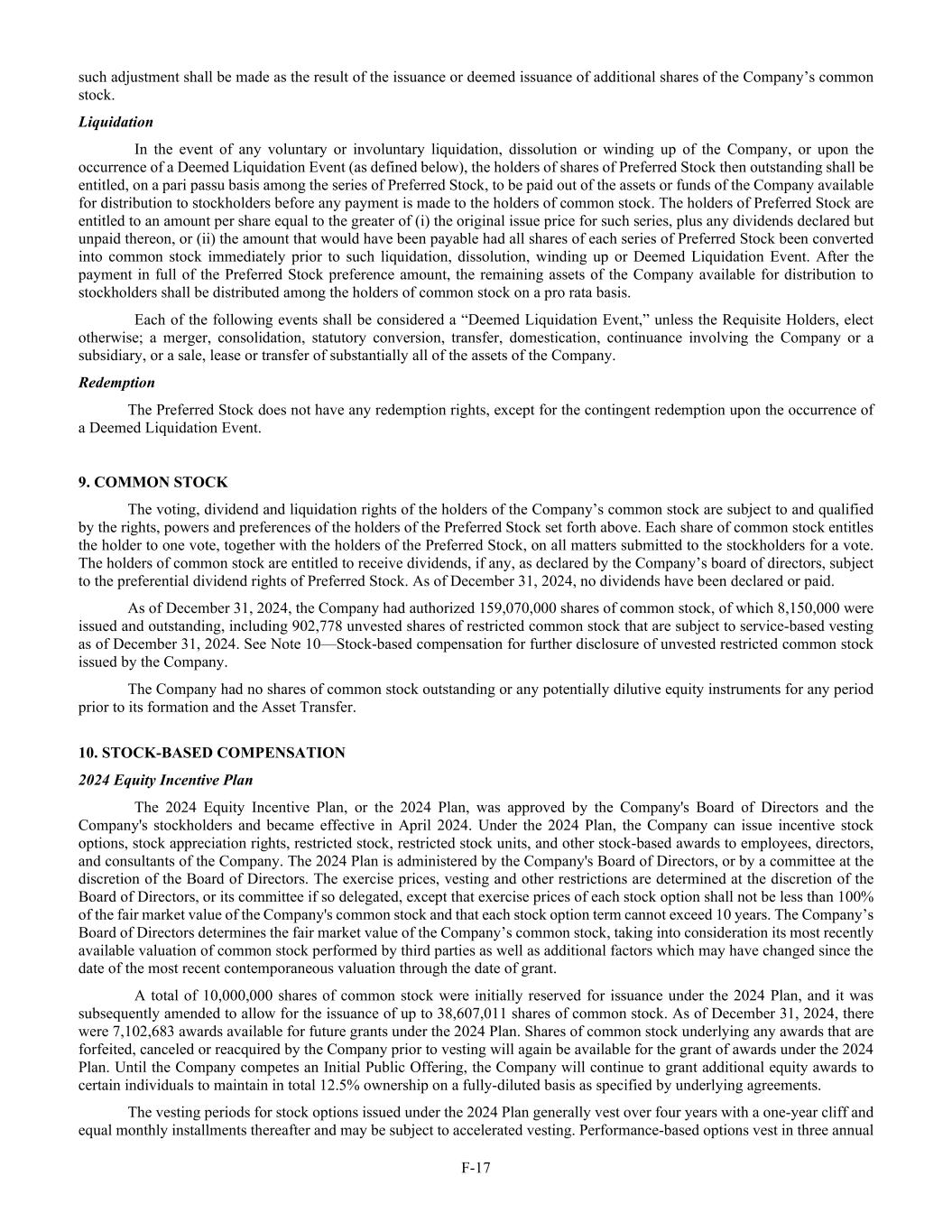 F-17 such adjustment shall be made as the result of the issuance or deemed issuance of additional shares of the Company’s common stock. Liquidation In the event of any voluntary or involuntary liquidation, dissolution or winding up of the Company, or upon the occurrence of a Deemed Liquidation Event (as defined below), the holders of shares of Preferred Stock then outstanding shall be entitled, on a pari passu basis among the series of Preferred Stock, to be paid out of the assets or funds of the Company available for distribution to stockholders before any payment is made to the holders of common stock. The holders of Preferred Stock are entitled to an amount per share equal to the greater of (i) the original issue price for such series, plus any dividends declared but unpaid thereon, or (ii) the amount that would have been payable had all shares of each series of Preferred Stock been converted into common stock immediately prior to such liquidation, dissolution, winding up or Deemed Liquidation Event. After the payment in full of the Preferred Stock preference amount, the remaining assets of the Company available for distribution to stockholders shall be distributed among the holders of common stock on a pro rata basis. Each of the following events shall be considered a “Deemed Liquidation Event,” unless the Requisite Holders, elect otherwise; a merger, consolidation, statutory conversion, transfer, domestication, continuance involving the Company or a subsidiary, or a sale, lease or transfer of substantially all of the assets of the Company. Redemption The Preferred Stock does not have any redemption rights, except for the contingent redemption upon the occurrence of a Deemed Liquidation Event. 9. COMMON STOCK The voting, dividend and liquidation rights of the holders of the Company’s common stock are subject to and qualified by the rights, powers and preferences of the holders of the Preferred Stock set forth above. Each share of common stock entitles the holder to one vote, together with the holders of the Preferred Stock, on all matters submitted to the stockholders for a vote. The holders of common stock are entitled to receive dividends, if any, as declared by the Company’s board of directors, subject to the preferential dividend rights of Preferred Stock. As of December 31, 2024, no dividends have been declared or paid. As of December 31, 2024, the Company had authorized 159,070,000 shares of common stock, of which 8,150,000 were issued and outstanding, including 902,778 unvested shares of restricted common stock that are subject to service-based vesting as of December 31, 2024. See Note 10—Stock-based compensation for further disclosure of unvested restricted common stock issued by the Company. The Company had no shares of common stock outstanding or any potentially dilutive equity instruments for any period prior to its formation and the Asset Transfer. 10. STOCK-BASED COMPENSATION 2024 Equity Incentive Plan The 2024 Equity Incentive Plan, or the 2024 Plan, was approved by the Company's Board of Directors and the Company's stockholders and became effective in April 2024. Under the 2024 Plan, the Company can issue incentive stock options, stock appreciation rights, restricted stock, restricted stock units, and other stock-based awards to employees, directors, and consultants of the Company. The 2024 Plan is administered by the Company's Board of Directors, or by a committee at the discretion of the Board of Directors. The exercise prices, vesting and other restrictions are determined at the discretion of the Board of Directors, or its committee if so delegated, except that exercise prices of each stock option shall not be less than 100% of the fair market value of the Company's common stock and that each stock option term cannot exceed 10 years. The Company’s Board of Directors determines the fair market value of the Company’s common stock, taking into consideration its most recently available valuation of common stock performed by third parties as well as additional factors which may have changed since the date of the most recent contemporaneous valuation through the date of grant. A total of 10,000,000 shares of common stock were initially reserved for issuance under the 2024 Plan, and it was subsequently amended to allow for the issuance of up to 38,607,011 shares of common stock. As of December 31, 2024, there were 7,102,683 awards available for future grants under the 2024 Plan. Shares of common stock underlying any awards that are forfeited, canceled or reacquired by the Company prior to vesting will again be available for the grant of awards under the 2024 Plan. Until the Company competes an Initial Public Offering, the Company will continue to grant additional equity awards to certain individuals to maintain in total 12.5% ownership on a fully-diluted basis as specified by underlying agreements. The vesting periods for stock options issued under the 2024 Plan generally vest over four years with a one-year cliff and equal monthly installments thereafter and may be subject to accelerated vesting. Performance-based options vest in three annual