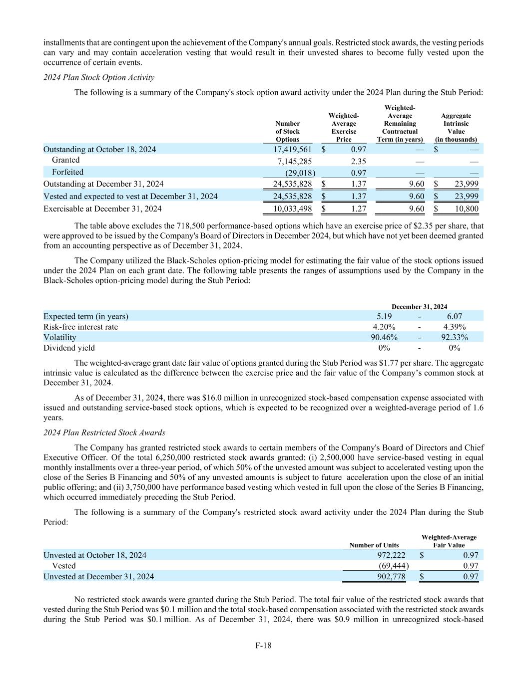 F-18 installments that are contingent upon the achievement of the Company's annual goals. Restricted stock awards, the vesting periods can vary and may contain acceleration vesting that would result in their unvested shares to become fully vested upon the occurrence of certain events. 2024 Plan Stock Option Activity The following is a summary of the Company's stock option award activity under the 2024 Plan during the Stub Period: Number of Stock Options Weighted- Average Exercise Price Weighted- Average Remaining Contractual Term (in years) Aggregate Intrinsic Value (in thousands) Outstanding at October 18, 2024 17,419,561 $ 0.97 — $ — Granted 7,145,285 2.35 — — Forfeited (29,018 ) 0.97 — — Outstanding at December 31, 2024 24,535,828 $ 1.37 9.60 $ 23,999 Vested and expected to vest at December 31, 2024 24,535,828 $ 1.37 9.60 $ 23,999 Exercisable at December 31, 2024 10,033,498 $ 1.27 9.60 $ 10,800 The table above excludes the 718,500 performance-based options which have an exercise price of $2.35 per share, that were approved to be issued by the Company's Board of Directors in December 2024, but which have not yet been deemed granted from an accounting perspective as of December 31, 2024. The Company utilized the Black-Scholes option-pricing model for estimating the fair value of the stock options issued under the 2024 Plan on each grant date. The following table presents the ranges of assumptions used by the Company in the Black-Scholes option-pricing model during the Stub Period: December 31, 2024 Expected term (in years) 5.19 - 6.07 Risk-free interest rate 4.20% - 4.39% Volatility 90.46% - 92.33% Dividend yield 0% - 0% The weighted-average grant date fair value of options granted during the Stub Period was $1.77 per share. The aggregate intrinsic value is calculated as the difference between the exercise price and the fair value of the Company’s common stock at December 31, 2024. As of December 31, 2024, there was $16.0 million in unrecognized stock-based compensation expense associated with issued and outstanding service-based stock options, which is expected to be recognized over a weighted-average period of 1.6 years. 2024 Plan Restricted Stock Awards The Company has granted restricted stock awards to certain members of the Company's Board of Directors and Chief Executive Officer. Of the total 6,250,000 restricted stock awards granted: (i) 2,500,000 have service-based vesting in equal monthly installments over a three-year period, of which 50% of the unvested amount was subject to accelerated vesting upon the close of the Series B Financing and 50% of any unvested amounts is subject to future acceleration upon the close of an initial public offering; and (ii) 3,750,000 have performance based vesting which vested in full upon the close of the Series B Financing, which occurred immediately preceding the Stub Period. The following is a summary of the Company's restricted stock award activity under the 2024 Plan during the Stub Period: Number of Units Weighted-Average Fair Value Unvested at October 18, 2024 972,222 $ 0.97 Vested (69,444 ) 0.97 Unvested at December 31, 2024 902,778 $ 0.97 No restricted stock awards were granted during the Stub Period. The total fair value of the restricted stock awards that vested during the Stub Period was $0.1 million and the total stock-based compensation associated with the restricted stock awards during the Stub Period was $0.1 million. As of December 31, 2024, there was $0.9 million in unrecognized stock-based