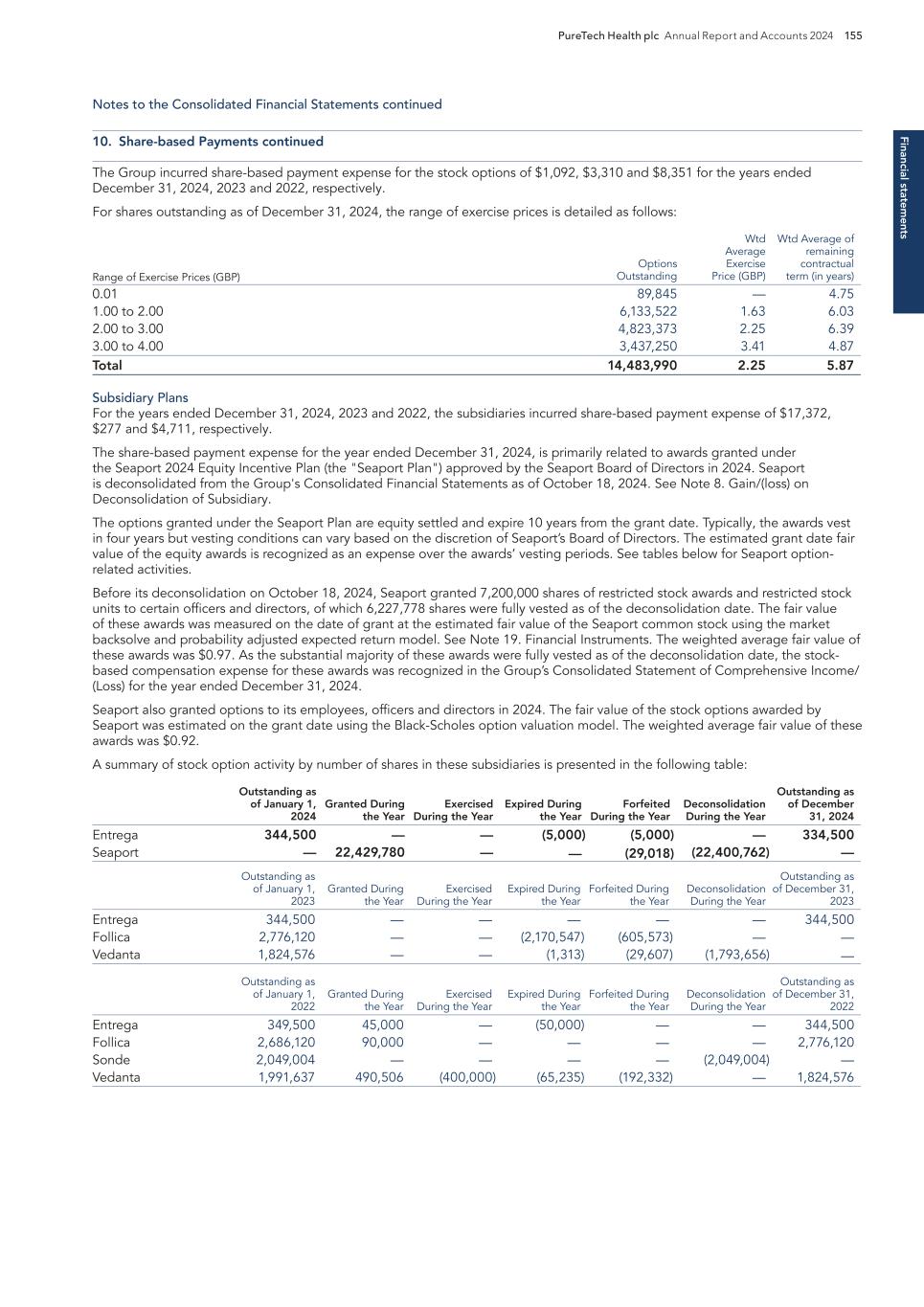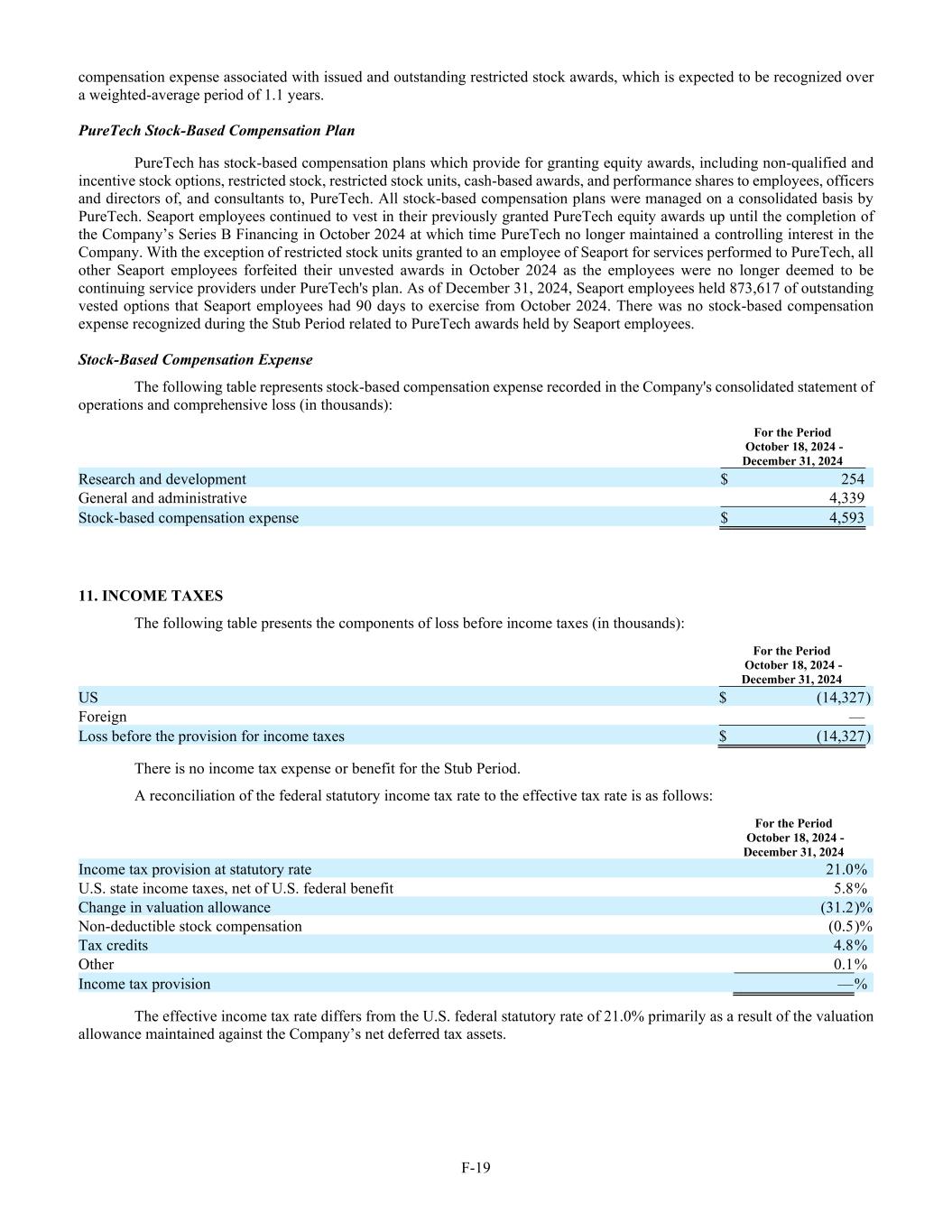 F-19 compensation expense associated with issued and outstanding restricted stock awards, which is expected to be recognized over a weighted-average period of 1.1 years. PureTech Stock-Based Compensation Plan PureTech has stock-based compensation plans which provide for granting equity awards, including non-qualified and incentive stock options, restricted stock, restricted stock units, cash-based awards, and performance shares to employees, officers and directors of, and consultants to, PureTech. All stock-based compensation plans were managed on a consolidated basis by PureTech. Seaport employees continued to vest in their previously granted PureTech equity awards up until the completion of the Company’s Series B Financing in October 2024 at which time PureTech no longer maintained a controlling interest in the Company. With the exception of restricted stock units granted to an employee of Seaport for services performed to PureTech, all other Seaport employees forfeited their unvested awards in October 2024 as the employees were no longer deemed to be continuing service providers under PureTech's plan. As of December 31, 2024, Seaport employees held 873,617 of outstanding vested options that Seaport employees had 90 days to exercise from October 2024. There was no stock-based compensation expense recognized during the Stub Period related to PureTech awards held by Seaport employees. Stock-Based Compensation Expense The following table represents stock-based compensation expense recorded in the Company's consolidated statement of operations and comprehensive loss (in thousands): For the Period October 18, 2024 - December 31, 2024 Research and development $ 254 General and administrative 4,339 Stock-based compensation expense $ 4,593 11. INCOME TAXES The following table presents the components of loss before income taxes (in thousands): For the Period October 18, 2024 - December 31, 2024 US $ (14,327 ) Foreign — Loss before the provision for income taxes $ (14,327 ) There is no income tax expense or benefit for the Stub Period. A reconciliation of the federal statutory income tax rate to the effective tax rate is as follows: For the Period October 18, 2024 - December 31, 2024 Income tax provision at statutory rate 21.0 % U.S. state income taxes, net of U.S. federal benefit 5.8 % Change in valuation allowance (31.2 )% Non-deductible stock compensation (0.5 )% Tax credits 4.8 % Other 0.1 % Income tax provision — % The effective income tax rate differs from the U.S. federal statutory rate of 21.0% primarily as a result of the valuation allowance maintained against the Company’s net deferred tax assets.
