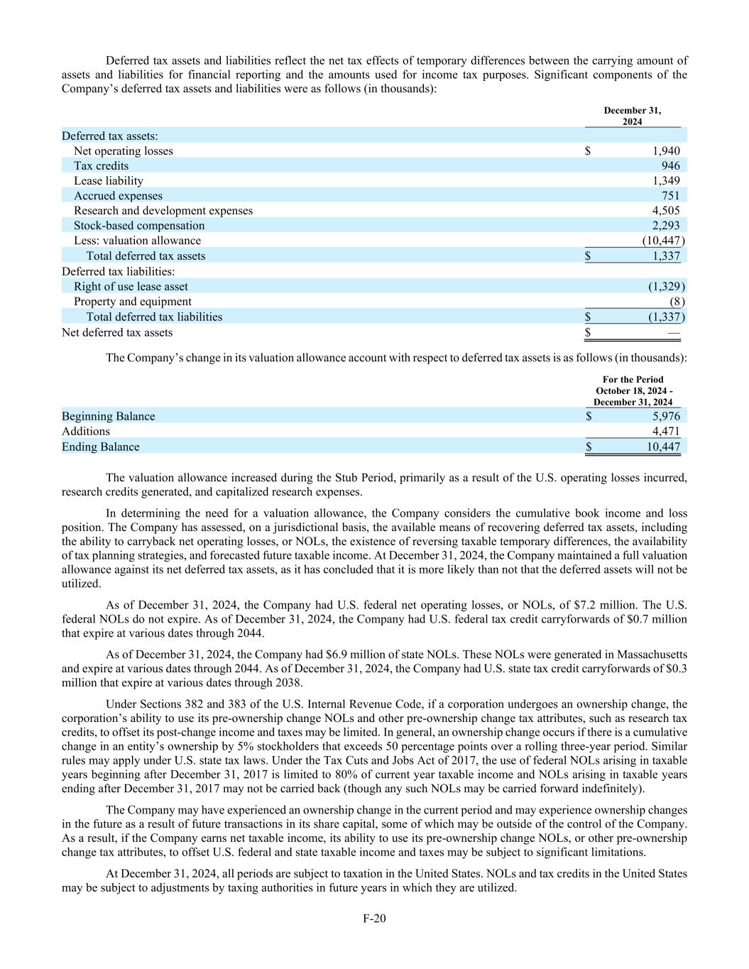 F-20 Deferred tax assets and liabilities reflect the net tax effects of temporary differences between the carrying amount of assets and liabilities for financial reporting and the amounts used for income tax purposes. Significant components of the Company’s deferred tax assets and liabilities were as follows (in thousands): December 31, 2024 Deferred tax assets: Net operating losses $ 1,940 Tax credits 946 Lease liability 1,349 Accrued expenses 751 Research and development expenses 4,505 Stock-based compensation 2,293 Less: valuation allowance (10,447 ) Total deferred tax assets $ 1,337 Deferred tax liabilities: Right of use lease asset (1,329 ) Property and equipment (8 ) Total deferred tax liabilities $ (1,337 ) Net deferred tax assets $ — The Company’s change in its valuation allowance account with respect to deferred tax assets is as follows (in thousands): For the Period October 18, 2024 - December 31, 2024 Beginning Balance $ 5,976 Additions 4,471 Ending Balance $ 10,447 The valuation allowance increased during the Stub Period, primarily as a result of the U.S. operating losses incurred, research credits generated, and capitalized research expenses. In determining the need for a valuation allowance, the Company considers the cumulative book income and loss position. The Company has assessed, on a jurisdictional basis, the available means of recovering deferred tax assets, including the ability to carryback net operating losses, or NOLs, the existence of reversing taxable temporary differences, the availability of tax planning strategies, and forecasted future taxable income. At December 31, 2024, the Company maintained a full valuation allowance against its net deferred tax assets, as it has concluded that it is more likely than not that the deferred assets will not be utilized. As of December 31, 2024, the Company had U.S. federal net operating losses, or NOLs, of $7.2 million. The U.S. federal NOLs do not expire. As of December 31, 2024, the Company had U.S. federal tax credit carryforwards of $0.7 million that expire at various dates through 2044. As of December 31, 2024, the Company had $6.9 million of state NOLs. These NOLs were generated in Massachusetts and expire at various dates through 2044. As of December 31, 2024, the Company had U.S. state tax credit carryforwards of $0.3 million that expire at various dates through 2038. Under Sections 382 and 383 of the U.S. Internal Revenue Code, if a corporation undergoes an ownership change, the corporation’s ability to use its pre-ownership change NOLs and other pre-ownership change tax attributes, such as research tax credits, to offset its post-change income and taxes may be limited. In general, an ownership change occurs if there is a cumulative change in an entity’s ownership by 5% stockholders that exceeds 50 percentage points over a rolling three-year period. Similar rules may apply under U.S. state tax laws. Under the Tax Cuts and Jobs Act of 2017, the use of federal NOLs arising in taxable years beginning after December 31, 2017 is limited to 80% of current year taxable income and NOLs arising in taxable years ending after December 31, 2017 may not be carried back (though any such NOLs may be carried forward indefinitely). The Company may have experienced an ownership change in the current period and may experience ownership changes in the future as a result of future transactions in its share capital, some of which may be outside of the control of the Company. As a result, if the Company earns net taxable income, its ability to use its pre-ownership change NOLs, or other pre-ownership change tax attributes, to offset U.S. federal and state taxable income and taxes may be subject to significant limitations. At December 31, 2024, all periods are subject to taxation in the United States. NOLs and tax credits in the United States may be subject to adjustments by taxing authorities in future years in which they are utilized.