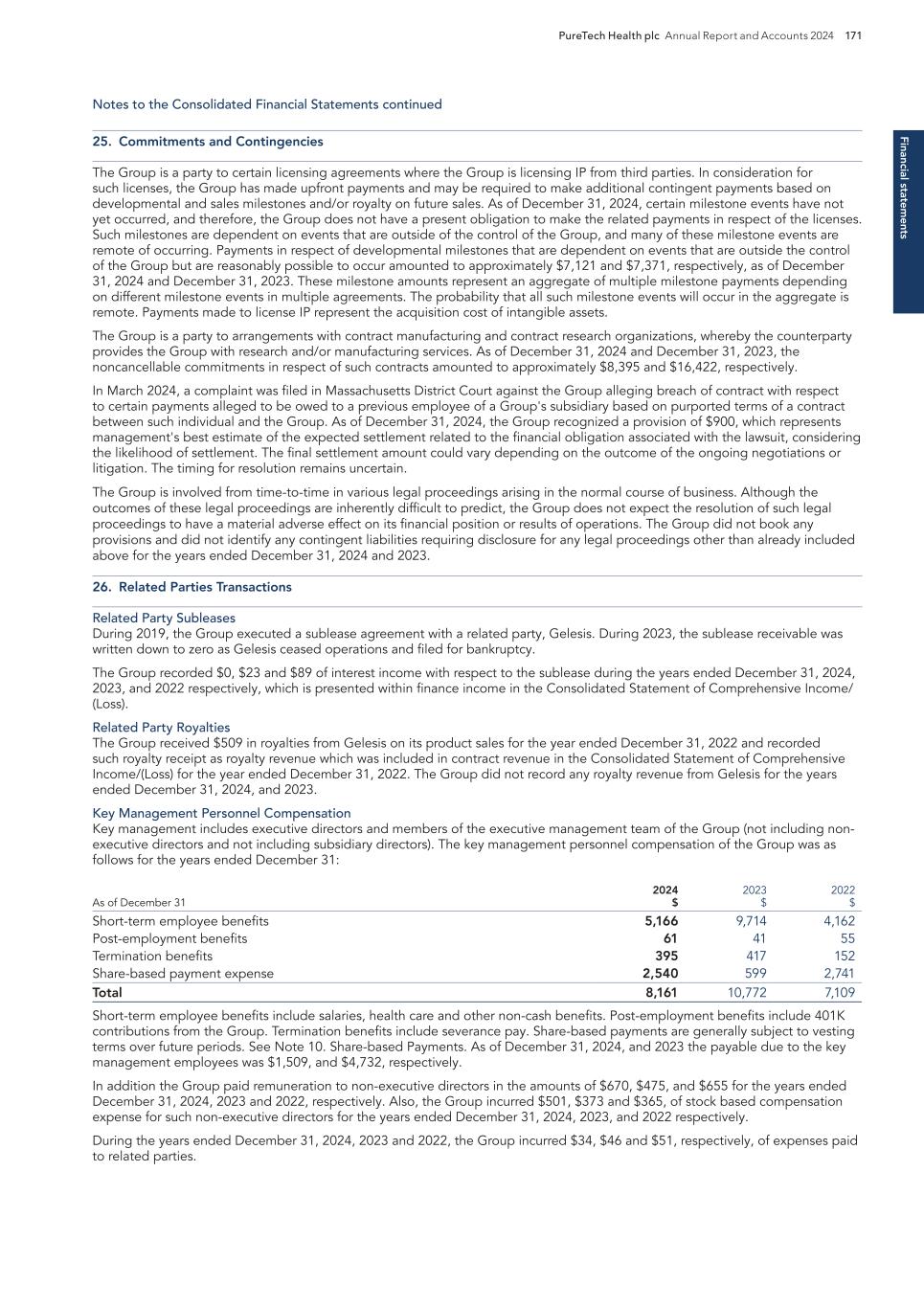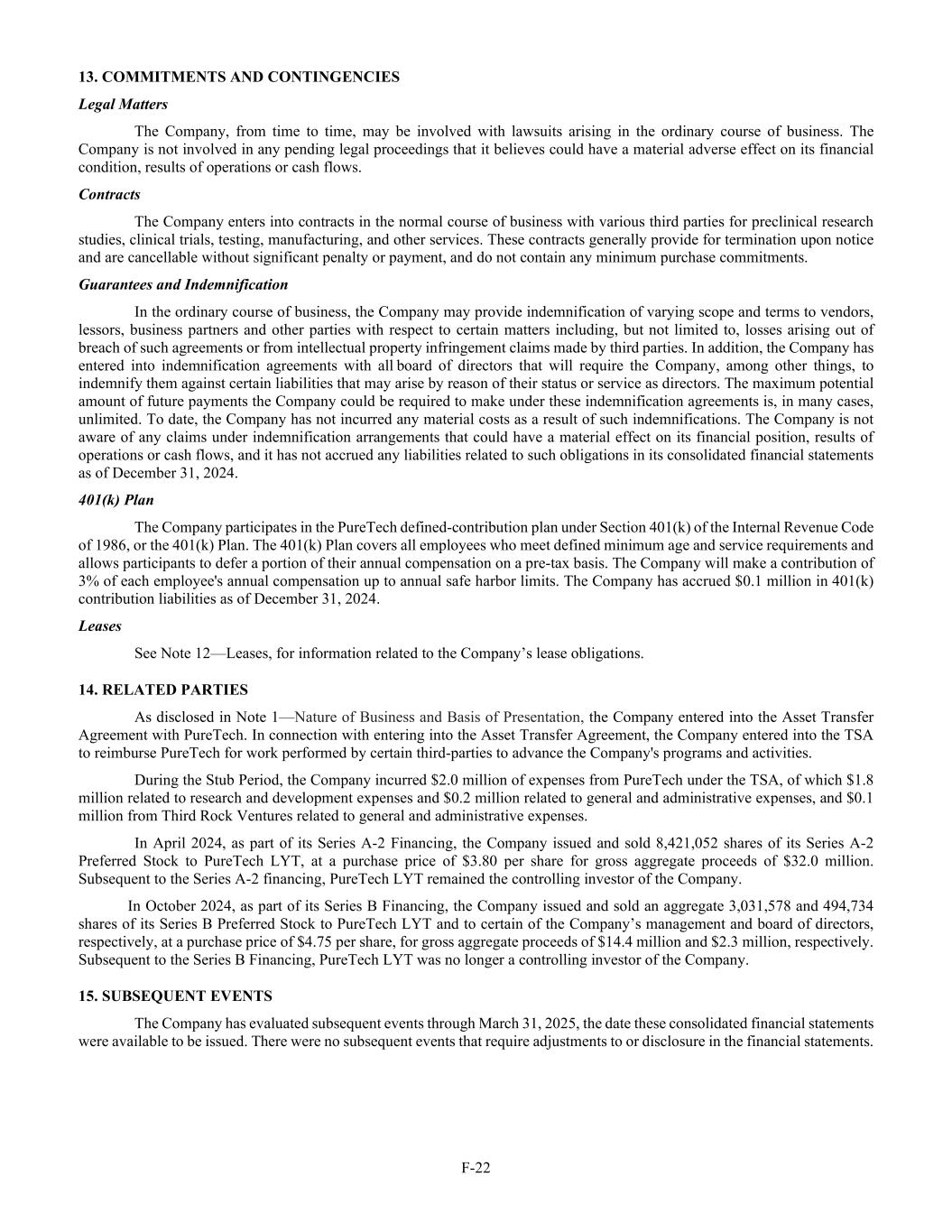 F-22 13. COMMITMENTS AND CONTINGENCIES Legal Matters The Company, from time to time, may be involved with lawsuits arising in the ordinary course of business. The Company is not involved in any pending legal proceedings that it believes could have a material adverse effect on its financial condition, results of operations or cash flows. Contracts The Company enters into contracts in the normal course of business with various third parties for preclinical research studies, clinical trials, testing, manufacturing, and other services. These contracts generally provide for termination upon notice and are cancellable without significant penalty or payment, and do not contain any minimum purchase commitments. Guarantees and Indemnification In the ordinary course of business, the Company may provide indemnification of varying scope and terms to vendors, lessors, business partners and other parties with respect to certain matters including, but not limited to, losses arising out of breach of such agreements or from intellectual property infringement claims made by third parties. In addition, the Company has entered into indemnification agreements with all board of directors that will require the Company, among other things, to indemnify them against certain liabilities that may arise by reason of their status or service as directors. The maximum potential amount of future payments the Company could be required to make under these indemnification agreements is, in many cases, unlimited. To date, the Company has not incurred any material costs as a result of such indemnifications. The Company is not aware of any claims under indemnification arrangements that could have a material effect on its financial position, results of operations or cash flows, and it has not accrued any liabilities related to such obligations in its consolidated financial statements as of December 31, 2024. 401(k) Plan The Company participates in the PureTech defined-contribution plan under Section 401(k) of the Internal Revenue Code of 1986, or the 401(k) Plan. The 401(k) Plan covers all employees who meet defined minimum age and service requirements and allows participants to defer a portion of their annual compensation on a pre-tax basis. The Company will make a contribution of 3% of each employee's annual compensation up to annual safe harbor limits. The Company has accrued $0.1 million in 401(k) contribution liabilities as of December 31, 2024. Leases See Note 12—Leases, for information related to the Company’s lease obligations. 14. RELATED PARTIES As disclosed in Note 1—Nature of Business and Basis of Presentation, the Company entered into the Asset Transfer Agreement with PureTech. In connection with entering into the Asset Transfer Agreement, the Company entered into the TSA to reimburse PureTech for work performed by certain third-parties to advance the Company's programs and activities. During the Stub Period, the Company incurred $2.0 million of expenses from PureTech under the TSA, of which $1.8 million related to research and development expenses and $0.2 million related to general and administrative expenses, and $0.1 million from Third Rock Ventures related to general and administrative expenses. In April 2024, as part of its Series A-2 Financing, the Company issued and sold 8,421,052 shares of its Series A-2 Preferred Stock to PureTech LYT, at a purchase price of $3.80 per share for gross aggregate proceeds of $32.0 million. Subsequent to the Series A-2 financing, PureTech LYT remained the controlling investor of the Company. In October 2024, as part of its Series B Financing, the Company issued and sold an aggregate 3,031,578 and 494,734 shares of its Series B Preferred Stock to PureTech LYT and to certain of the Company’s management and board of directors, respectively, at a purchase price of $4.75 per share, for gross aggregate proceeds of $14.4 million and $2.3 million, respectively. Subsequent to the Series B Financing, PureTech LYT was no longer a controlling investor of the Company. 15. SUBSEQUENT EVENTS The Company has evaluated subsequent events through March 31, 2025, the date these consolidated financial statements were available to be issued. There were no subsequent events that require adjustments to or disclosure in the financial statements.