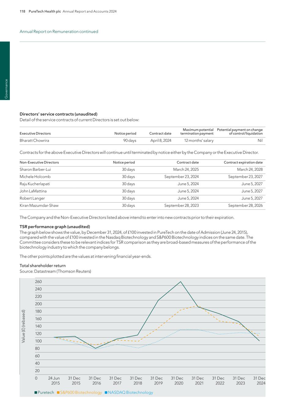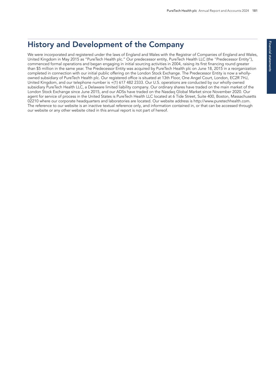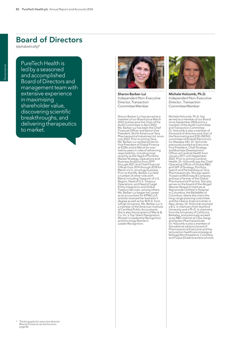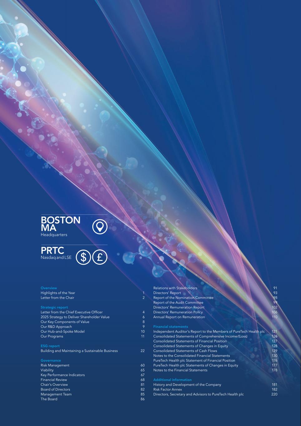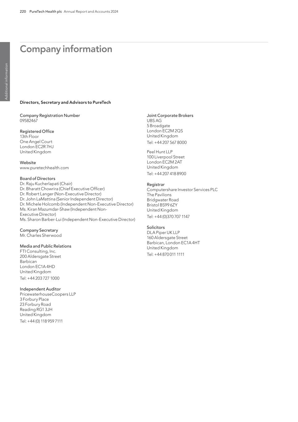 220 PureTech Health plc Annual Report and Accounts 2024 A d d it io na l i nf o rm at io n Joint Corporate Brokers UBS AG 5 Broadgate London EC2M 2QS United Kingdom Tel: +44 207 567 8000 Peel Hunt LLP 100 Liverpool Street London EC2M 2AT United Kingdom Tel: +44 207 418 8900 Registrar Computershare Investor Services PLC The Pavilions Bridgwater Road Bristol BS99 6ZY United Kingdom Tel: +44 (0)370 707 1147 Solicitors DLA Piper UK LLP 160 Aldersgate Street Barbican, London EC1A 4HT United Kingdom Tel: +44 870 011 1111 Company Registration Number 09582467 Registered Office 13th Floor One Angel Court London EC2R 7HJ United Kingdom Website www.puretechhealth.com Board of Directors Dr. Raju Kucherlapati (Chair) Dr. Bharatt Chowrira (Chief Executive Officer) Dr. Robert Langer (Non-Executive Director) Dr. John LaMattina (Senior Independent Director) Dr. Michele Holcomb (Independent Non-Executive Director) Ms. Kiran Mazumdar-Shaw (Independent Non- Executive Director) Ms. Sharon Barber-Lui (Independent Non-Executive Director) Company Secretary Mr. Charles Sherwood Media and Public Relations FTI Consulting, Inc. 200 Aldersgate Street Barbican London EC1A 4HD United Kingdom Tel: +44 203 727 1000 Independent Auditor PricewaterhouseCoopers LLP 3 Forbury Place 23 Forbury Road Reading RG1 3JH United Kingdom Tel: +44 (0) 118 959 7111 Company information Directors, Secretary and Advisors to PureTech