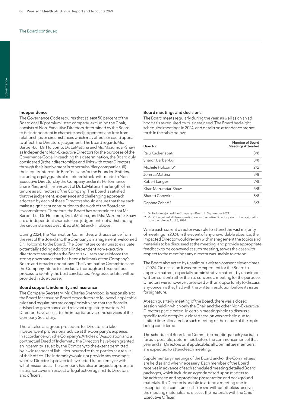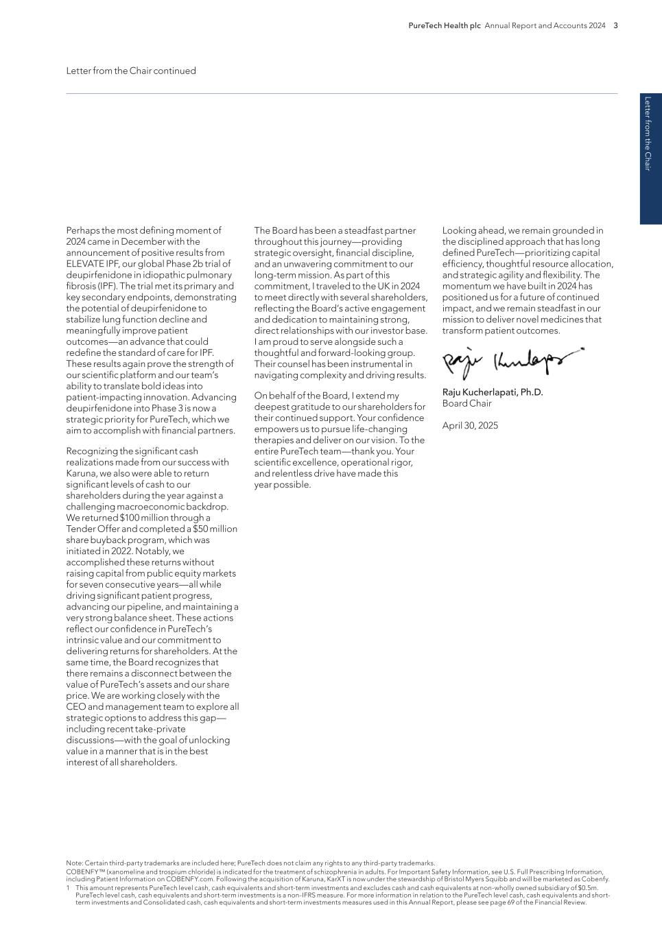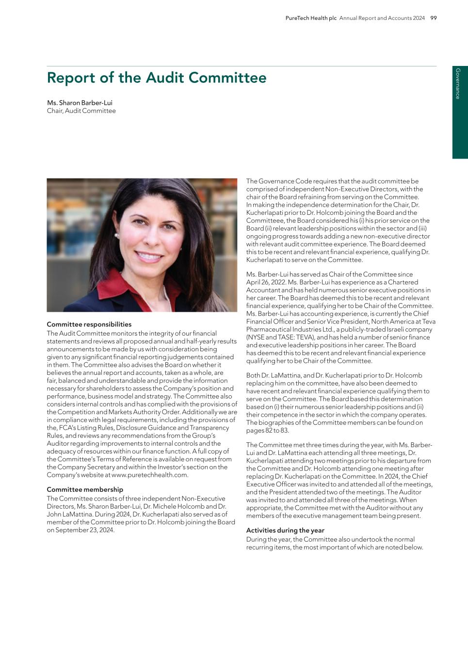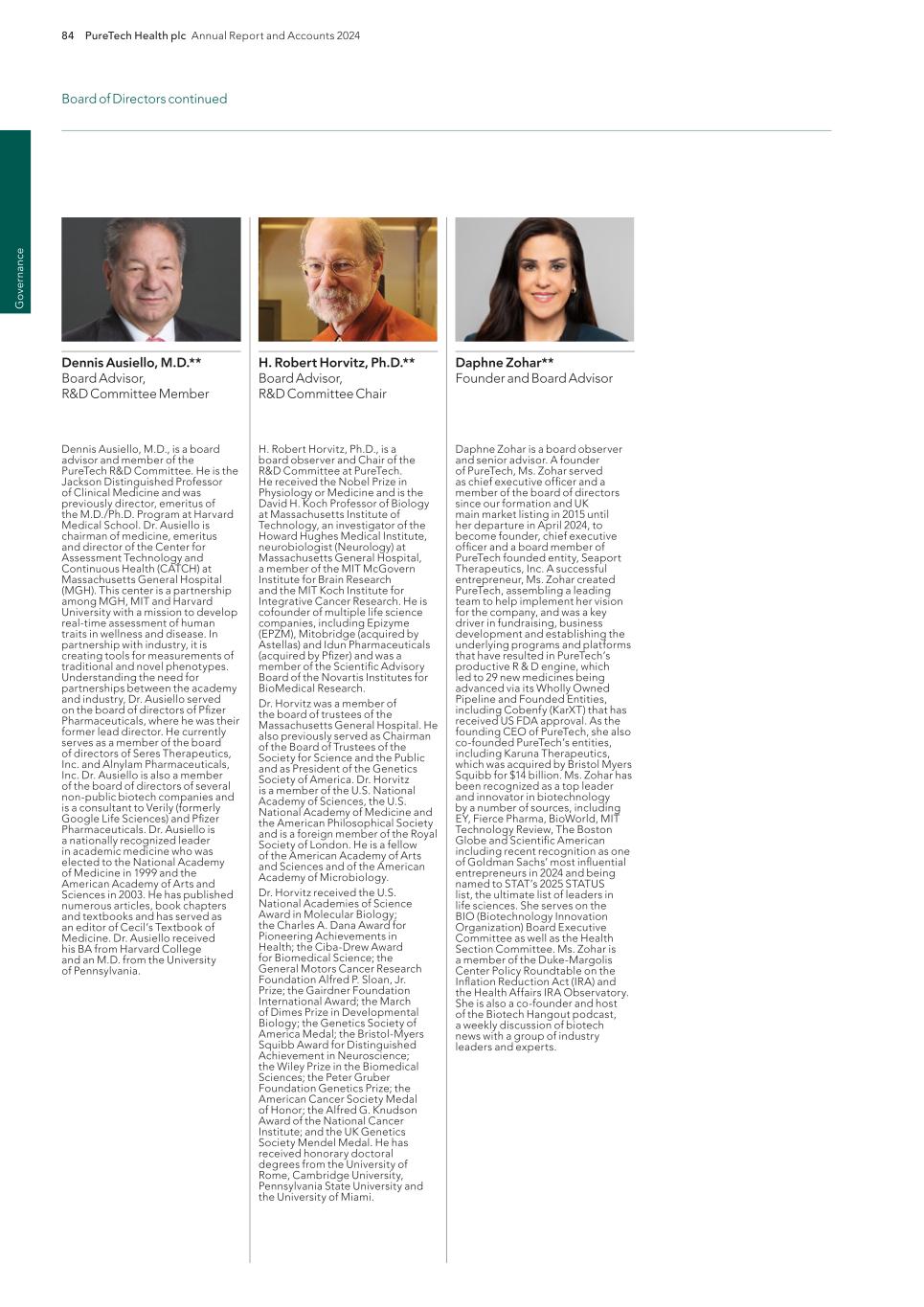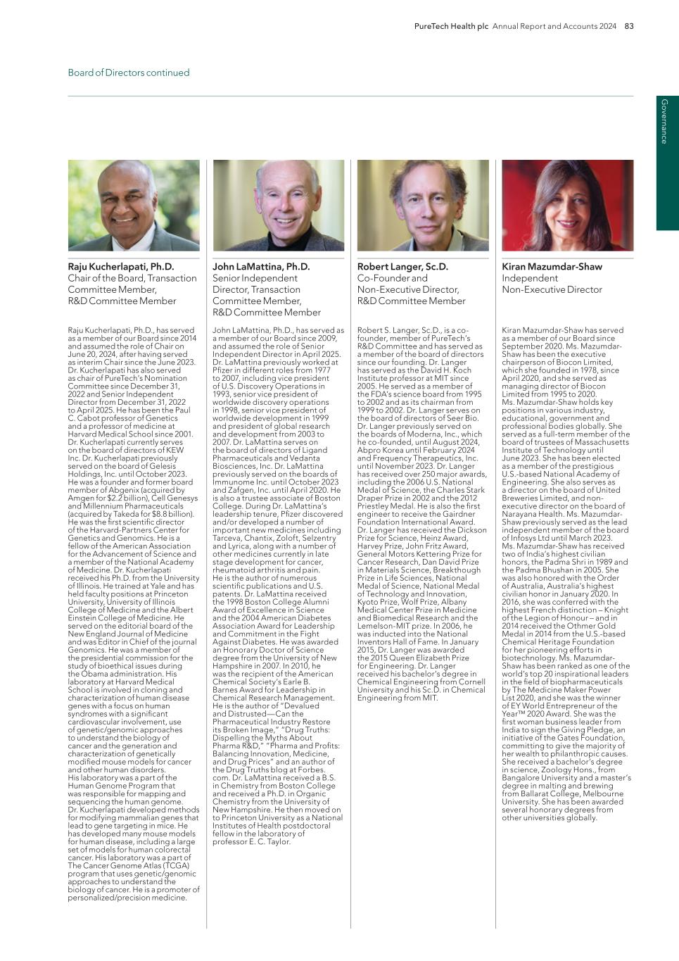 220 PureTech Health plc Annual Report and Accounts 2024 A d d it io na l i nf o rm at io n Joint Corporate Brokers UBS AG 5 Broadgate London EC2M 2QS United Kingdom Tel: +44 207 567 8000 Peel Hunt LLP 100 Liverpool Street London EC2M 2AT United Kingdom Tel: +44 207 418 8900 Registrar Computershare Investor Services PLC The Pavilions Bridgwater Road Bristol BS99 6ZY United Kingdom Tel: +44 (0)370 707 1147 Solicitors DLA Piper UK LLP 160 Aldersgate Street Barbican, London EC1A 4HT United Kingdom Tel: +44 870 011 1111 Company Registration Number 09582467 Registered Office 13th Floor One Angel Court London EC2R 7HJ United Kingdom Website www.puretechhealth.com Board of Directors Dr. Raju Kucherlapati (Chair) Dr. Bharatt Chowrira (Chief Executive Officer) Dr. Robert Langer (Non-Executive Director) Dr. John LaMattina (Senior Independent Director) Dr. Michele Holcomb (Independent Non-Executive Director) Ms. Kiran Mazumdar-Shaw (Independent Non- Executive Director) Ms. Sharon Barber-Lui (Independent Non-Executive Director) Company Secretary Mr. Charles Sherwood Media and Public Relations FTI Consulting, Inc. 200 Aldersgate Street Barbican London EC1A 4HD United Kingdom Tel: +44 203 727 1000 Independent Auditor PricewaterhouseCoopers LLP 3 Forbury Place 23 Forbury Road Reading RG1 3JH United Kingdom Tel: +44 (0) 118 959 7111 Company information Directors, Secretary and Advisors to PureTech