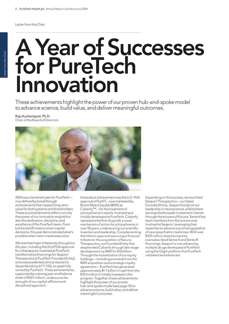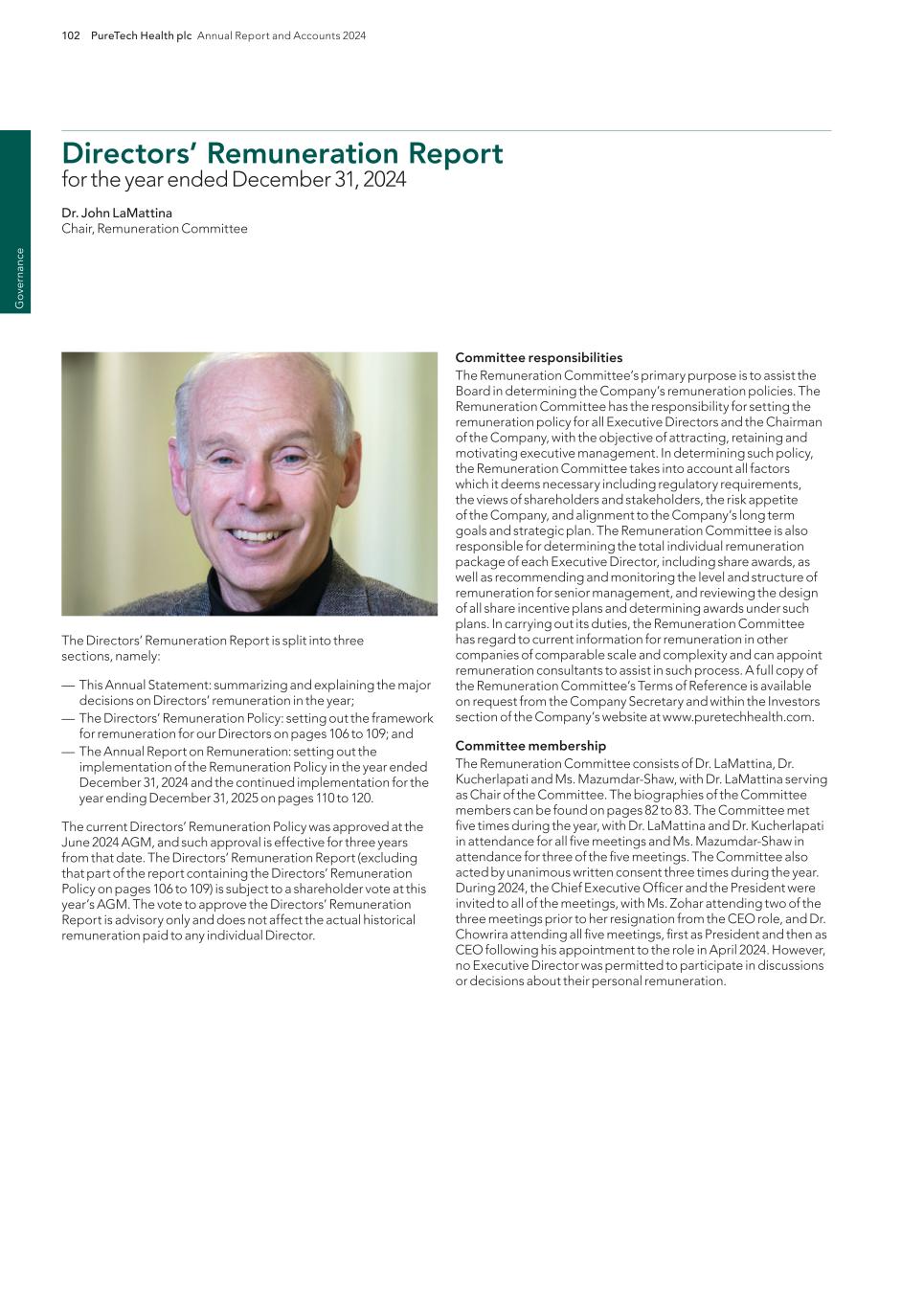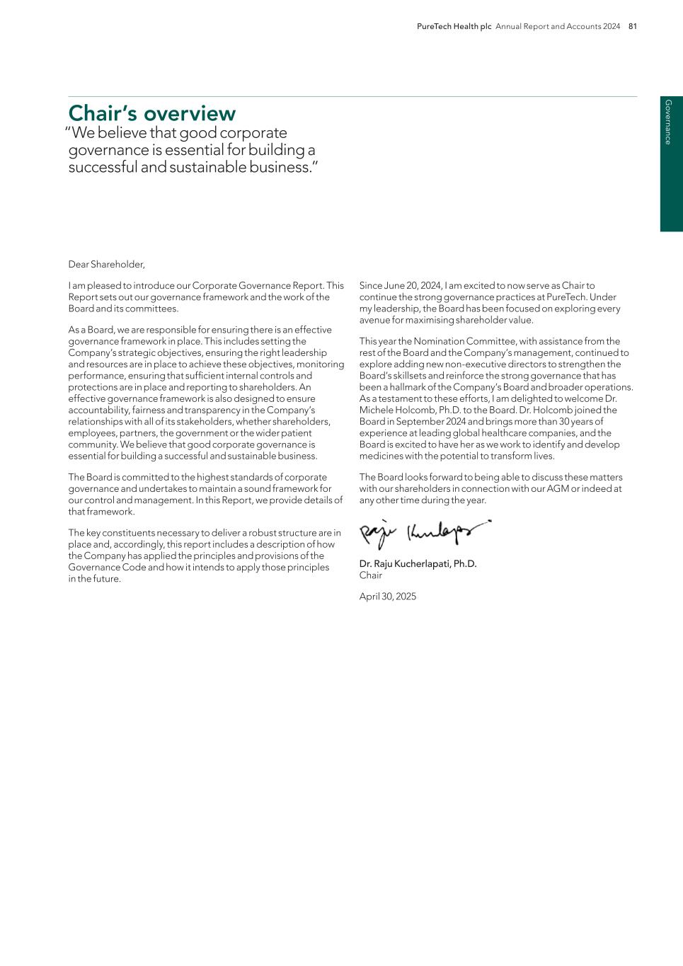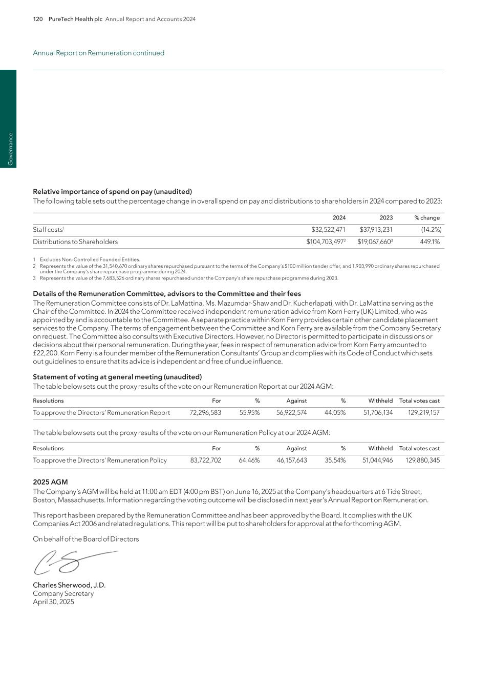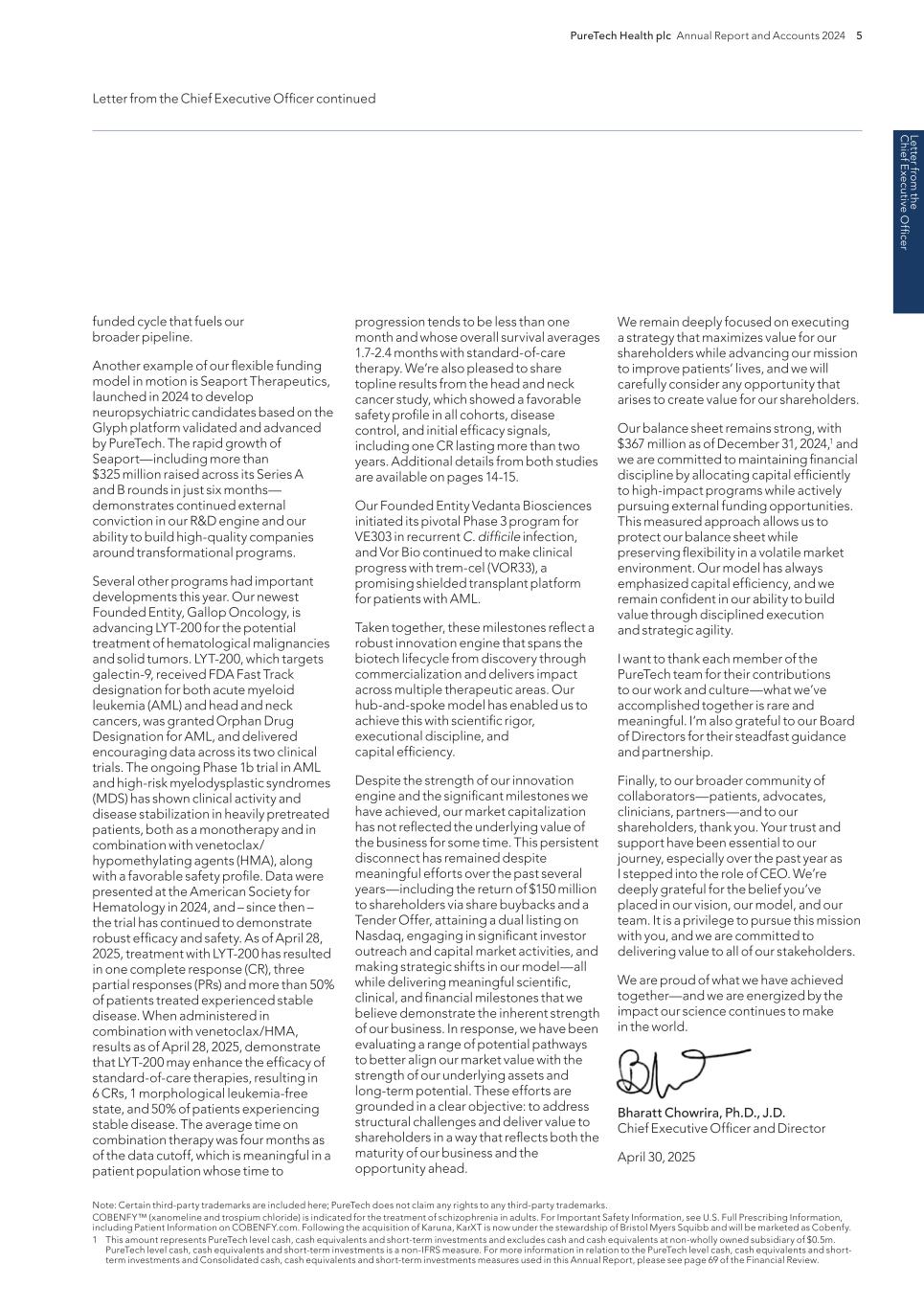 220 PureTech Health plc Annual Report and Accounts 2024 A d d it io na l i nf o rm at io n Joint Corporate Brokers UBS AG 5 Broadgate London EC2M 2QS United Kingdom Tel: +44 207 567 8000 Peel Hunt LLP 100 Liverpool Street London EC2M 2AT United Kingdom Tel: +44 207 418 8900 Registrar Computershare Investor Services PLC The Pavilions Bridgwater Road Bristol BS99 6ZY United Kingdom Tel: +44 (0)370 707 1147 Solicitors DLA Piper UK LLP 160 Aldersgate Street Barbican, London EC1A 4HT United Kingdom Tel: +44 870 011 1111 Company Registration Number 09582467 Registered Office 13th Floor One Angel Court London EC2R 7HJ United Kingdom Website www.puretechhealth.com Board of Directors Dr. Raju Kucherlapati (Chair) Dr. Bharatt Chowrira (Chief Executive Officer) Dr. Robert Langer (Non-Executive Director) Dr. John LaMattina (Senior Independent Director) Dr. Michele Holcomb (Independent Non-Executive Director) Ms. Kiran Mazumdar-Shaw (Independent Non- Executive Director) Ms. Sharon Barber-Lui (Independent Non-Executive Director) Company Secretary Mr. Charles Sherwood Media and Public Relations FTI Consulting, Inc. 200 Aldersgate Street Barbican London EC1A 4HD United Kingdom Tel: +44 203 727 1000 Independent Auditor PricewaterhouseCoopers LLP 3 Forbury Place 23 Forbury Road Reading RG1 3JH United Kingdom Tel: +44 (0) 118 959 7111 Company information Directors, Secretary and Advisors to PureTech