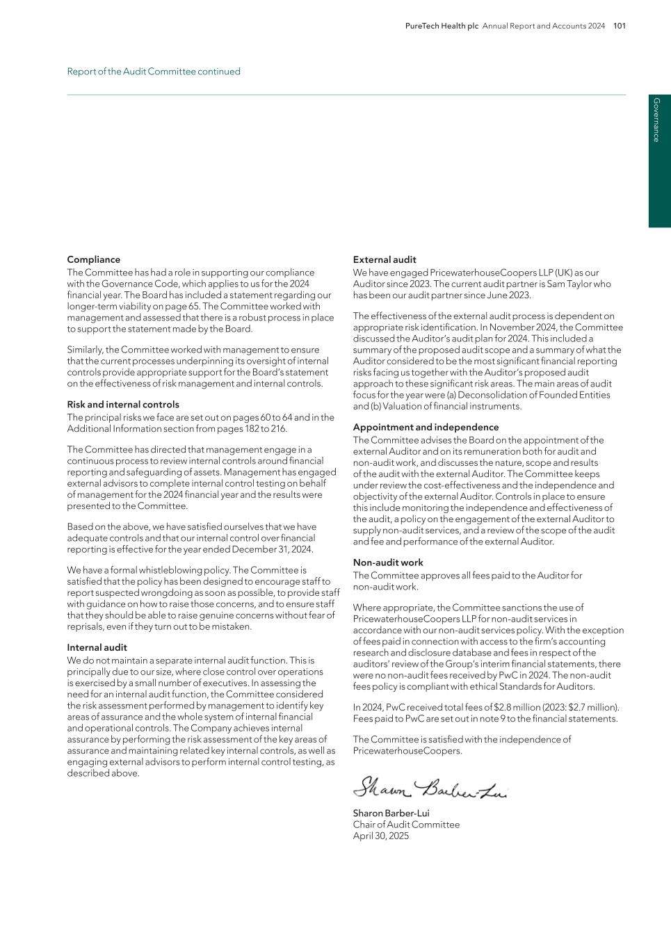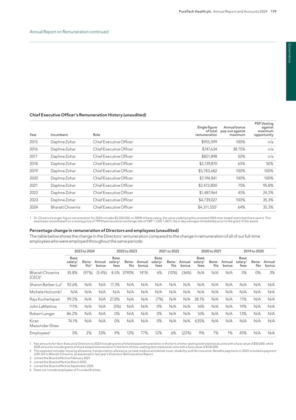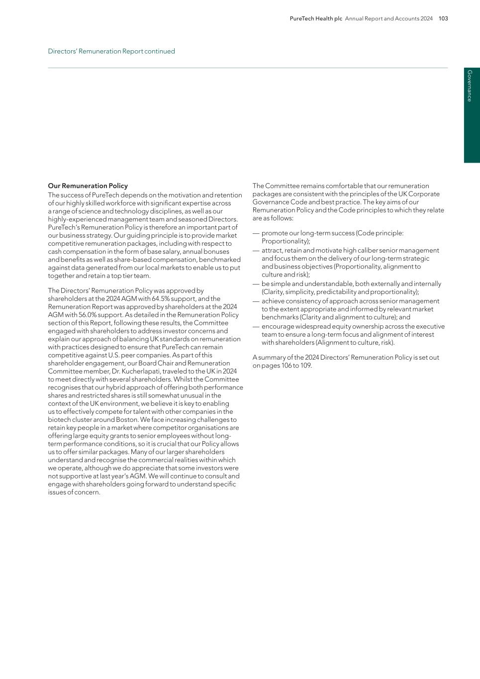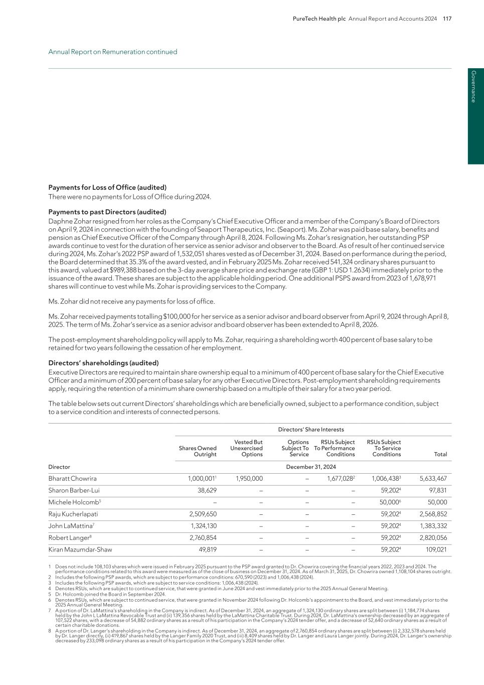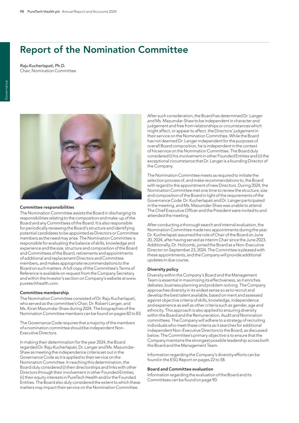 220 PureTech Health plc Annual Report and Accounts 2024 A d d it io na l i nf o rm at io n Joint Corporate Brokers UBS AG 5 Broadgate London EC2M 2QS United Kingdom Tel: +44 207 567 8000 Peel Hunt LLP 100 Liverpool Street London EC2M 2AT United Kingdom Tel: +44 207 418 8900 Registrar Computershare Investor Services PLC The Pavilions Bridgwater Road Bristol BS99 6ZY United Kingdom Tel: +44 (0)370 707 1147 Solicitors DLA Piper UK LLP 160 Aldersgate Street Barbican, London EC1A 4HT United Kingdom Tel: +44 870 011 1111 Company Registration Number 09582467 Registered Office 13th Floor One Angel Court London EC2R 7HJ United Kingdom Website www.puretechhealth.com Board of Directors Dr. Raju Kucherlapati (Chair) Dr. Bharatt Chowrira (Chief Executive Officer) Dr. Robert Langer (Non-Executive Director) Dr. John LaMattina (Senior Independent Director) Dr. Michele Holcomb (Independent Non-Executive Director) Ms. Kiran Mazumdar-Shaw (Independent Non- Executive Director) Ms. Sharon Barber-Lui (Independent Non-Executive Director) Company Secretary Mr. Charles Sherwood Media and Public Relations FTI Consulting, Inc. 200 Aldersgate Street Barbican London EC1A 4HD United Kingdom Tel: +44 203 727 1000 Independent Auditor PricewaterhouseCoopers LLP 3 Forbury Place 23 Forbury Road Reading RG1 3JH United Kingdom Tel: +44 (0) 118 959 7111 Company information Directors, Secretary and Advisors to PureTech