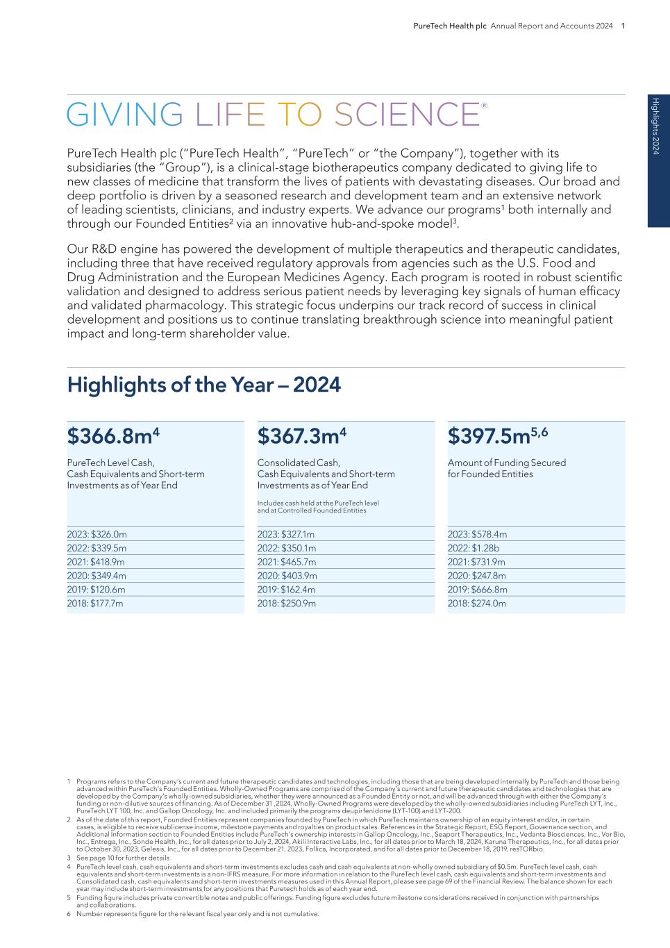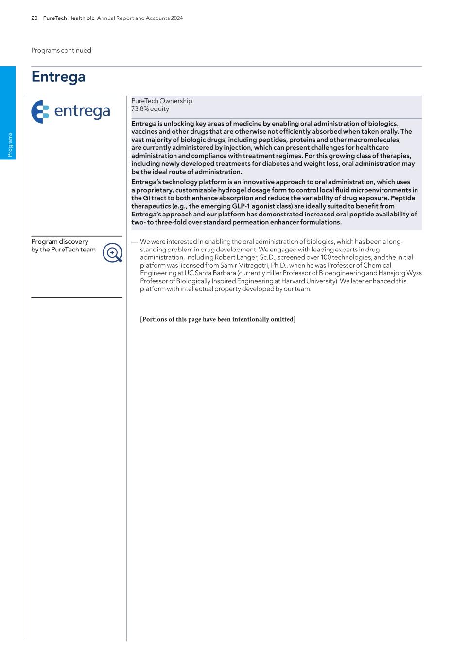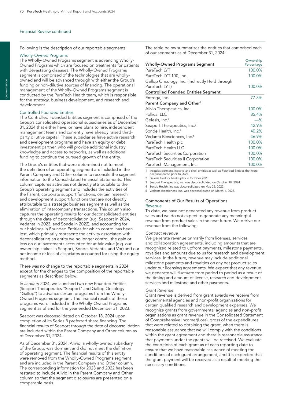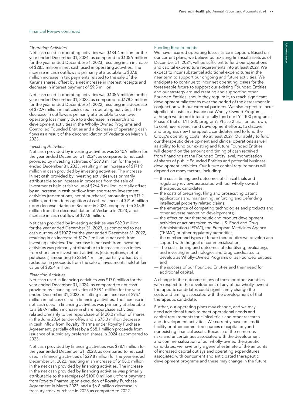 PureTech Health plc Annual Report and Accounts 2024 201 Risk Factor Annex continued A d d itio nal info rm atio n Such reforms could have an adverse effect on anticipated revenue from therapeutic candidates that we may successfully develop and for which we may obtain regulatory approval and may affect our overall financial condition and ability to develop therapeutic candidates. We cannot predict the initiatives that may be adopted in the future. The continuing efforts of the government, insurance companies, managed care organizations and other payors of healthcare services to contain or reduce costs of healthcare and/or impose price controls may adversely affect: — the demand for the therapeutic candidates within our Wholly-Owned Programs or our Founded Entities’ therapeutic candidates, if approved; — our ability to receive or set a price that we believe is fair for our therapeutics; — our ability to generate revenue and achieve or maintain profitability; — the amount of taxes that we are required to pay; and — the availability of capital. Other healthcare reform measures may be adopted in the future, and may result in additional reductions in Medicare and other healthcare funding, more rigorous coverage criteria, lower reimbursement, and new payment methodologies. This could lower the price that we receive for any approved therapeutic. Any denial in coverage or reduction in reimbursement from Medicare or other government-funded programs may result in a similar denial or reduction in payments from private payors, which may prevent us from being able to generate sufficient revenue, attain profitability or commercialize the therapeutic candidates within our Wholly-Owned Programs or our Founded Entities’ therapeutic candidates, if approved. Litigation and legislative efforts to change or repeal the ACA are likely to continue, with unpredictable and uncertain results. In the EU, similar developments may affect our ability to profitably commercialize our therapeutic candidates, if approved. On December 13, 2021, Regulation No 2021/2282 on Health Technology Assessment, or HTA, amending Directive 2011/24/EU, was adopted. The Regulation entered into force in January 2022 and has been applicable since January 2025, with phased implementation based on the type of product, i.e. oncology and advanced therapy medicinal products as of 2025, certain high-risk medical devices as of 2026, orphan medicinal products as of 2028, and all other medicinal products by 2030. The Regulation intends to boost cooperation among EU member states in assessing health technologies, including new medicinal products as well as certain high-risk medical devices, and provide the basis for cooperation at the EU level for joint clinical assessments in these areas. It will permit EU member states to use common HTA tools, methodologies, and procedures across the EU, working together in four main areas, including joint clinical assessment of the innovative health technologies with the highest potential impact for patients, joint scientific consultations whereby developers can seek advice from HTA authorities, identification of emerging health technologies to identify promising technologies early, and continuing voluntary cooperation in other areas. Individual EU member states will continue to be responsible for assessing non-clinical (e.g., economic, social, ethical) aspects of health technology, and making decisions on pricing and reimbursement. Risks Related to Competition We face significant competition in an environment of rapid technological and scientific change, and there is a possibility that our competitors may achieve regulatory approval before us or develop therapies that are safer, more advanced or more effective than ours, which may negatively impact our ability to successfully market or commercialize any therapeutic candidates we may develop and ultimately harm our financial condition. The development and commercialization of new drug therapeutics is highly competitive. We may face competition with respect to any therapeutic candidates that we seek to develop or commercialize in the future from major pharmaceutical companies, specialty pharmaceutical companies, and biotechnology companies worldwide. Potential competitors also include academic institutions, government agencies, and other public and private research organizations that conduct research, seek patent protection, and establish collaborative arrangements for research, development, manufacturing, and commercialization. There are a number of major pharmaceutical and biotechnology companies that are currently pursuing the development and commercialization of potential medicines targeting similar treatment areas as we are. If any of our competitors receive FDA or foreign regulatory authorities approval before we do, the therapeutic candidates within our Wholly-Owned Programs would not be the first treatment on the market, and our market share may be limited. In addition to competition from other companies targeting our target indications, any therapeutics we may develop may also face competition from other types of therapies. a new methodology by which rebates owed by manufacturers under the Medicaid Drug Rebate Program are calculated for drugs that are inhaled, infused, instilled, implanted or injected, increases the minimum Medicaid rebates owed by manufacturers under the Medicaid Drug Rebate Program and extends the rebate program to individuals enrolled in Medicaid managed care organizations, and establishes annual fees and taxes on manufacturers of certain branded prescription drugs. Since the enactment of the ACA, there have been numerous judicial, administrative, executive, and legislative challenges to certain aspects of the ACA. On June 17, 2021, the U.S. Supreme Court dismissed the most recent judicial challenge to the ACA brought by several states without specifically ruling on the constitutionality of the ACA. Payment methodologies m