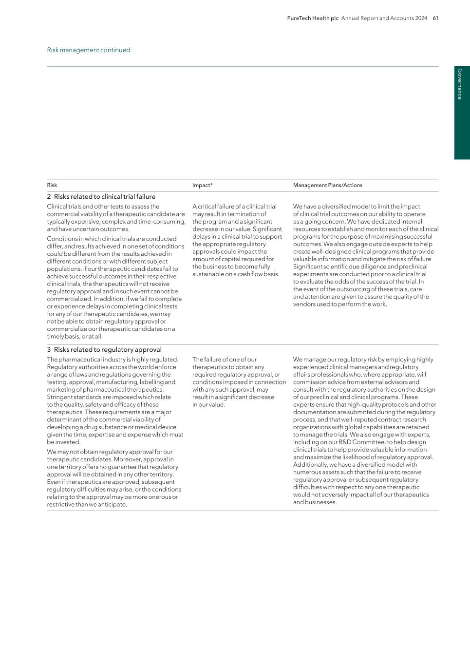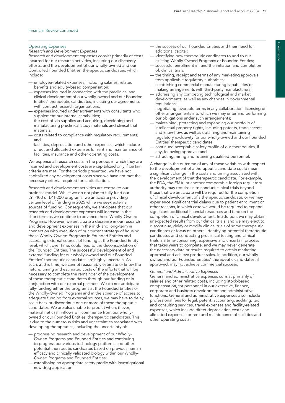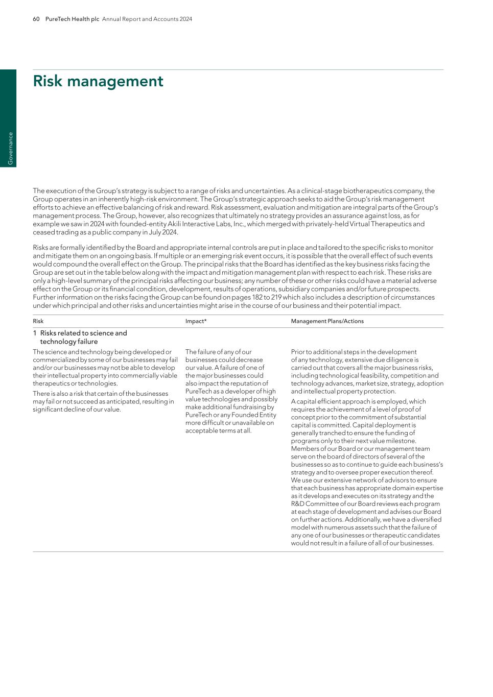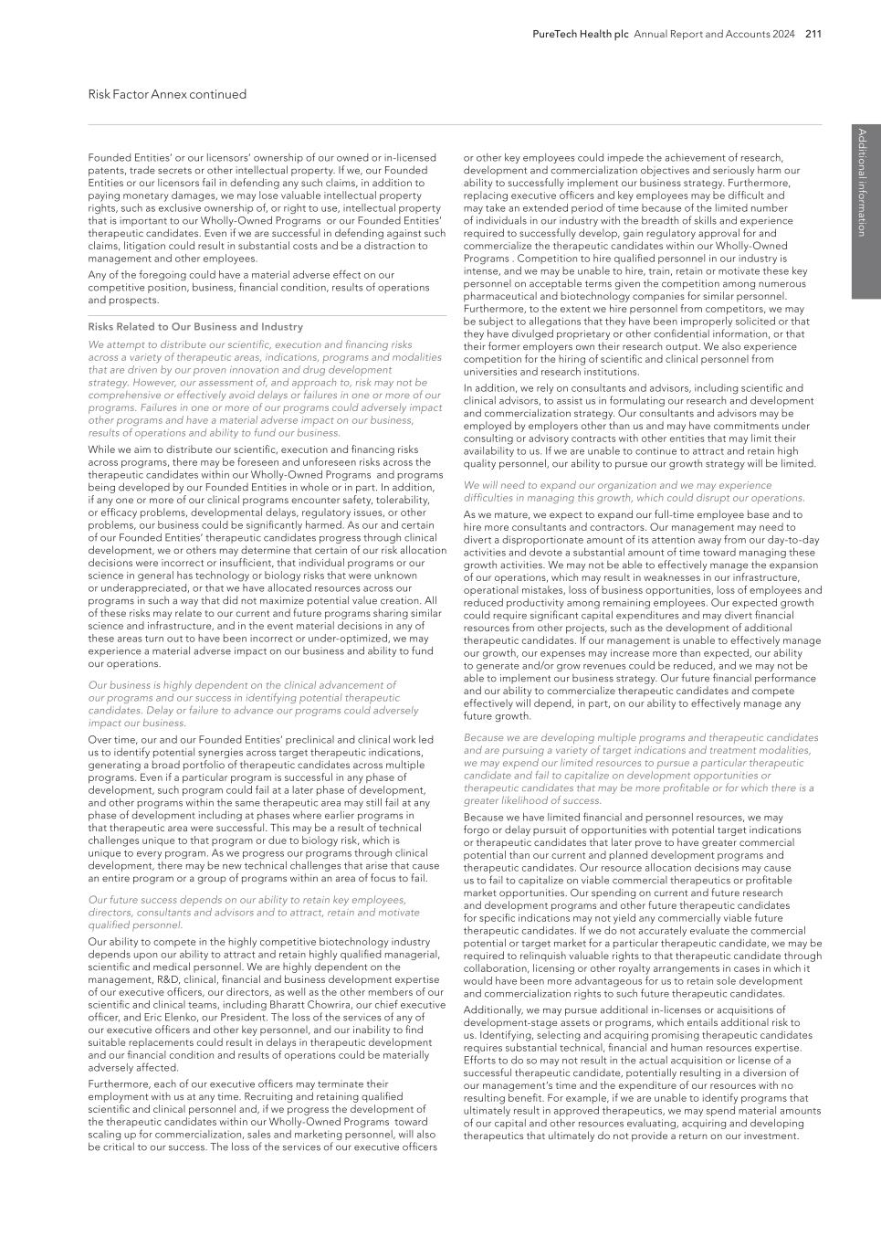 PureTech Health plc Annual Report and Accounts 2024 211 Risk Factor Annex continued A d d itio nal info rm atio n or other key employees could impede the achievement of research, development and commercialization objectives and seriously harm our ability to successfully implement our business strategy. Furthermore, replacing executive officers and key employees may be difficult and may take an extended period of time because of the limited number of individuals in our industry with the breadth of skills and experience required to successfully develop, gain regulatory approval for and commercialize the therapeutic candidates within our Wholly-Owned Programs . Competition to hire qualified personnel in our industry is intense, and we may be unable to hire, train, retain or motivate these key personnel on acceptable terms given the competition among numerous pharmaceutical and biotechnology companies for similar personnel. Furthermore, to the extent we hire personnel from competitors, we may be subject to allegations that they have been improperly solicited or that they have divulged proprietary or other confidential information, or that their former employers own their research output. We also experience competition for the hiring of scientific and clinical personnel from universities and research institutions. In addition, we rely on consultants and advisors, including scientific and clinical advisors, to assist us in formulating our research and development and commercialization strategy. Our consultants and advisors may be employed by employers other than us and may have commitments under consulting or advisory contracts with other entities that may limit their availability to us. If we are unable to continue to attract and retain high quality personnel, our ability to pursue our growth strategy will be limited. We will need to expand our organization and we may experience difficulties in managing this growth, which could disrupt our operations. As we mature, we expect to expand our full-time employee base and to hire more consultants and contractors. Our management may need to divert a disproportionate amount of its attention away from our day-to-day activities and devote a substantial amount of time toward managing these growth activities. We may not be able to effectively manage the expansion of our operations, which may result in weaknesses in our infrastructure, operational mistakes, loss of business opportunities, loss of employees and reduced productivity among remaining employees. Our expected growth could require significant capital expenditures and may divert financial resources from other projects, such as the development of additional therapeutic candidates. If our management is unable to effectively manage our growth, our expenses may increase more than expected, our ability to generate and/or grow revenues could be reduced, and we may not be able to implement our business strategy. Our future financial performance and our ability to commercialize therapeutic candidates and compete effectively will depend, in part, on our ability to effectively manage any future growth. Because we are developing multiple programs and therapeutic candidates and are pursuing a variety of target indications and treatment modalities, we may expend our limited resources to pursue a particular therapeutic candidate and fail to capitalize on development opportunities or therapeutic candidates that may be more profitable or for which there is a greater likelihood of success. Because we have limited financial and personnel resources, we may forgo or delay pursuit of opportunities with potential target indications or therapeutic candidates that later prove to have greater commercial potential than our current and planned development programs and therapeutic candidates. Our resource allocation decisions may cause us to fail to capitalize on viable commercial therapeutics or profitable market opportunities. Our spending on current and future research and development programs and other future therapeutic candidates for specific indications may not yield any commercially viable future therapeutic candidates. If we do not accurately evaluate the commercial potential or target market for a particular therapeutic candidate, we may be required to relinquish valuable rights to that therapeutic candidate through collaboration, licensing or other royalty arrangements in cases in which it would have been more advantageous for us to retain sole development and commercialization rights to such future therapeutic candidates. Additionally, we may pursue additional in-licenses or acquisitions of development-stage assets or programs, which entails additional risk to us. Identifying, selecting and acquiring promising therapeutic candidates requires substantial technical, financial and human resources expertise. Efforts to do so may not result in the actual acquisition or license of a successful therapeutic candidate, potentially resulting in a diversion of our management’s time and the expenditure of our resources with no resulting benefit. For example, if we are unable to identify programs that ultimately result in approved therapeutics, we may spend material amounts of our capital and other resources evaluating, acquiring and developing therapeutics that ultimately do not provide a return on our investment. Founded Entities’ or our licensors’ ownership of our owned or in-licensed patents, trade secrets or other intellectual property. If we, our Founded Entities or our licensors fail in defending any such claims, in addition to paying monetary damages, we may lose valuable intellectual property rights, such as exclusive ownership of, or right to use, intellectual property that is important to our Wholly-Owned Programs or our Founded Entities’ therapeutic candidates. Even if we are successful in defending against such claims, litigation could result in substantial costs and be a distraction to management and ot