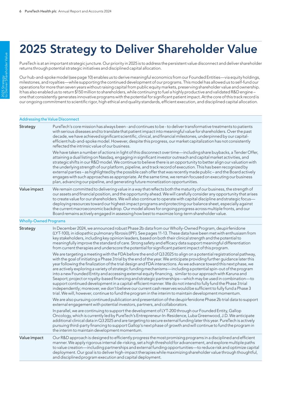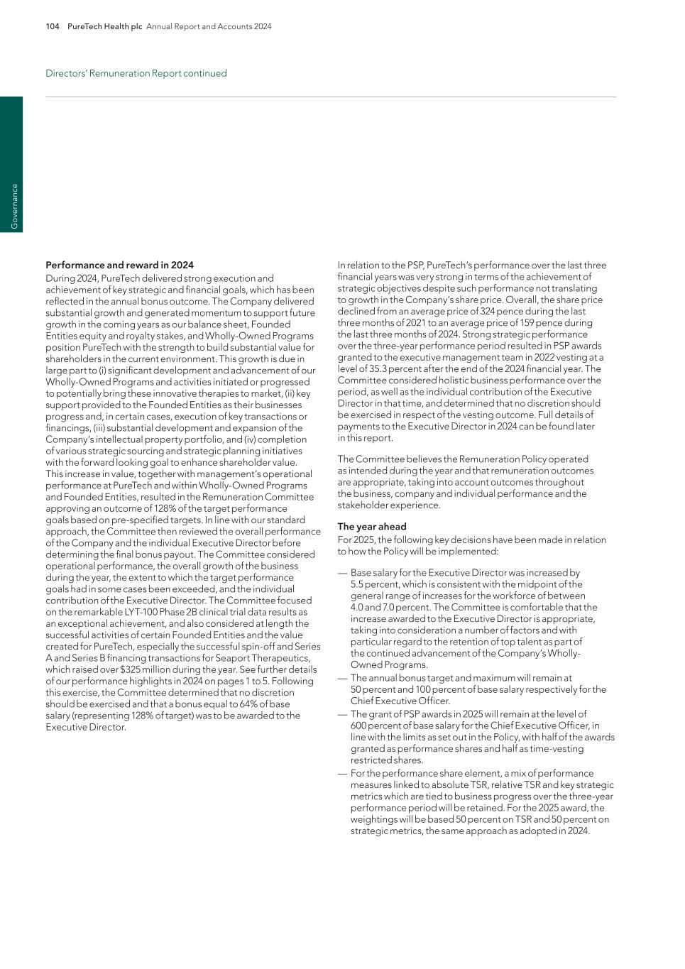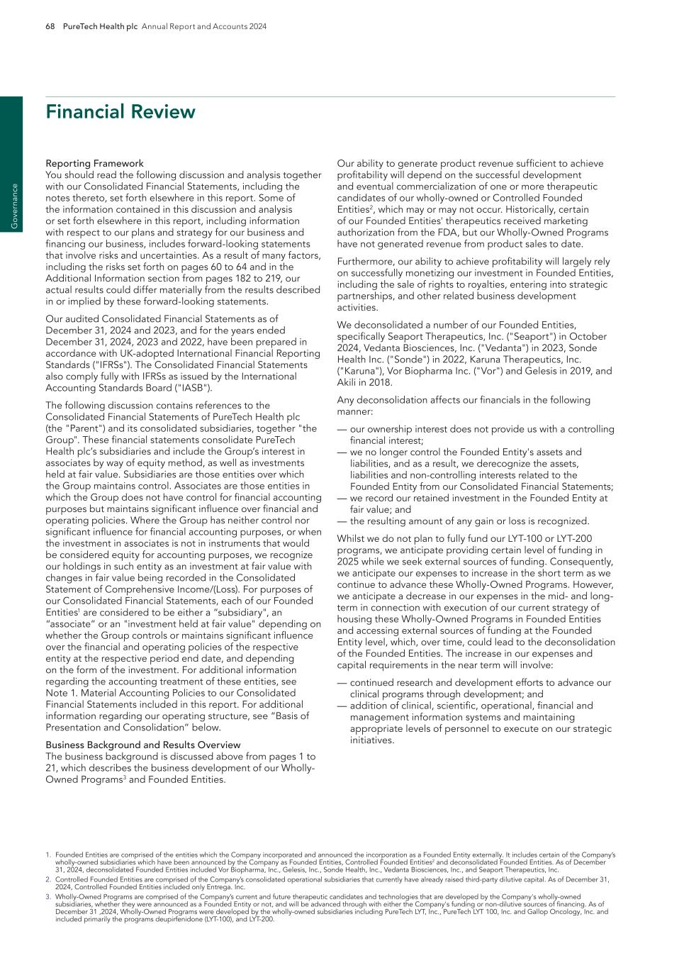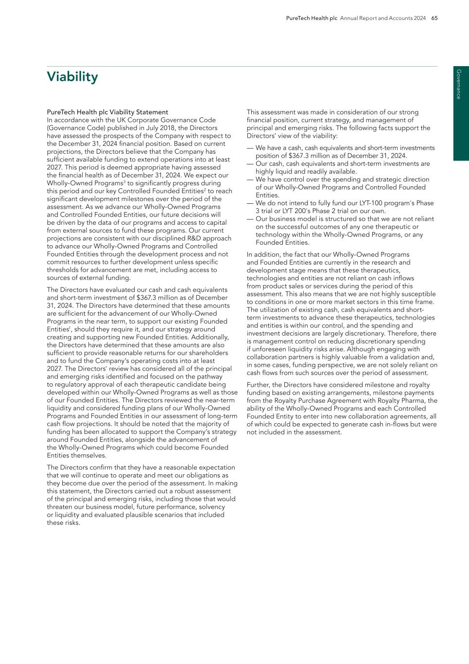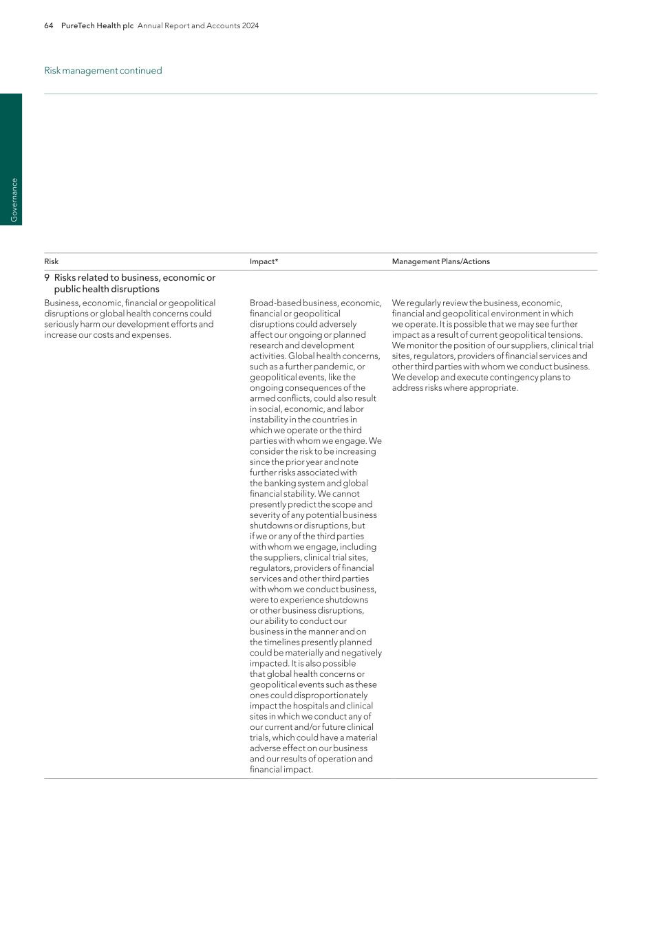 PureTech Health plc Annual Report and Accounts 2024 211 Risk Factor Annex continued A d d itio nal info rm atio n or other key employees could impede the achievement of research, development and commercialization objectives and seriously harm our ability to successfully implement our business strategy. Furthermore, replacing executive officers and key employees may be difficult and may take an extended period of time because of the limited number of individuals in our industry with the breadth of skills and experience required to successfully develop, gain regulatory approval for and commercialize the therapeutic candidates within our Wholly-Owned Programs . Competition to hire qualified personnel in our industry is intense, and we may be unable to hire, train, retain or motivate these key personnel on acceptable terms given the competition among numerous pharmaceutical and biotechnology companies for similar personnel. Furthermore, to the extent we hire personnel from competitors, we may be subject to allegations that they have been improperly solicited or that they have divulged proprietary or other confidential information, or that their former employers own their research output. We also experience competition for the hiring of scientific and clinical personnel from universities and research institutions. In addition, we rely on consultants and advisors, including scientific and clinical advisors, to assist us in formulating our research and development and commercialization strategy. Our consultants and advisors may be employed by employers other than us and may have commitments under consulting or advisory contracts with other entities that may limit their availability to us. If we are unable to continue to attract and retain high quality personnel, our ability to pursue our growth strategy will be limited. We will need to expand our organization and we may experience difficulties in managing this growth, which could disrupt our operations. As we mature, we expect to expand our full-time employee base and to hire more consultants and contractors. Our management may need to divert a disproportionate amount of its attention away from our day-to-day activities and devote a substantial amount of time toward managing these growth activities. We may not be able to effectively manage the expansion of our operations, which may result in weaknesses in our infrastructure, operational mistakes, loss of business opportunities, loss of employees and reduced productivity among remaining employees. Our expected growth could require significant capital expenditures and may divert financial resources from other projects, such as the development of additional therapeutic candidates. If our management is unable to effectively manage our growth, our expenses may increase more than expected, our ability to generate and/or grow revenues could be reduced, and we may not be able to implement our business strategy. Our future financial performance and our ability to commercialize therapeutic candidates and compete effectively will depend, in part, on our ability to effectively manage any future growth. Because we are developing multiple programs and therapeutic candidates and are pursuing a variety of target indications and treatment modalities, we may expend our limited resources to pursue a particular therapeutic candidate and fail to capitalize on development opportunities or therapeutic candidates that may be more profitable or for which there is a greater likelihood of success. Because we have limited financial and personnel resources, we may forgo or delay pursuit of opportunities with potential target indications or therapeutic candidates that later prove to have greater commercial potential than our current and planned development programs and therapeutic candidates. Our resource allocation decisions may cause us to fail to capitalize on viable commercial therapeutics or profitable market opportunities. Our spending on current and future research and development programs and other future therapeutic candidates for specific indications may not yield any commercially viable future therapeutic candidates. If we do not accurately evaluate the commercial potential or target market for a particular therapeutic candidate, we may be required to relinquish valuable rights to that therapeutic candidate through collaboration, licensing or other royalty arrangements in cases in which it would have been more advantageous for us to retain sole development and commercialization rights to such future therapeutic candidates. Additionally, we may pursue additional in-licenses or acquisitions of development-stage assets or programs, which entails additional risk to us. Identifying, selecting and acquiring promising therapeutic candidates requires substantial technical, financial and human resources expertise. Efforts to do so may not result in the actual acquisition or license of a successful therapeutic candidate, potentially resulting in a diversion of our management’s time and the expenditure of our resources with no resulting benefit. For example, if we are unable to identify programs that ultimately result in approved therapeutics, we may spend material amounts of our capital and other resources evaluating, acquiring and developing therapeutics that ultimately do not provide a return on our investment. Founded Entities’ or our licensors’ ownership of our owned or in-licensed patents, trade secrets or other intellectual property. If we, our Founded Entities or our licensors fail in defending any such claims, in addition to paying monetary damages, we may lose valuable intellectual property rights, such as exclusive ownership of, or right to use, intellectual property that is important to our Wholly-Owned Programs or our Founded Entities’ therapeutic candidates. Even if we are successful in defending against such claims, litigation could result in substantial costs and be a distraction to management and ot
