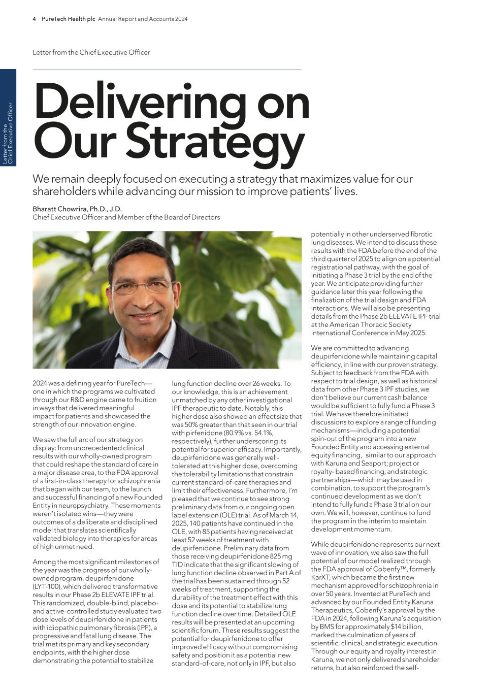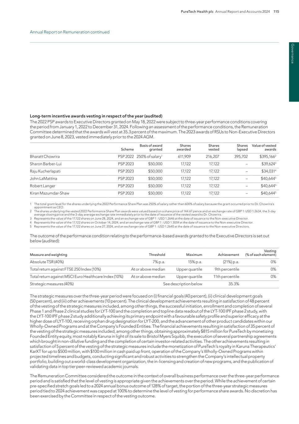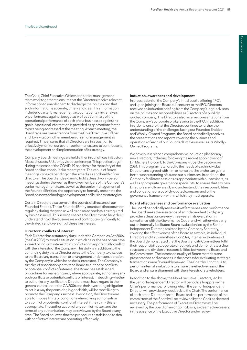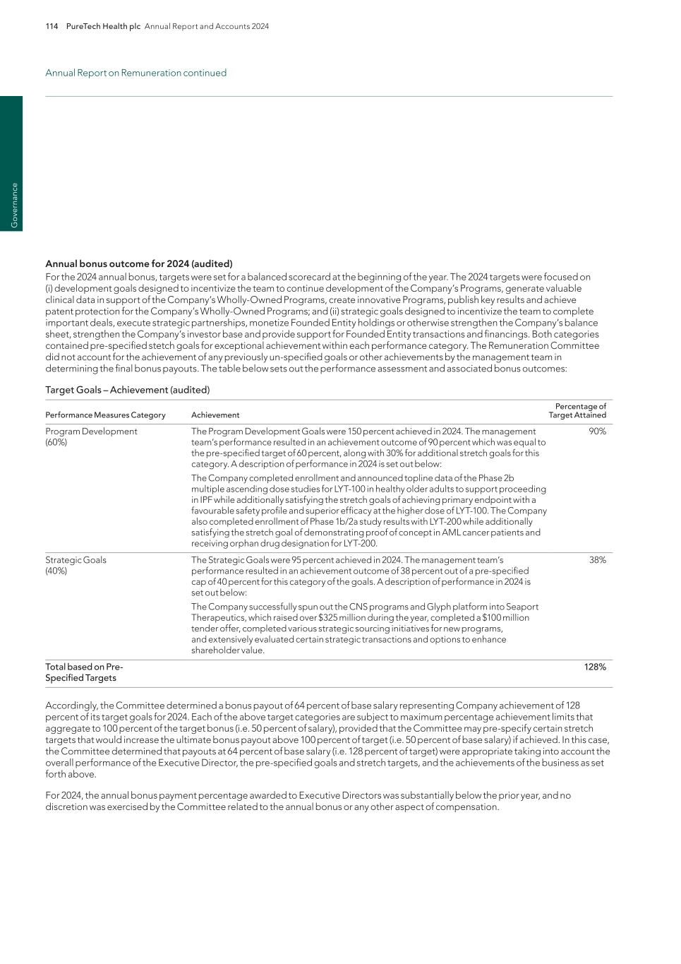 PureTech Health plc Annual Report and Accounts 2024 211 Risk Factor Annex continued A d d itio nal info rm atio n or other key employees could impede the achievement of research, development and commercialization objectives and seriously harm our ability to successfully implement our business strategy. Furthermore, replacing executive officers and key employees may be difficult and may take an extended period of time because of the limited number of individuals in our industry with the breadth of skills and experience required to successfully develop, gain regulatory approval for and commercialize the therapeutic candidates within our Wholly-Owned Programs . Competition to hire qualified personnel in our industry is intense, and we may be unable to hire, train, retain or motivate these key personnel on acceptable terms given the competition among numerous pharmaceutical and biotechnology companies for similar personnel. Furthermore, to the extent we hire personnel from competitors, we may be subject to allegations that they have been improperly solicited or that they have divulged proprietary or other confidential information, or that their former employers own their research output. We also experience competition for the hiring of scientific and clinical personnel from universities and research institutions. In addition, we rely on consultants and advisors, including scientific and clinical advisors, to assist us in formulating our research and development and commercialization strategy. Our consultants and advisors may be employed by employers other than us and may have commitments under consulting or advisory contracts with other entities that may limit their availability to us. If we are unable to continue to attract and retain high quality personnel, our ability to pursue our growth strategy will be limited. We will need to expand our organization and we may experience difficulties in managing this growth, which could disrupt our operations. As we mature, we expect to expand our full-time employee base and to hire more consultants and contractors. Our management may need to divert a disproportionate amount of its attention away from our day-to-day activities and devote a substantial amount of time toward managing these growth activities. We may not be able to effectively manage the expansion of our operations, which may result in weaknesses in our infrastructure, operational mistakes, loss of business opportunities, loss of employees and reduced productivity among remaining employees. Our expected growth could require significant capital expenditures and may divert financial resources from other projects, such as the development of additional therapeutic candidates. If our management is unable to effectively manage our growth, our expenses may increase more than expected, our ability to generate and/or grow revenues could be reduced, and we may not be able to implement our business strategy. Our future financial performance and our ability to commercialize therapeutic candidates and compete effectively will depend, in part, on our ability to effectively manage any future growth. Because we are developing multiple programs and therapeutic candidates and are pursuing a variety of target indications and treatment modalities, we may expend our limited resources to pursue a particular therapeutic candidate and fail to capitalize on development opportunities or therapeutic candidates that may be more profitable or for which there is a greater likelihood of success. Because we have limited financial and personnel resources, we may forgo or delay pursuit of opportunities with potential target indications or therapeutic candidates that later prove to have greater commercial potential than our current and planned development programs and therapeutic candidates. Our resource allocation decisions may cause us to fail to capitalize on viable commercial therapeutics or profitable market opportunities. Our spending on current and future research and development programs and other future therapeutic candidates for specific indications may not yield any commercially viable future therapeutic candidates. If we do not accurately evaluate the commercial potential or target market for a particular therapeutic candidate, we may be required to relinquish valuable rights to that therapeutic candidate through collaboration, licensing or other royalty arrangements in cases in which it would have been more advantageous for us to retain sole development and commercialization rights to such future therapeutic candidates. Additionally, we may pursue additional in-licenses or acquisitions of development-stage assets or programs, which entails additional risk to us. Identifying, selecting and acquiring promising therapeutic candidates requires substantial technical, financial and human resources expertise. Efforts to do so may not result in the actual acquisition or license of a successful therapeutic candidate, potentially resulting in a diversion of our management’s time and the expenditure of our resources with no resulting benefit. For example, if we are unable to identify programs that ultimately result in approved therapeutics, we may spend material amounts of our capital and other resources evaluating, acquiring and developing therapeutics that ultimately do not provide a return on our investment. Founded Entities’ or our licensors’ ownership of our owned or in-licensed patents, trade secrets or other intellectual property. If we, our Founded Entities or our licensors fail in defending any such claims, in addition to paying monetary damages, we may lose valuable intellectual property rights, such as exclusive ownership of, or right to use, intellectual property that is important to our Wholly-Owned Programs or our Founded Entities’ therapeutic candidates. Even if we are successful in defending against such claims, litigation could result in substantial costs and be a distraction to management and ot