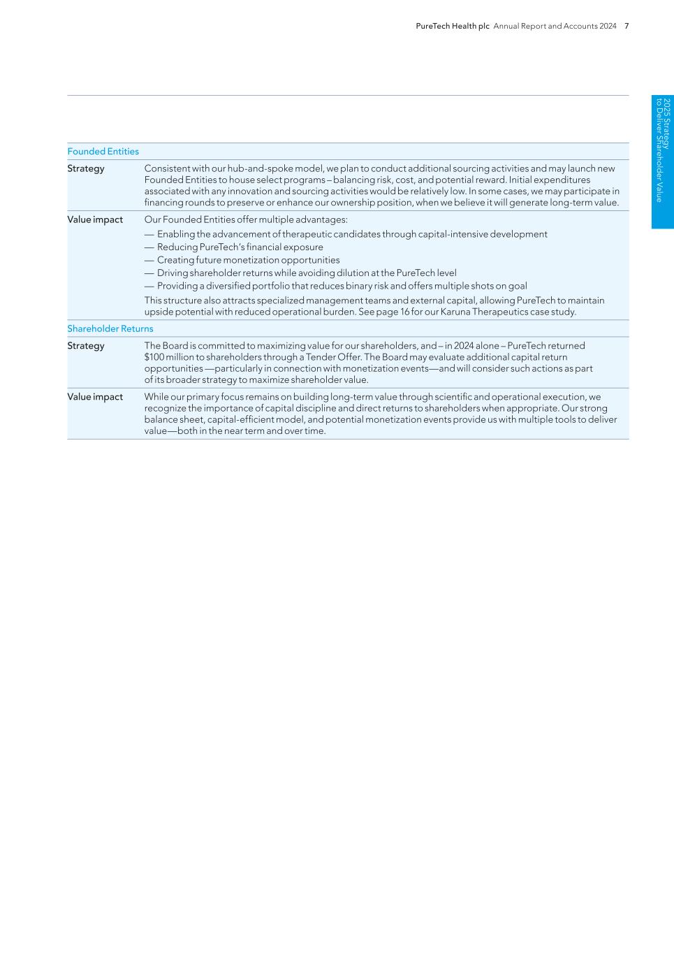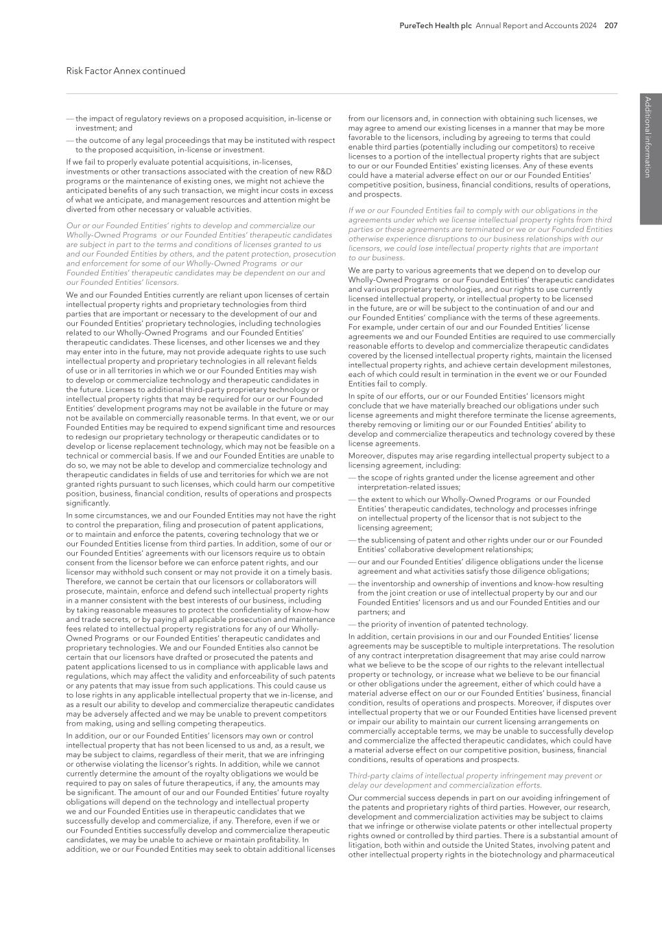 PureTech Health plc Annual Report and Accounts 2024 207 Risk Factor Annex continued A d d itio nal info rm atio n from our licensors and, in connection with obtaining such licenses, we may agree to amend our existing licenses in a manner that may be more favorable to the licensors, including by agreeing to terms that could enable third parties (potentially including our competitors) to receive licenses to a portion of the intellectual property rights that are subject to our or our Founded Entities’ existing licenses. Any of these events could have a material adverse effect on our or our Founded Entities’ competitive position, business, financial conditions, results of operations, and prospects. If we or our Founded Entities fail to comply with our obligations in the agreements under which we license intellectual property rights from third parties or these agreements are terminated or we or our Founded Entities otherwise experience disruptions to our business relationships with our licensors, we could lose intellectual property rights that are important to our business. We are party to various agreements that we depend on to develop our Wholly-Owned Programs or our Founded Entities’ therapeutic candidates and various proprietary technologies, and our rights to use currently licensed intellectual property, or intellectual property to be licensed in the future, are or will be subject to the continuation of and our and our Founded Entities’ compliance with the terms of these agreements. For example, under certain of our and our Founded Entities’ license agreements we and our Founded Entities are required to use commercially reasonable efforts to develop and commercialize therapeutic candidates covered by the licensed intellectual property rights, maintain the licensed intellectual property rights, and achieve certain development milestones, each of which could result in termination in the event we or our Founded Entities fail to comply. In spite of our efforts, our or our Founded Entities’ licensors might conclude that we have materially breached our obligations under such license agreements and might therefore terminate the license agreements, thereby removing or limiting our or our Founded Entities’ ability to develop and commercialize therapeutics and technology covered by these license agreements. Moreover, disputes may arise regarding intellectual property subject to a licensing agreement, including: — the scope of rights granted under the license agreement and other interpretation-related issues; — the extent to which our Wholly-Owned Programs or our Founded Entities’ therapeutic candidates, technology and processes infringe on intellectual property of the licensor that is not subject to the licensing agreement; — the sublicensing of patent and other rights under our or our Founded Entities’ collaborative development relationships; — our and our Founded Entities’ diligence obligations under the license agreement and what activities satisfy those diligence obligations; — the inventorship and ownership of inventions and know-how resulting from the joint creation or use of intellectual property by our and our Founded Entities’ licensors and us and our Founded Entities and our partners; and — the priority of invention of patented technology. In addition, certain provisions in our and our Founded Entities’ license agreements may be susceptible to multiple interpretations. The resolution of any contract interpretation disagreement that may arise could narrow what we believe to be the scope of our rights to the relevant intellectual property or technology, or increase what we believe to be our financial or other obligations under the agreement, either of which could have a material adverse effect on our or our Founded Entities’ business, financial condition, results of operations and prospects. Moreover, if disputes over intellectual property that we or our Founded Entities have licensed prevent or impair our ability to maintain our current licensing arrangements on commercially acceptable terms, we may be unable to successfully develop and commercialize the affected therapeutic candidates, which could have a material adverse effect on our competitive position, business, financial conditions, results of operations and prospects. Third-party claims of intellectual property infringement may prevent or delay our development and commercialization efforts. Our commercial success depends in part on our avoiding infringement of the patents and proprietary rights of third parties. However, our research, development and commercialization activities may be subject to claims that we infringe or otherwise violate patents or other intellectual property rights owned or controlled by third parties. There is a substantial amount of litigation, both within and outside the United States, involving patent and other intellectual property rights in the biotechnology and pharmaceutical — the impact of regulatory reviews on a proposed acquisition, in-license or investment; and — the outcome of any legal proceedings that may be instituted with respect to the proposed acquisition, in-license or investment. If we fail to properly evaluate potential acquisitions, in-licenses, investments or other transactions associated with the creation of new R&D programs or the maintenance of existing ones, we might not achieve the anticipated benefits of any such transaction, we might incur costs in excess of what we anticipate, and management resources and attention might be diverted from other necessary or valuable activities. Our or our Founded Entities’ rights to develop and commercialize our Wholly-Owned Programs or our Founded Entities’ therapeutic candidates are subject in part to the terms and conditions of licenses granted to us and our Founded Entities by others, and the patent protection, prosecution and enforcement for some of our Wholly-Owned Programs or our Founded Entitie