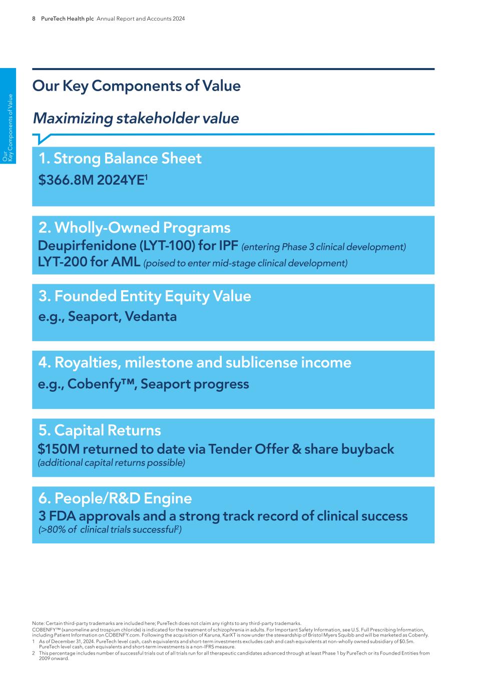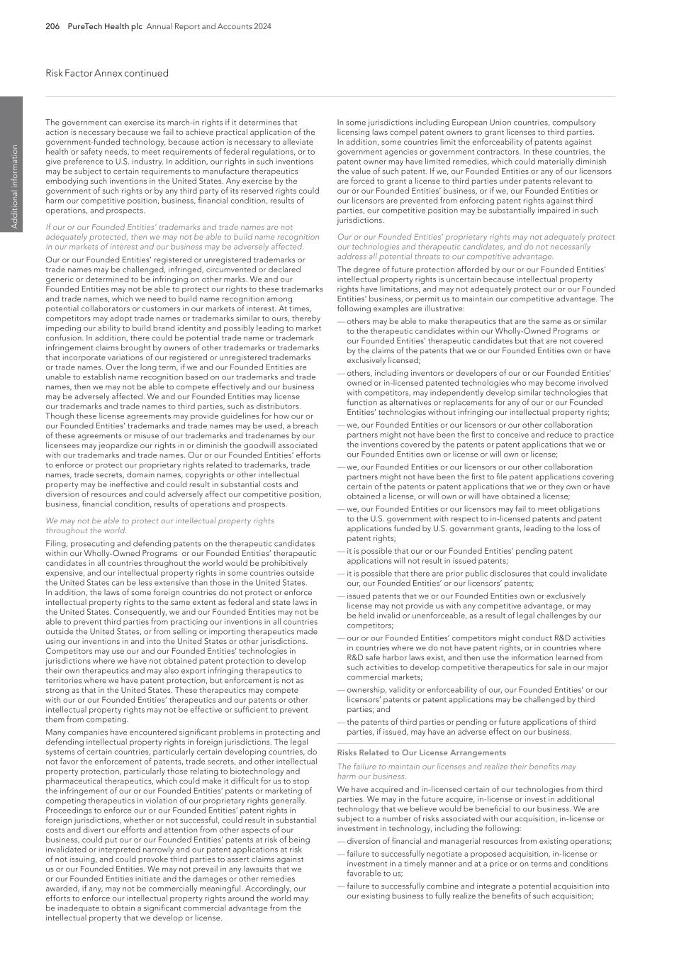 206 PureTech Health plc Annual Report and Accounts 2024 Risk Factor Annex continued A d d it io na l i nf o rm at io n In some jurisdictions including European Union countries, compulsory licensing laws compel patent owners to grant licenses to third parties. In addition, some countries limit the enforceability of patents against government agencies or government contractors. In these countries, the patent owner may have limited remedies, which could materially diminish the value of such patent. If we, our Founded Entities or any of our licensors are forced to grant a license to third parties under patents relevant to our or our Founded Entities’ business, or if we, our Founded Entities or our licensors are prevented from enforcing patent rights against third parties, our competitive position may be substantially impaired in such jurisdictions. Our or our Founded Entities’ proprietary rights may not adequately protect our technologies and therapeutic candidates, and do not necessarily address all potential threats to our competitive advantage. The degree of future protection afforded by our or our Founded Entities’ intellectual property rights is uncertain because intellectual property rights have limitations, and may not adequately protect our or our Founded Entities’ business, or permit us to maintain our competitive advantage. The following examples are illustrative: — others may be able to make therapeutics that are the same as or similar to the therapeutic candidates within our Wholly-Owned Programs or our Founded Entities’ therapeutic candidates but that are not covered by the claims of the patents that we or our Founded Entities own or have exclusively licensed; — others, including inventors or developers of our or our Founded Entities’ owned or in-licensed patented technologies who may become involved with competitors, may independently develop similar technologies that function as alternatives or replacements for any of our or our Founded Entities’ technologies without infringing our intellectual property rights; — we, our Founded Entities or our licensors or our other collaboration partners might not have been the first to conceive and reduce to practice the inventions covered by the patents or patent applications that we or our Founded Entities own or license or will own or license; — we, our Founded Entities or our licensors or our other collaboration partners might not have been the first to file patent applications covering certain of the patents or patent applications that we or they own or have obtained a license, or will own or will have obtained a license; — we, our Founded Entities or our licensors may fail to meet obligations to the U.S. government with respect to in-licensed patents and patent applications funded by U.S. government grants, leading to the loss of patent rights; — it is possible that our or our Founded Entities’ pending patent applications will not result in issued patents; — it is possible that there are prior public disclosures that could invalidate our, our Founded Entities’ or our licensors’ patents; — issued patents that we or our Founded Entities own or exclusively license may not provide us with any competitive advantage, or may be held invalid or unenforceable, as a result of legal challenges by our competitors; — our or our Founded Entities’ competitors might conduct R&D activities in countries where we do not have patent rights, or in countries where R&D safe harbor laws exist, and then use the information learned from such activities to develop competitive therapeutics for sale in our major commercial markets; — ownership, validity or enforceability of our, our Founded Entities’ or our licensors’ patents or patent applications may be challenged by third parties; and — the patents of third parties or pending or future applications of third parties, if issued, may have an adverse effect on our business. Risks Related to Our License Arrangements The failure to maintain our licenses and realize their benefits may harm our business. We have acquired and in-licensed certain of our technologies from third parties. We may in the future acquire, in-license or invest in additional technology that we believe would be beneficial to our business. We are subject to a number of risks associated with our acquisition, in-license or investment in technology, including the following: — diversion of financial and managerial resources from existing operations; — failure to successfully negotiate a proposed acquisition, in-license or investment in a timely manner and at a price or on terms and conditions favorable to us; — failure to successfully combine and integrate a potential acquisition into our existing business to fully realize the benefits of such acquisition; The government can exercise its march-in rights if it determines that action is necessary because we fail to achieve practical application of the government-funded technology, because action is necessary to alleviate health or safety needs, to meet requirements of federal regulations, or to give preference to U.S. industry. In addition, our rights in such inventions may be subject to certain requirements to manufacture therapeutics embodying such inventions in the United States. Any exercise by the government of such rights or by any third party of its reserved rights could harm our competitive position, business, financial condition, results of operations, and prospects. If our or our Founded Entities’ trademarks and trade names are not adequately protected, then we may not be able to build name recognition in our markets of interest and our business may be adversely affected. Our or our Founded Entities’ registered or unregistered trademarks or trade names may be challenged, infringed, circumvented or declared generic or determined to be infringing on other marks. We and our Founded Entities may not be able to protect our rights to these tr