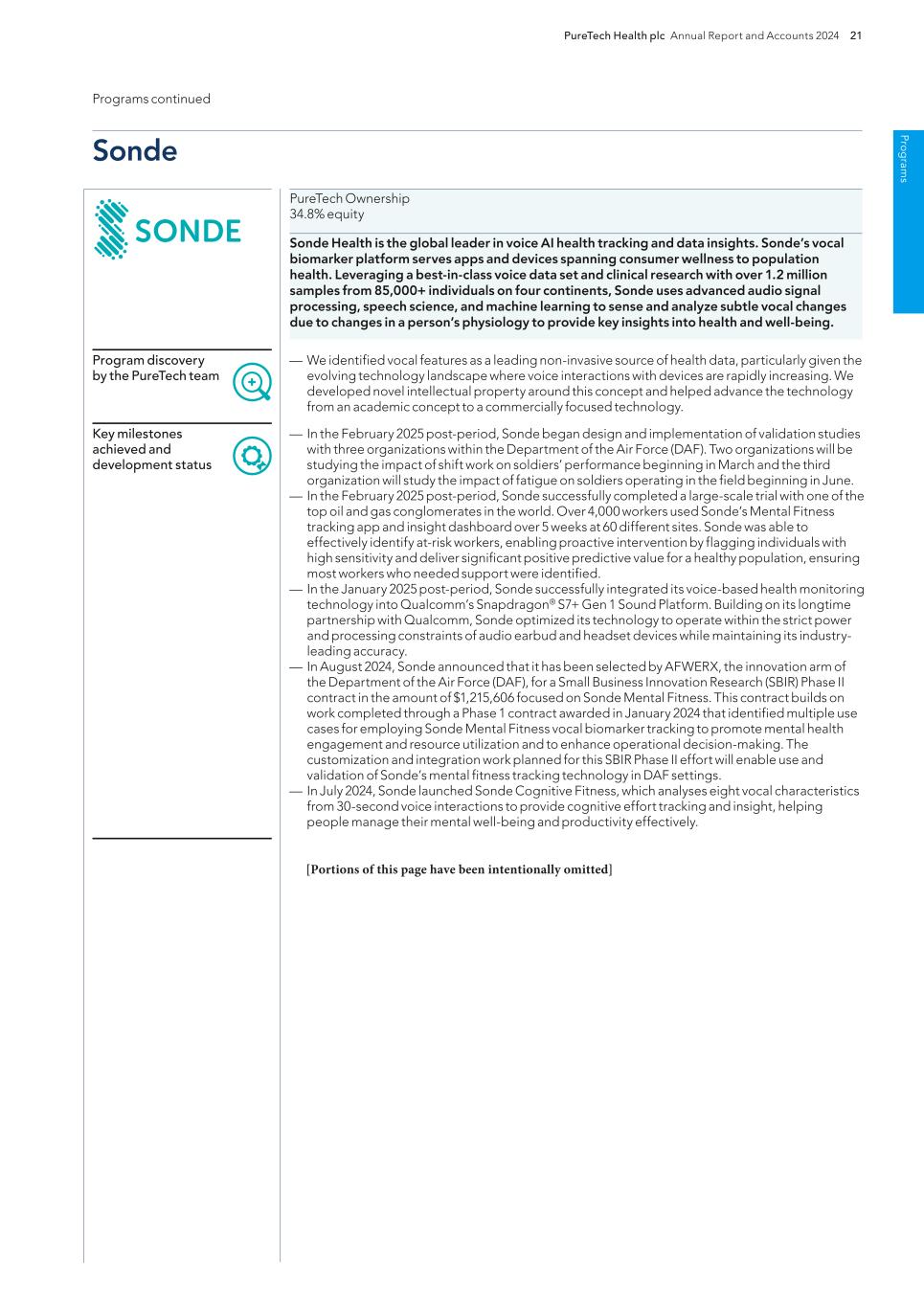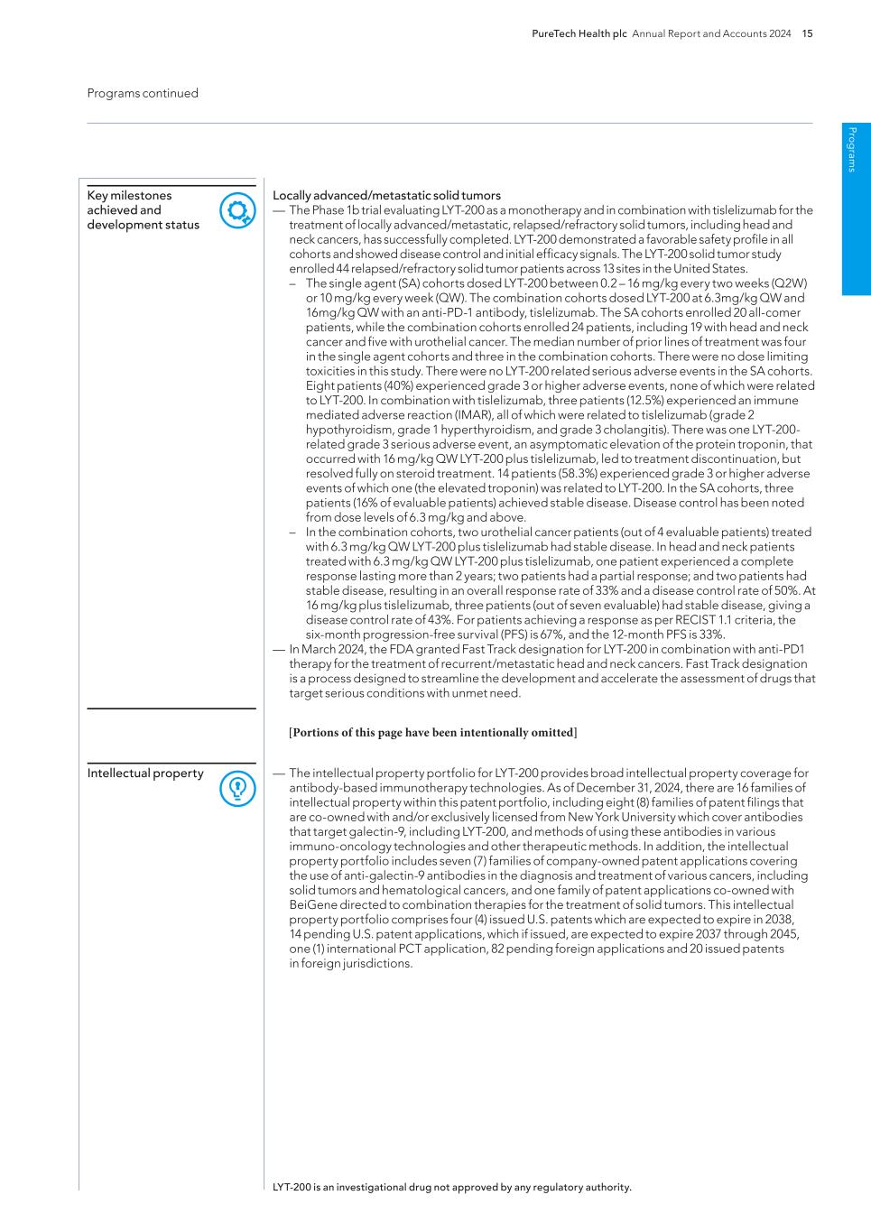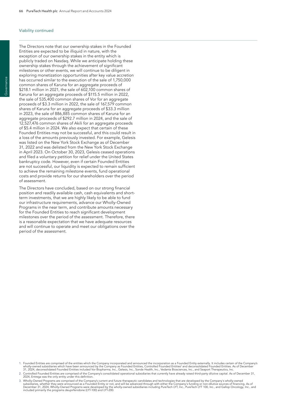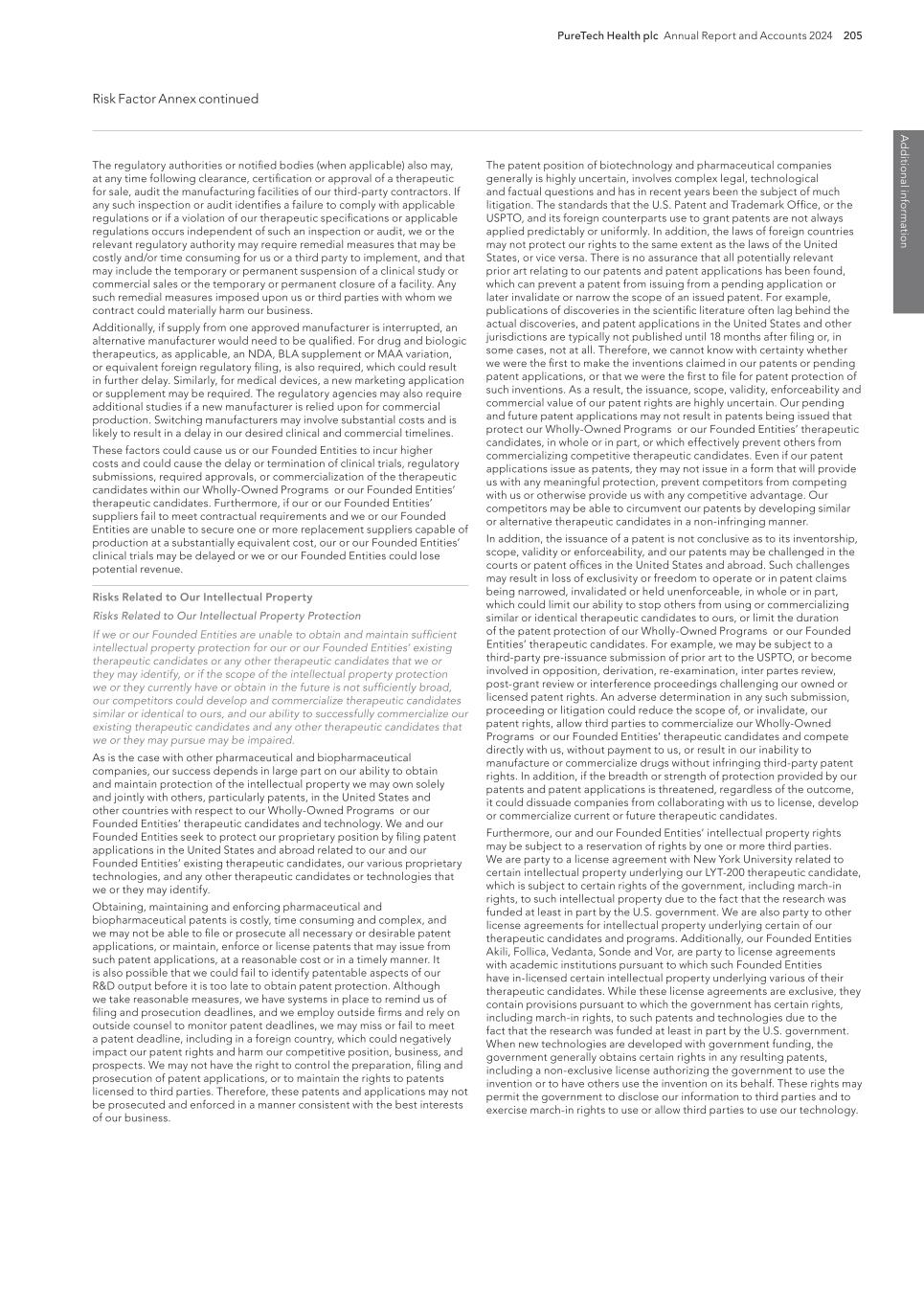 PureTech Health plc Annual Report and Accounts 2024 205 Risk Factor Annex continued A d d itio nal info rm atio n The patent position of biotechnology and pharmaceutical companies generally is highly uncertain, involves complex legal, technological and factual questions and has in recent years been the subject of much litigation. The standards that the U.S. Patent and Trademark Office, or the USPTO, and its foreign counterparts use to grant patents are not always applied predictably or uniformly. In addition, the laws of foreign countries may not protect our rights to the same extent as the laws of the United States, or vice versa. There is no assurance that all potentially relevant prior art relating to our patents and patent applications has been found, which can prevent a patent from issuing from a pending application or later invalidate or narrow the scope of an issued patent. For example, publications of discoveries in the scientific literature often lag behind the actual discoveries, and patent applications in the United States and other jurisdictions are typically not published until 18 months after filing or, in some cases, not at all. Therefore, we cannot know with certainty whether we were the first to make the inventions claimed in our patents or pending patent applications, or that we were the first to file for patent protection of such inventions. As a result, the issuance, scope, validity, enforceability and commercial value of our patent rights are highly uncertain. Our pending and future patent applications may not result in patents being issued that protect our Wholly-Owned Programs or our Founded Entities’ therapeutic candidates, in whole or in part, or which effectively prevent others from commercializing competitive therapeutic candidates. Even if our patent applications issue as patents, they may not issue in a form that will provide us with any meaningful protection, prevent competitors from competing with us or otherwise provide us with any competitive advantage. Our competitors may be able to circumvent our patents by developing similar or alternative therapeutic candidates in a non-infringing manner. In addition, the issuance of a patent is not conclusive as to its inventorship, scope, validity or enforceability, and our patents may be challenged in the courts or patent offices in the United States and abroad. Such challenges may result in loss of exclusivity or freedom to operate or in patent claims being narrowed, invalidated or held unenforceable, in whole or in part, which could limit our ability to stop others from using or commercializing similar or identical therapeutic candidates to ours, or limit the duration of the patent protection of our Wholly-Owned Programs or our Founded Entities’ therapeutic candidates. For example, we may be subject to a third-party pre-issuance submission of prior art to the USPTO, or become involved in opposition, derivation, re-examination, inter partes review, post-grant review or interference proceedings challenging our owned or licensed patent rights. An adverse determination in any such submission, proceeding or litigation could reduce the scope of, or invalidate, our patent rights, allow third parties to commercialize our Wholly-Owned Programs or our Founded Entities’ therapeutic candidates and compete directly with us, without payment to us, or result in our inability to manufacture or commercialize drugs without infringing third-party patent rights. In addition, if the breadth or strength of protection provided by our patents and patent applications is threatened, regardless of the outcome, it could dissuade companies from collaborating with us to license, develop or commercialize current or future therapeutic candidates. Furthermore, our and our Founded Entities’ intellectual property rights may be subject to a reservation of rights by one or more third parties. We are party to a license agreement with New York University related to certain intellectual property underlying our LYT-200 therapeutic candidate, which is subject to certain rights of the government, including march-in rights, to such intellectual property due to the fact that the research was funded at least in part by the U.S. government. We are also party to other license agreements for intellectual property underlying certain of our therapeutic candidates and programs. Additionally, our Founded Entities Akili, Follica, Vedanta, Sonde and Vor, are party to license agreements with academic institutions pursuant to which such Founded Entities have in-licensed certain intellectual property underlying various of their therapeutic candidates. While these license agreements are exclusive, they contain provisions pursuant to which the government has certain rights, including march-in rights, to such patents and technologies due to the fact that the research was funded at least in part by the U.S. government. When new technologies are developed with government funding, the government generally obtains certain rights in any resulting patents, including a non-exclusive license authorizing the government to use the invention or to have others use the invention on its behalf. These rights may permit the government to disclose our information to third parties and to exercise march-in rights to use or allow third parties to use our technology. The regulatory authorities or notified bodies (when applicable) also may, at any time following clearance, certification or approval of a therapeutic for sale, audit the manufacturing facilities of our third-party contractors. If any such inspection or audit identifies a failure to comply with applicable regulations or if a violation of our therapeutic specifications or applicable regulations occurs independent of such an inspection or audit, we or the relevant regulatory authority may require remedial measures that may be costly and/or time consuming for us or a third party to implement, and that may include the temporary