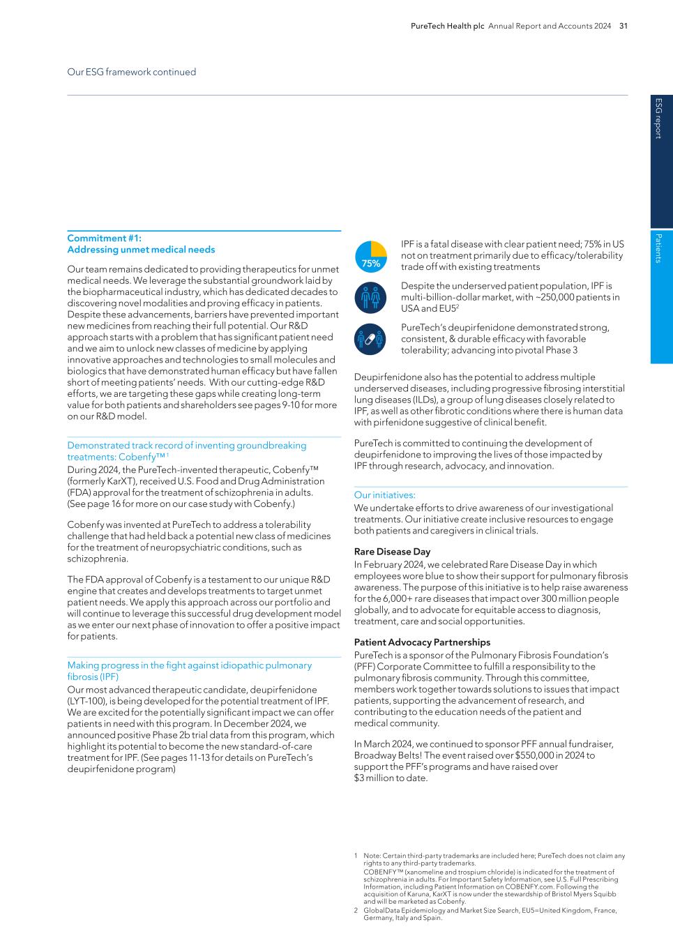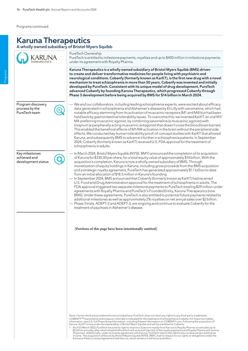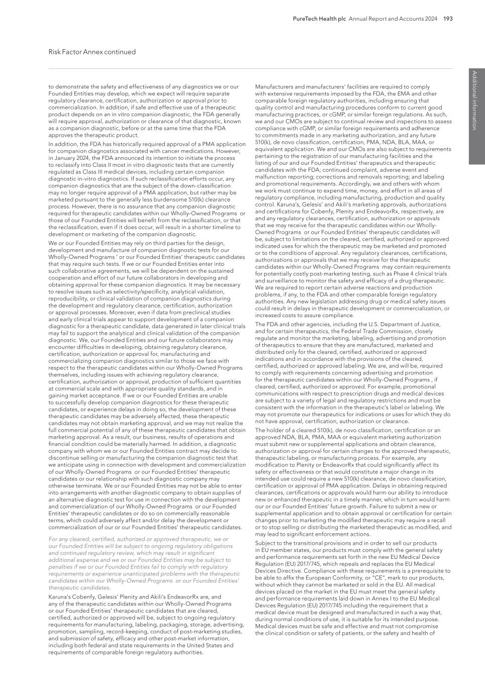 PureTech Health plc Annual Report and Accounts 2024 193 Risk Factor Annex continued A d d itio nal info rm atio n Manufacturers and manufacturers’ facilities are required to comply with extensive requirements imposed by the FDA, the EMA and other comparable foreign regulatory authorities, including ensuring that quality control and manufacturing procedures conform to current good manufacturing practices, or cGMP, or similar foreign regulations. As such, we and our CMOs are subject to continual review and inspections to assess compliance with cGMP, or similar foreign requirements and adherence to commitments made in any marketing authorization, and any future 510(k), de novo classification, certification, PMA, NDA, BLA, MAA, or equivalent application. We and our CMOs are also subject to requirements pertaining to the registration of our manufacturing facilities and the listing of our and our Founded Entities’ therapeutics and therapeutic candidates with the FDA; continued complaint, adverse event and malfunction reporting; corrections and removals reporting; and labeling and promotional requirements. Accordingly, we and others with whom we work must continue to expend time, money, and effort in all areas of regulatory compliance, including manufacturing, production and quality control. Karuna’s, Gelesis’ and Akili’s marketing approvals, authorizations and certifications for Cobenfy, Plenity and EndeavorRx, respectively, are and any regulatory clearances, certification, authorization or approvals that we may receive for the therapeutic candidates within our Wholly- Owned Programs or our Founded Entities’ therapeutic candidates will be, subject to limitations on the cleared, certified, authorized or approved indicated uses for which the therapeutic may be marketed and promoted or to the conditions of approval. Any regulatory clearances, certifications, authorizations or approvals that we may receive for the therapeutic candidates within our Wholly-Owned Programs may contain requirements for potentially costly post-marketing testing, such as Phase 4 clinical trials and surveillance to monitor the safety and efficacy of a drug therapeutic. We are required to report certain adverse reactions and production problems, if any, to the FDA and other comparable foreign regulatory authorities. Any new legislation addressing drug or medical safety issues could result in delays in therapeutic development or commercialization, or increased costs to assure compliance. The FDA and other agencies, including the U.S. Department of Justice, and for certain therapeutics, the Federal Trade Commission, closely regulate and monitor the marketing, labeling, advertising and promotion of therapeutics to ensure that they are manufactured, marketed and distributed only for the cleared, certified, authorized or approved indications and in accordance with the provisions of the cleared, certified, authorized or approved labeling. We are, and will be, required to comply with requirements concerning advertising and promotion for the therapeutic candidates within our Wholly-Owned Programs , if cleared, certified, authorized or approved. For example, promotional communications with respect to prescription drugs and medical devices are subject to a variety of legal and regulatory restrictions and must be consistent with the information in the therapeutic’s label or labeling. We may not promote our therapeutics for indications or uses for which they do not have approval, certification, authorization or clearance. The holder of a cleared 510(k), de novo classification, certification or an approved NDA, BLA, PMA, MAA or equivalent marketing authorization must submit new or supplemental applications and obtain clearance, authorization or approval for certain changes to the approved therapeutic, therapeutic labeling, or manufacturing process. For example, any modification to Plenity or EndeavorRx that could significantly affect its safety or effectiveness or that would constitute a major change in its intended use could require a new 510(k) clearance, de novo classification, certification or approval of PMA application. Delays in obtaining required clearances, certifications or approvals would harm our ability to introduce new or enhanced therapeutic in a timely manner, which in turn would harm our or our Founded Entities’ future growth. Failure to submit a new or supplemental application and to obtain approval or certification for certain changes prior to marketing the modified therapeutic may require a recall or to stop selling or distributing the marketed therapeutic as modified, and may lead to significant enforcement actions. Subject to the transitional provisions and in order to sell our products in EU member states, our products must comply with the general safety and performance requirements set forth in the new EU Medical Device Regulation (EU) 2017/745, which repeals and replaces the EU Medical Devices Directive. Compliance with these requirements is a prerequisite to be able to affix the European Conformity, or “CE”, mark to our products, without which they cannot be marketed or sold in the EU. All medical devices placed on the market in the EU must meet the general safety and performance requirements laid down in Annex I to the EU Medical Devices Regulation (EU) 2017/745 including the requirement that a medical device must be designed and manufactured in such a way that, during normal conditions of use, it is suitable for its intended purpose. Medical devices must be safe and effective and must not compromise the clinical condition or safety of patients, or the safety and health of to demonstrate the safety and effectiveness of any diagnostics we or our Founded Entities may develop, which we expect will require separate regulatory clearance, certification, authorization or approval prior to commercialization. In addition, if safe and effective use of a therapeutic product depends on an in vitro com