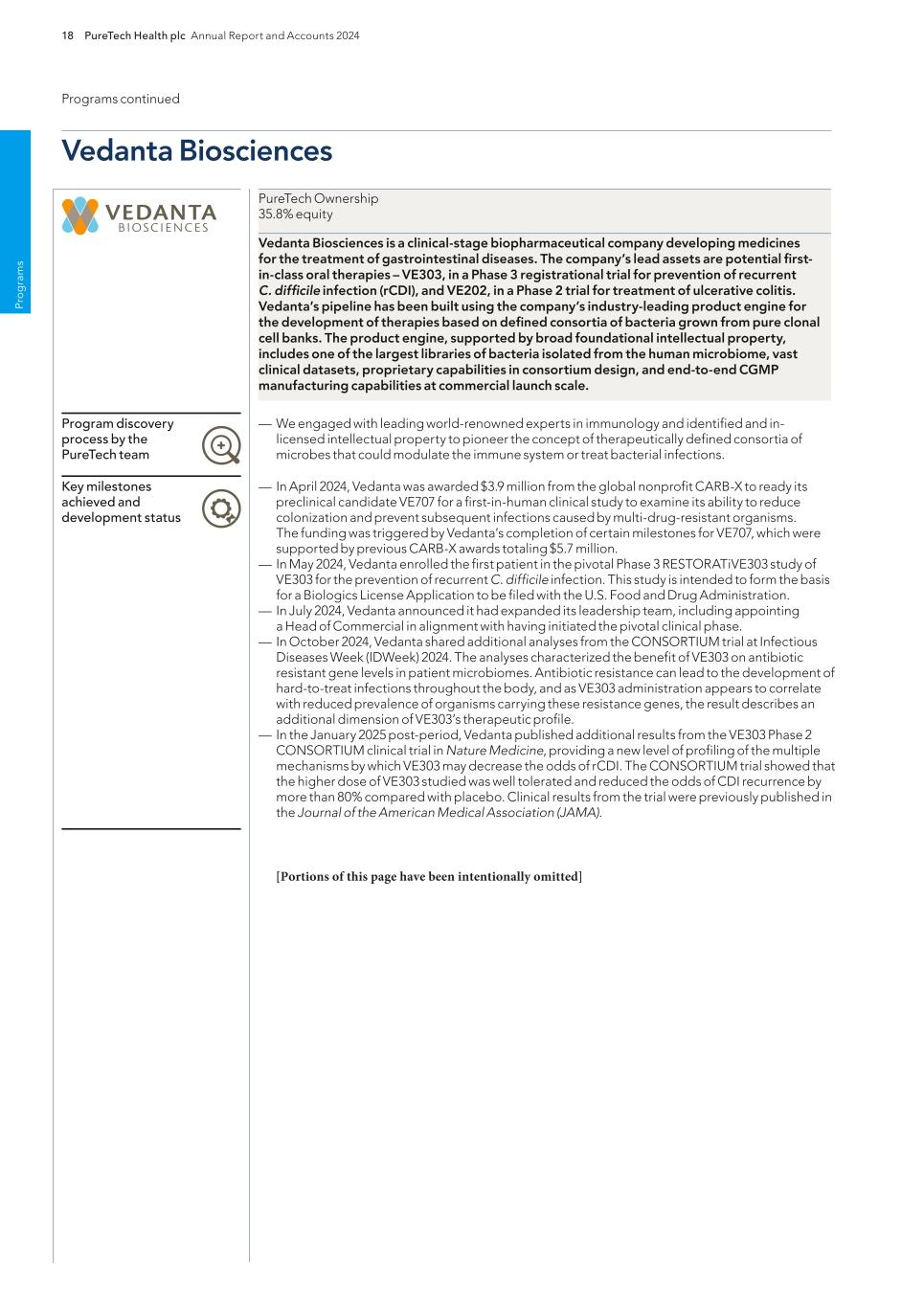 PureTech Health plc Annual Report and Accounts 2024 195 Risk Factor Annex continued A d d itio nal info rm atio n Risks Related to Manufacturing our Therapeutic Candidates or Those of our Founded Entities Certain of the therapeutic candidates being developed by us or our Founded Entities rely or may rely on third-party manufacturers outside of the United States. Certain of our therapeutic candidates within our Wholly-Owned Programs or our Founded Entities’ therapeutic candidates are currently or may in the future be manufactured outside of the United States. In certain years, the U.S. government has initiated substantial changes in U.S. trade policy and U.S. trade agreements, including the initiation of tariffs on certain foreign goods. In response to these tariffs, certain foreign governments, including Canada, China and Mexico, have instituted or are considering imposing tariffs on certain U.S. goods. If the U.S. imposes additional tariffs on a broader range of imports from certain countries, and in response those countries take further retaliatory trade measures. These actions could impose additional costs on our business. Certain of the therapeutic candidates being developed by us or our Founded Entities are novel, complex and difficult to manufacture. We could experience manufacturing problems that result in delays in our development or commercialization programs or otherwise harm our business. The manufacturing processes our CMOs use to produce our and our Founded Entities’ therapeutic candidates are complex and in certain cases novel. Several factors could cause production interruptions, including inability to develop novel manufacturing processes, equipment malfunctions, facility contamination, raw material shortages or contamination, natural disasters, disruption in utility services, human error or disruptions in the operations of our suppliers, including acquisition of the supplier by a third party or declaration of bankruptcy. For example, Vedanta has its own proprietary cGMP manufacturing facilities for certain therapeutic candidates, including VE202, VE303, VE800 and VE416. Creating defined consortia of live microbial therapeutics for these therapeutic candidates is inherently complex, and therefore can be vulnerable to delays. The expertise required to manufacture these therapeutic candidates is unique to Vedanta, and as a result, it would be difficult and time consuming to find an alternative CMO. In addition, manufacturing of clinical supply for certain of our therapeutic candidates is dependent on third party CMOs, and manufacturing such therapeutic candidates is inherently complex. Some of our and our Founded Entities’ therapeutic candidates include biologics, some of which have physical and chemical properties that cannot be fully characterized. As a result, assays of the finished product may not be sufficient to ensure that the therapeutic candidate is consistent from lot-to-lot or will perform in the intended manner. Accordingly, our CMOs must employ multiple steps to control the manufacturing process to assure that the process is reproducible and the therapeutic candidate is made strictly and consistently in compliance with the process. Problems with the manufacturing process, even minor deviations from the normal process, could result in therapeutic defects or manufacturing failures that result in lot failures, therapeutic recalls, product liability claims or insufficient inventory to conduct clinical trials or supply commercial markets. We or our Founded Entities may encounter problems achieving adequate quantities and quality of clinical-grade materials that meet the FDA, the EMA or other applicable standards or specifications with consistent and acceptable production yields and costs. In addition, the FDA and other foreign regulatory authorities may require us or our Founded Entities to submit samples of any lot of any approved therapeutic together with the protocols showing the results of applicable tests at any time. Under some circumstances, the FDA or other foreign regulatory authorities may require that we or our Founded Entities not distribute a lot until the agency authorizes its release. Slight deviations in the manufacturing process, including those affecting quality attributes and stability, may result in unacceptable changes in the therapeutic that could result in lot failures or therapeutic recalls. Lot failures or therapeutic recalls could cause us or our Founded Entities to delay therapeutic launches or clinical trials, which could be costly to us and otherwise harm our business, financial condition, results of operations and prospects. Various states also independently regulate controlled substances. Though state controlled substances laws often mirror federal law, because the states are separate jurisdictions, they may separately schedule drugs as well. While some states automatically schedule a drug when the DEA does so, in other states there must be rulemaking or a legislative action. State scheduling may delay commercial sale of any controlled substance drug product for which we obtain federal regulatory approval and adverse scheduling could impair the commercial attractiveness of such product. We or our collaborators must also obtain separate state registrations in order to be able to obtain, handle and distribute controlled substances for clinical trials or commercial sale, and failure to meet applicable regulatory requirements could lead to enforcement and sanctions from the states in addition to those from the DEA or otherwise arising under federal law. For any of our products or therapeutic candidates classified as controlled substances, we and our suppliers, manufacturers, contractors, customers and distributors are required to obtain and maintain applicable registrations from state, federal and foreign law enforcement and regulatory agencies and comply with state, federal and foreign laws and regulations regarding the manufacture,