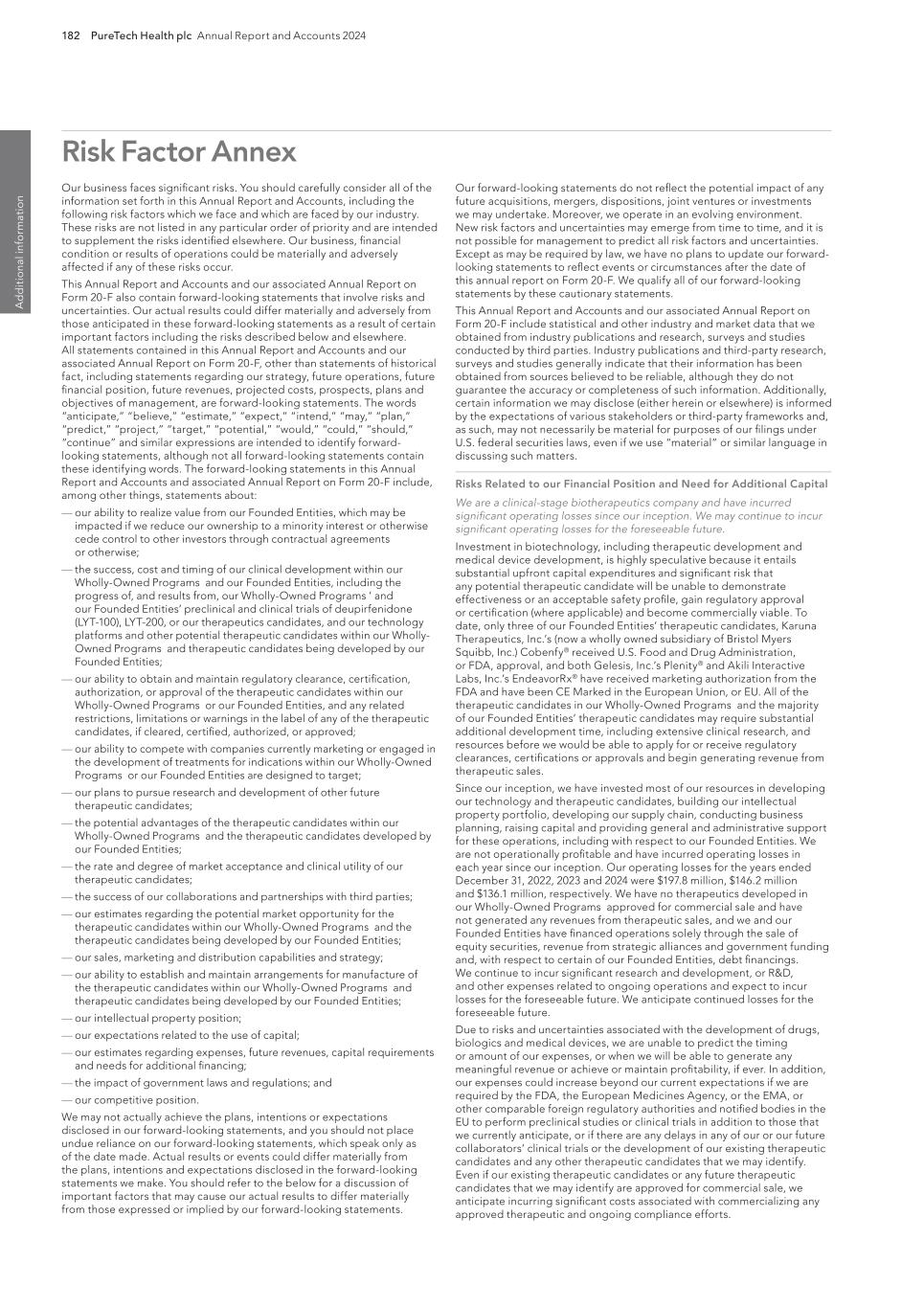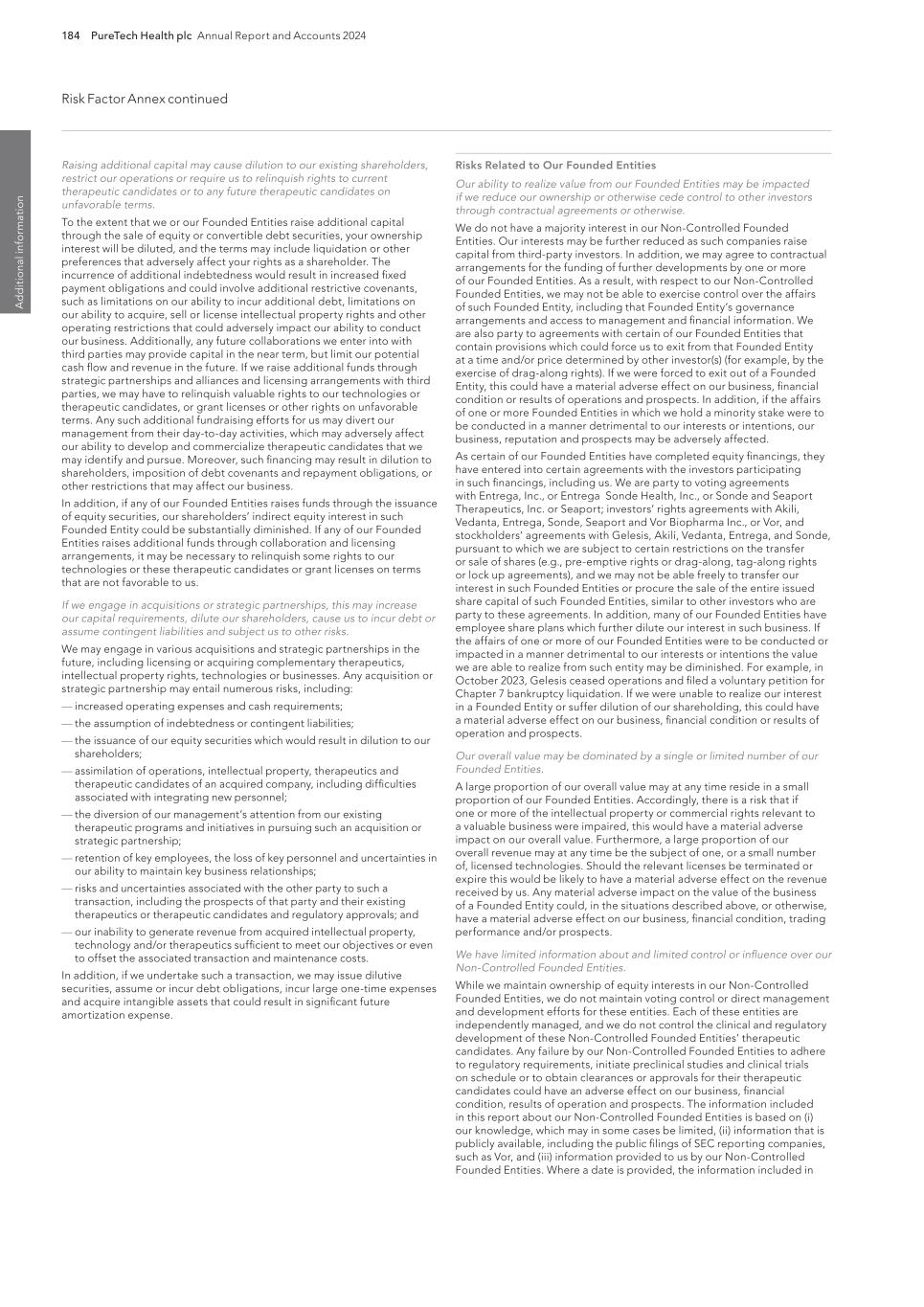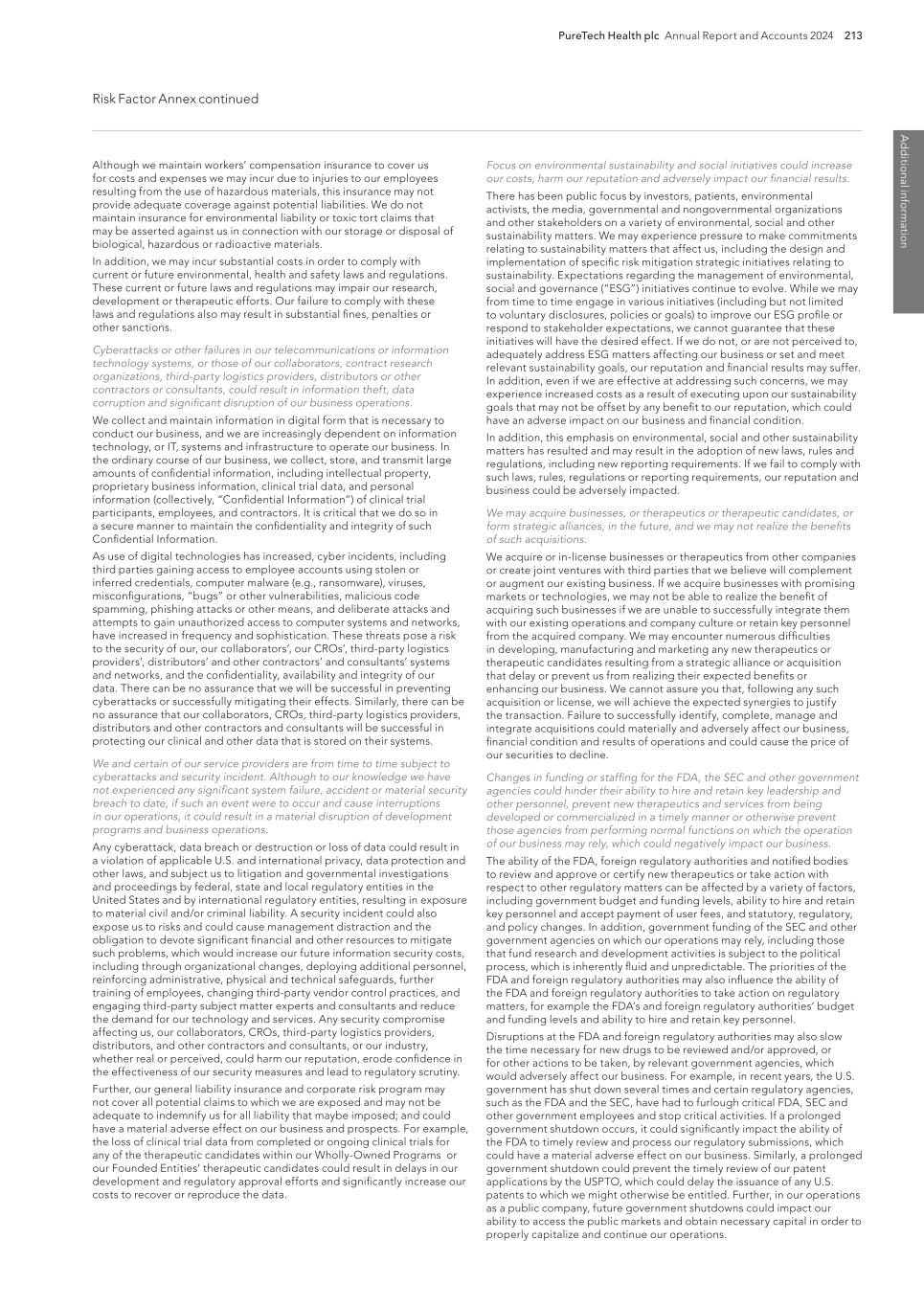 PureTech Health plc Annual Report and Accounts 2024 213 Risk Factor Annex continued A d d itio nal info rm atio n Focus on environmental sustainability and social initiatives could increase our costs, harm our reputation and adversely impact our financial results. There has been public focus by investors, patients, environmental activists, the media, governmental and nongovernmental organizations and other stakeholders on a variety of environmental, social and other sustainability matters. We may experience pressure to make commitments relating to sustainability matters that affect us, including the design and implementation of specific risk mitigation strategic initiatives relating to sustainability. Expectations regarding the management of environmental, social and governance (“ESG”) initiatives continue to evolve. While we may from time to time engage in various initiatives (including but not limited to voluntary disclosures, policies or goals) to improve our ESG profile or respond to stakeholder expectations, we cannot guarantee that these initiatives will have the desired effect. If we do not, or are not perceived to, adequately address ESG matters affecting our business or set and meet relevant sustainability goals, our reputation and financial results may suffer. In addition, even if we are effective at addressing such concerns, we may experience increased costs as a result of executing upon our sustainability goals that may not be offset by any benefit to our reputation, which could have an adverse impact on our business and financial condition. In addition, this emphasis on environmental, social and other sustainability matters has resulted and may result in the adoption of new laws, rules and regulations, including new reporting requirements. If we fail to comply with such laws, rules, regulations or reporting requirements, our reputation and business could be adversely impacted. We may acquire businesses, or therapeutics or therapeutic candidates, or form strategic alliances, in the future, and we may not realize the benefits of such acquisitions. We acquire or in-license businesses or therapeutics from other companies or create joint ventures with third parties that we believe will complement or augment our existing business. If we acquire businesses with promising markets or technologies, we may not be able to realize the benefit of acquiring such businesses if we are unable to successfully integrate them with our existing operations and company culture or retain key personnel from the acquired company. We may encounter numerous difficulties in developing, manufacturing and marketing any new therapeutics or therapeutic candidates resulting from a strategic alliance or acquisition that delay or prevent us from realizing their expected benefits or enhancing our business. We cannot assure you that, following any such acquisition or license, we will achieve the expected synergies to justify the transaction. Failure to successfully identify, complete, manage and integrate acquisitions could materially and adversely affect our business, financial condition and results of operations and could cause the price of our securities to decline. Changes in funding or staffing for the FDA, the SEC and other government agencies could hinder their ability to hire and retain key leadership and other personnel, prevent new therapeutics and services from being developed or commercialized in a timely manner or otherwise prevent those agencies from performing normal functions on which the operation of our business may rely, which could negatively impact our business. The ability of the FDA, foreign regulatory authorities and notified bodies to review and approve or certify new therapeutics or take action with respect to other regulatory matters can be affected by a variety of factors, including government budget and funding levels, ability to hire and retain key personnel and accept payment of user fees, and statutory, regulatory, and policy changes. In addition, government funding of the SEC and other government agencies on which our operations may rely, including those that fund research and development activities is subject to the political process, which is inherently fluid and unpredictable. The priorities of the FDA and foreign regulatory authorities may also influence the ability of the FDA and foreign regulatory authorities to take action on regulatory matters, for example the FDA’s and foreign regulatory authorities’ budget and funding levels and ability to hire and retain key personnel. Disruptions at the FDA and foreign regulatory authorities may also slow the time necessary for new drugs to be reviewed and/or approved, or for other actions to be taken, by relevant government agencies, which would adversely affect our business. For example, in recent years, the U.S. government has shut down several times and certain regulatory agencies, such as the FDA and the SEC, have had to furlough critical FDA, SEC and other government employees and stop critical activities. If a prolonged government shutdown occurs, it could significantly impact the ability of the FDA to timely review and process our regulatory submissions, which could have a material adverse effect on our business. Similarly, a prolonged government shutdown could prevent the timely review of our patent applications by the USPTO, which could delay the issuance of any U.S. patents to which we might otherwise be entitled. Further, in our operations as a public company, future government shutdowns could impact our ability to access the public markets and obtain necessary capital in order to properly capitalize and continue our operations. Although we maintain workers’ compensation insurance to cover us for costs and expenses we may incur due to injuries to our employees resulting from the use of hazardous materials, this insurance may not provide adequate coverage against potential liabilities. We do not maintain insurance 