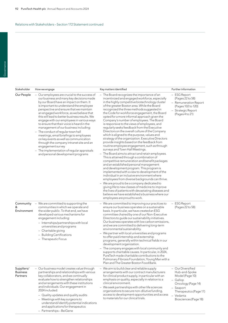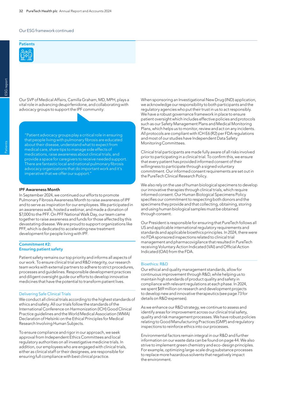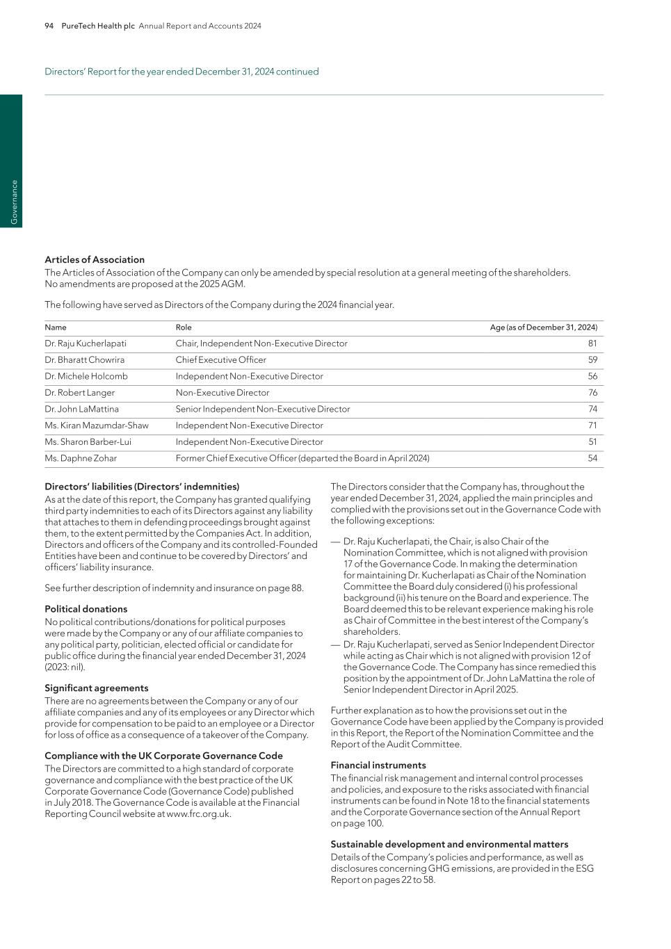 PureTech Health plc Annual Report and Accounts 2024 213 Risk Factor Annex continued A d d itio nal info rm atio n Focus on environmental sustainability and social initiatives could increase our costs, harm our reputation and adversely impact our financial results. There has been public focus by investors, patients, environmental activists, the media, governmental and nongovernmental organizations and other stakeholders on a variety of environmental, social and other sustainability matters. We may experience pressure to make commitments relating to sustainability matters that affect us, including the design and implementation of specific risk mitigation strategic initiatives relating to sustainability. Expectations regarding the management of environmental, social and governance (“ESG”) initiatives continue to evolve. While we may from time to time engage in various initiatives (including but not limited to voluntary disclosures, policies or goals) to improve our ESG profile or respond to stakeholder expectations, we cannot guarantee that these initiatives will have the desired effect. If we do not, or are not perceived to, adequately address ESG matters affecting our business or set and meet relevant sustainability goals, our reputation and financial results may suffer. In addition, even if we are effective at addressing such concerns, we may experience increased costs as a result of executing upon our sustainability goals that may not be offset by any benefit to our reputation, which could have an adverse impact on our business and financial condition. In addition, this emphasis on environmental, social and other sustainability matters has resulted and may result in the adoption of new laws, rules and regulations, including new reporting requirements. If we fail to comply with such laws, rules, regulations or reporting requirements, our reputation and business could be adversely impacted. We may acquire businesses, or therapeutics or therapeutic candidates, or form strategic alliances, in the future, and we may not realize the benefits of such acquisitions. We acquire or in-license businesses or therapeutics from other companies or create joint ventures with third parties that we believe will complement or augment our existing business. If we acquire businesses with promising markets or technologies, we may not be able to realize the benefit of acquiring such businesses if we are unable to successfully integrate them with our existing operations and company culture or retain key personnel from the acquired company. We may encounter numerous difficulties in developing, manufacturing and marketing any new therapeutics or therapeutic candidates resulting from a strategic alliance or acquisition that delay or prevent us from realizing their expected benefits or enhancing our business. We cannot assure you that, following any such acquisition or license, we will achieve the expected synergies to justify the transaction. Failure to successfully identify, complete, manage and integrate acquisitions could materially and adversely affect our business, financial condition and results of operations and could cause the price of our securities to decline. Changes in funding or staffing for the FDA, the SEC and other government agencies could hinder their ability to hire and retain key leadership and other personnel, prevent new therapeutics and services from being developed or commercialized in a timely manner or otherwise prevent those agencies from performing normal functions on which the operation of our business may rely, which could negatively impact our business. The ability of the FDA, foreign regulatory authorities and notified bodies to review and approve or certify new therapeutics or take action with respect to other regulatory matters can be affected by a variety of factors, including government budget and funding levels, ability to hire and retain key personnel and accept payment of user fees, and statutory, regulatory, and policy changes. In addition, government funding of the SEC and other government agencies on which our operations may rely, including those that fund research and development activities is subject to the political process, which is inherently fluid and unpredictable. The priorities of the FDA and foreign regulatory authorities may also influence the ability of the FDA and foreign regulatory authorities to take action on regulatory matters, for example the FDA’s and foreign regulatory authorities’ budget and funding levels and ability to hire and retain key personnel. Disruptions at the FDA and foreign regulatory authorities may also slow the time necessary for new drugs to be reviewed and/or approved, or for other actions to be taken, by relevant government agencies, which would adversely affect our business. For example, in recent years, the U.S. government has shut down several times and certain regulatory agencies, such as the FDA and the SEC, have had to furlough critical FDA, SEC and other government employees and stop critical activities. If a prolonged government shutdown occurs, it could significantly impact the ability of the FDA to timely review and process our regulatory submissions, which could have a material adverse effect on our business. Similarly, a prolonged government shutdown could prevent the timely review of our patent applications by the USPTO, which could delay the issuance of any U.S. patents to which we might otherwise be entitled. Further, in our operations as a public company, future government shutdowns could impact our ability to access the public markets and obtain necessary capital in order to properly capitalize and continue our operations. Although we maintain workers’ compensation insurance to cover us for costs and expenses we may incur due to injuries to our employees resulting from the use of hazardous materials, this insurance may not provide adequate coverage against potential liabilities. We do not maintain insurance 