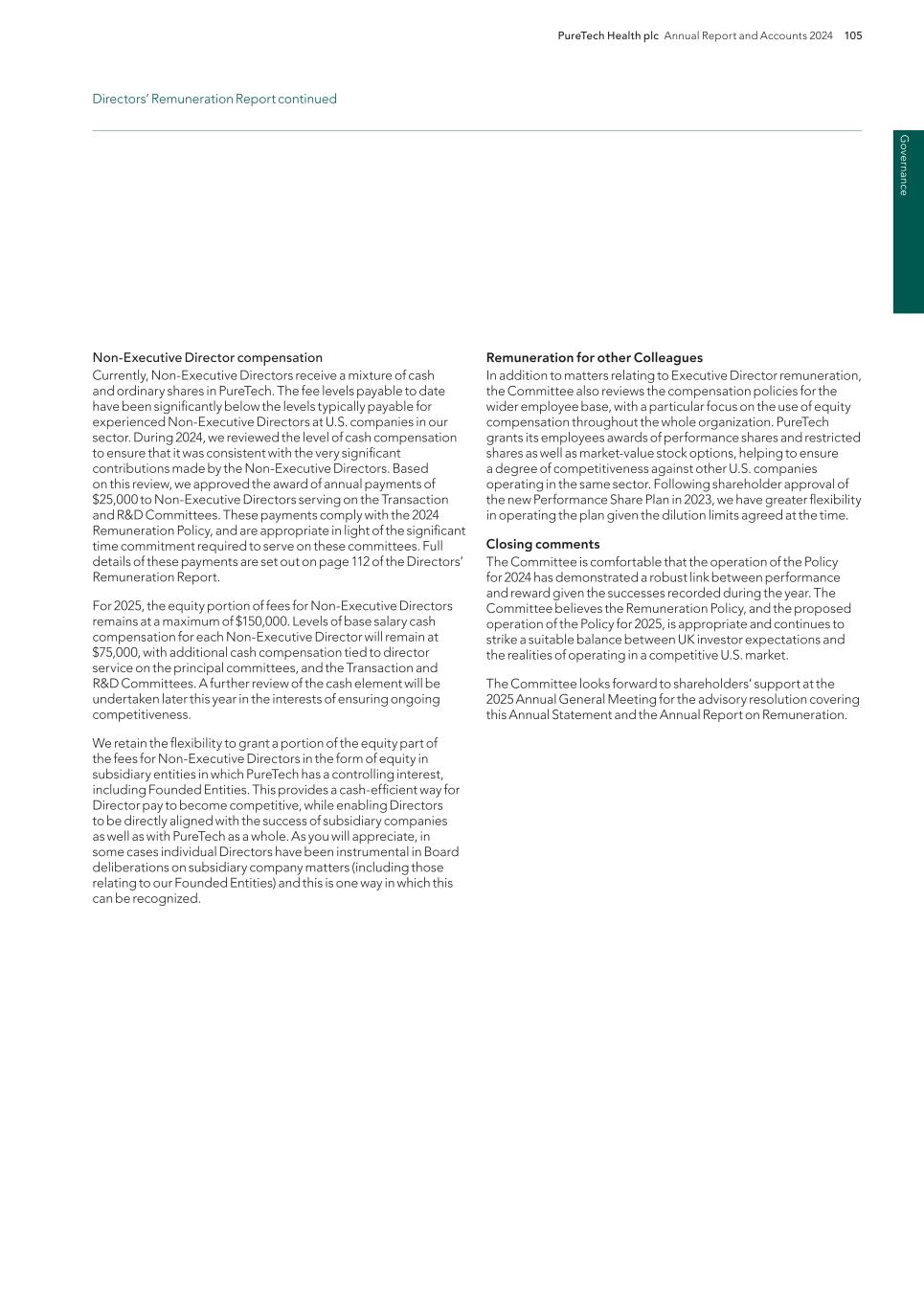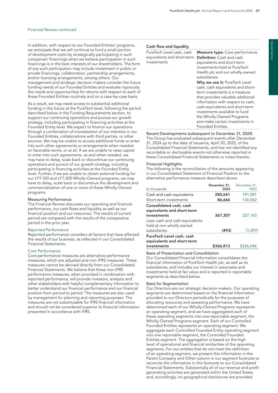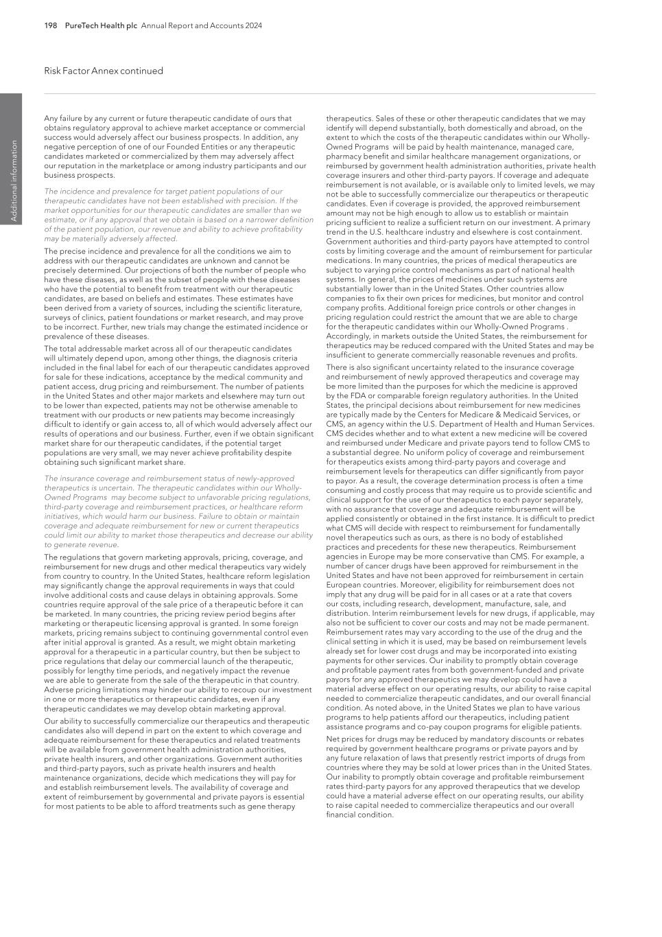198 PureTech Health plc Annual Report and Accounts 2024 Risk Factor Annex continued A d d it io na l i nf o rm at io n therapeutics. Sales of these or other therapeutic candidates that we may identify will depend substantially, both domestically and abroad, on the extent to which the costs of the therapeutic candidates within our Wholly- Owned Programs will be paid by health maintenance, managed care, pharmacy benefit and similar healthcare management organizations, or reimbursed by government health administration authorities, private health coverage insurers and other third-party payors. If coverage and adequate reimbursement is not available, or is available only to limited levels, we may not be able to successfully commercialize our therapeutics or therapeutic candidates. Even if coverage is provided, the approved reimbursement amount may not be high enough to allow us to establish or maintain pricing sufficient to realize a sufficient return on our investment. A primary trend in the U.S. healthcare industry and elsewhere is cost containment. Government authorities and third-party payors have attempted to control costs by limiting coverage and the amount of reimbursement for particular medications. In many countries, the prices of medical therapeutics are subject to varying price control mechanisms as part of national health systems. In general, the prices of medicines under such systems are substantially lower than in the United States. Other countries allow companies to fix their own prices for medicines, but monitor and control company profits. Additional foreign price controls or other changes in pricing regulation could restrict the amount that we are able to charge for the therapeutic candidates within our Wholly-Owned Programs . Accordingly, in markets outside the United States, the reimbursement for therapeutics may be reduced compared with the United States and may be insufficient to generate commercially reasonable revenues and profits. There is also significant uncertainty related to the insurance coverage and reimbursement of newly approved therapeutics and coverage may be more limited than the purposes for which the medicine is approved by the FDA or comparable foreign regulatory authorities. In the United States, the principal decisions about reimbursement for new medicines are typically made by the Centers for Medicare & Medicaid Services, or CMS, an agency within the U.S. Department of Health and Human Services. CMS decides whether and to what extent a new medicine will be covered and reimbursed under Medicare and private payors tend to follow CMS to a substantial degree. No uniform policy of coverage and reimbursement for therapeutics exists among third-party payors and coverage and reimbursement levels for therapeutics can differ significantly from payor to payor. As a result, the coverage determination process is often a time consuming and costly process that may require us to provide scientific and clinical support for the use of our therapeutics to each payor separately, with no assurance that coverage and adequate reimbursement will be applied consistently or obtained in the first instance. It is difficult to predict what CMS will decide with respect to reimbursement for fundamentally novel therapeutics such as ours, as there is no body of established practices and precedents for these new therapeutics. Reimbursement agencies in Europe may be more conservative than CMS. For example, a number of cancer drugs have been approved for reimbursement in the United States and have not been approved for reimbursement in certain European countries. Moreover, eligibility for reimbursement does not imply that any drug will be paid for in all cases or at a rate that covers our costs, including research, development, manufacture, sale, and distribution. Interim reimbursement levels for new drugs, if applicable, may also not be sufficient to cover our costs and may not be made permanent. Reimbursement rates may vary according to the use of the drug and the clinical setting in which it is used, may be based on reimbursement levels already set for lower cost drugs and may be incorporated into existing payments for other services. Our inability to promptly obtain coverage and profitable payment rates from both government-funded and private payors for any approved therapeutics we may develop could have a material adverse effect on our operating results, our ability to raise capital needed to commercialize therapeutic candidates, and our overall financial condition. As noted above, in the United States we plan to have various programs to help patients afford our therapeutics, including patient assistance programs and co-pay coupon programs for eligible patients. Net prices for drugs may be reduced by mandatory discounts or rebates required by government healthcare programs or private payors and by any future relaxation of laws that presently restrict imports of drugs from countries where they may be sold at lower prices than in the United States. Our inability to promptly obtain coverage and profitable reimbursement rates third-party payors for any approved therapeutics that we develop could have a material adverse effect on our operating results, our ability to raise capital needed to commercialize therapeutics and our overall financial condition. Any failure by any current or future therapeutic candidate of ours that obtains regulatory approval to achieve market acceptance or commercial success would adversely affect our business prospects. In addition, any negative perception of one of our Founded Entities or any therapeutic candidates marketed or commercialized by them may adversely affect our reputation in the marketplace or among industry participants and our business prospects. The incidence and prevalence for target patient populations of our therapeutic candidates have not been established with precision. If the market opportunities for our therapeutic candidates are small