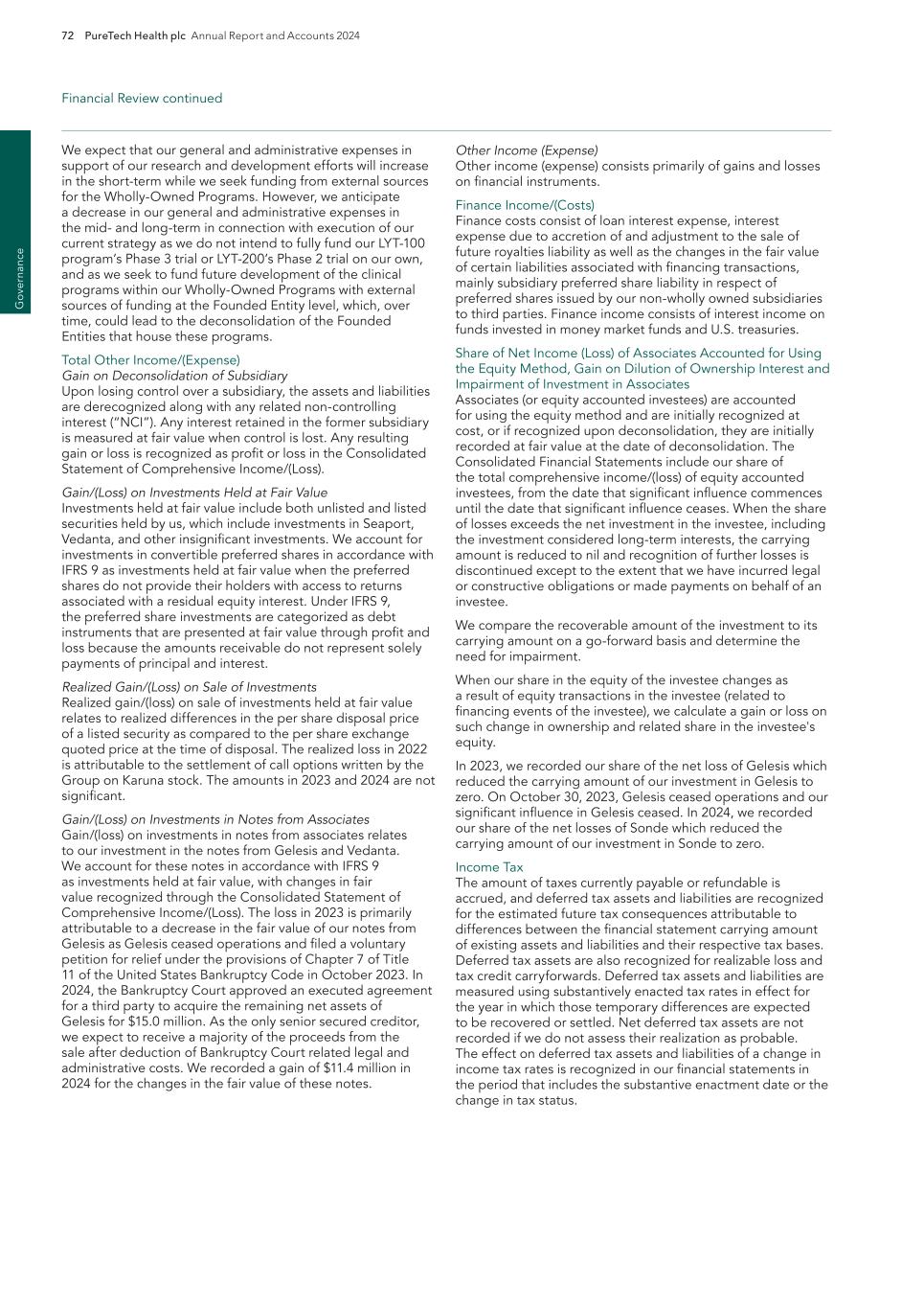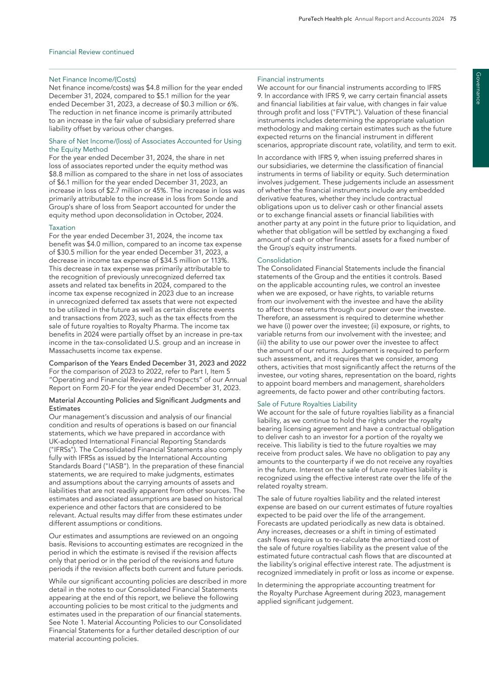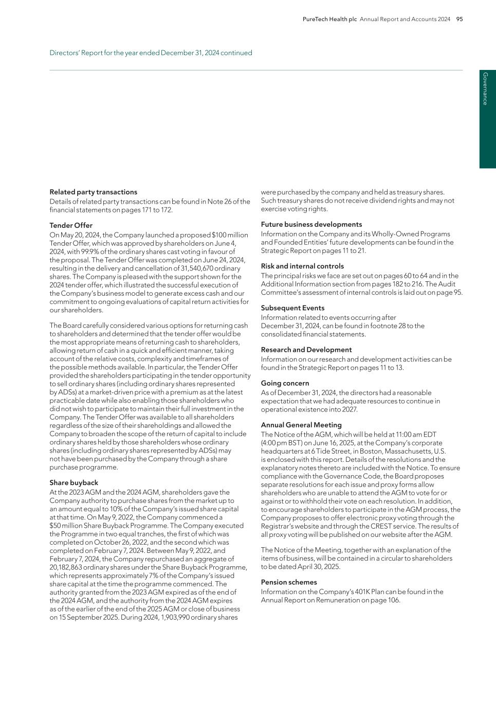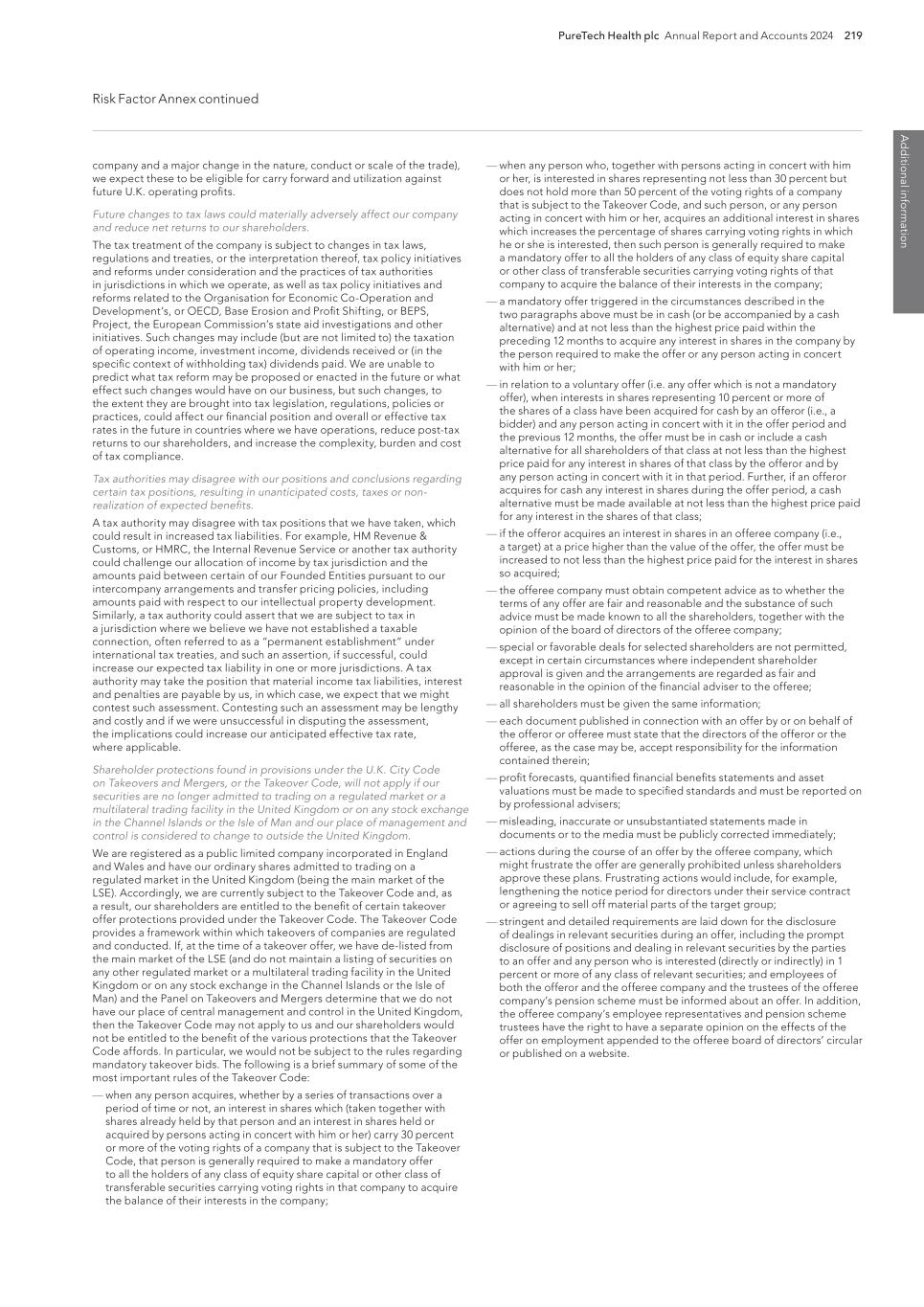 PureTech Health plc Annual Report and Accounts 2024 219 Risk Factor Annex continued A d d itio nal info rm atio n company and a major change in the nature, conduct or scale of the trade), we expect these to be eligible for carry forward and utilization against future U.K. operating profits. Future changes to tax laws could materially adversely affect our company and reduce net returns to our shareholders. The tax treatment of the company is subject to changes in tax laws, regulations and treaties, or the interpretation thereof, tax policy initiatives and reforms under consideration and the practices of tax authorities in jurisdictions in which we operate, as well as tax policy initiatives and reforms related to the Organisation for Economic Co-Operation and Development’s, or OECD, Base Erosion and Profit Shifting, or BEPS, Project, the European Commission’s state aid investigations and other initiatives. Such changes may include (but are not limited to) the taxation of operating income, investment income, dividends received or (in the specific context of withholding tax) dividends paid. We are unable to predict what tax reform may be proposed or enacted in the future or what effect such changes would have on our business, but such changes, to the extent they are brought into tax legislation, regulations, policies or practices, could affect our financial position and overall or effective tax rates in the future in countries where we have operations, reduce post-tax returns to our shareholders, and increase the complexity, burden and cost of tax compliance. Tax authorities may disagree with our positions and conclusions regarding certain tax positions, resulting in unanticipated costs, taxes or non- realization of expected benefits. A tax authority may disagree with tax positions that we have taken, which could result in increased tax liabilities. For example, HM Revenue & Customs, or HMRC, the Internal Revenue Service or another tax authority could challenge our allocation of income by tax jurisdiction and the amounts paid between certain of our Founded Entities pursuant to our intercompany arrangements and transfer pricing policies, including amounts paid with respect to our intellectual property development. Similarly, a tax authority could assert that we are subject to tax in a jurisdiction where we believe we have not established a taxable connection, often referred to as a “permanent establishment” under international tax treaties, and such an assertion, if successful, could increase our expected tax liability in one or more jurisdictions. A tax authority may take the position that material income tax liabilities, interest and penalties are payable by us, in which case, we expect that we might contest such assessment. Contesting such an assessment may be lengthy and costly and if we were unsuccessful in disputing the assessment, the implications could increase our anticipated effective tax rate, where applicable. Shareholder protections found in provisions under the U.K. City Code on Takeovers and Mergers, or the Takeover Code, will not apply if our securities are no longer admitted to trading on a regulated market or a multilateral trading facility in the United Kingdom or on any stock exchange in the Channel Islands or the Isle of Man and our place of management and control is considered to change to outside the United Kingdom. We are registered as a public limited company incorporated in England and Wales and have our ordinary shares admitted to trading on a regulated market in the United Kingdom (being the main market of the LSE). Accordingly, we are currently subject to the Takeover Code and, as a result, our shareholders are entitled to the benefit of certain takeover offer protections provided under the Takeover Code. The Takeover Code provides a framework within which takeovers of companies are regulated and conducted. If, at the time of a takeover offer, we have de-listed from the main market of the LSE (and do not maintain a listing of securities on any other regulated market or a multilateral trading facility in the United Kingdom or on any stock exchange in the Channel Islands or the Isle of Man) and the Panel on Takeovers and Mergers determine that we do not have our place of central management and control in the United Kingdom, then the Takeover Code may not apply to us and our shareholders would not be entitled to the benefit of the various protections that the Takeover Code affords. In particular, we would not be subject to the rules regarding mandatory takeover bids. The following is a brief summary of some of the most important rules of the Takeover Code: — when any person acquires, whether by a series of transactions over a period of time or not, an interest in shares which (taken together with shares already held by that person and an interest in shares held or acquired by persons acting in concert with him or her) carry 30 percent or more of the voting rights of a company that is subject to the Takeover Code, that person is generally required to make a mandatory offer to all the holders of any class of equity share capital or other class of transferable securities carrying voting rights in that company to acquire the balance of their interests in the company; — when any person who, together with persons acting in concert with him or her, is interested in shares representing not less than 30 percent but does not hold more than 50 percent of the voting rights of a company that is subject to the Takeover Code, and such person, or any person acting in concert with him or her, acquires an additional interest in shares which increases the percentage of shares carrying voting rights in which he or she is interested, then such person is generally required to make a mandatory offer to all the holders of any class of equity share capital or other class of transferable securities carrying voting rights of that company to acquire the balance of their interests in