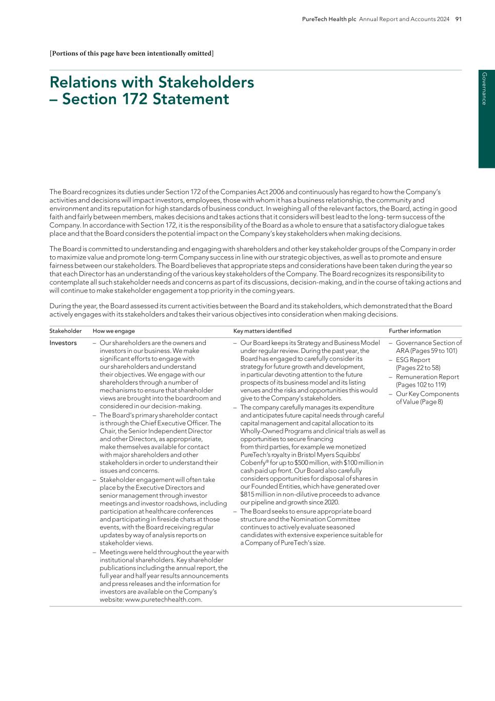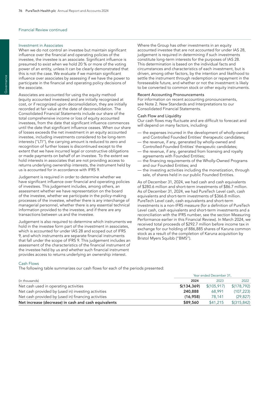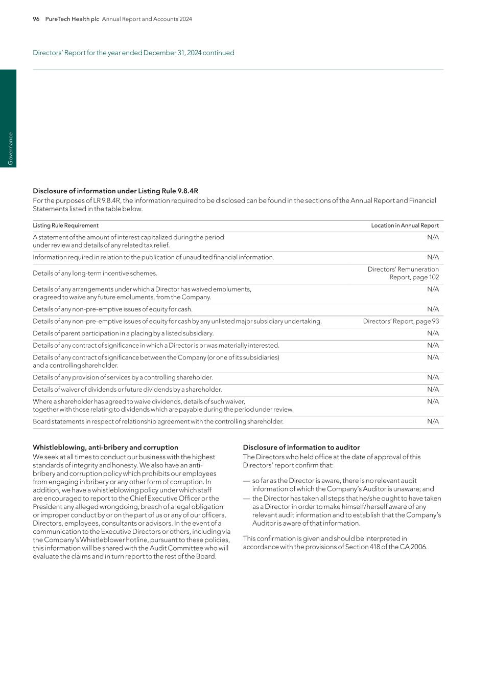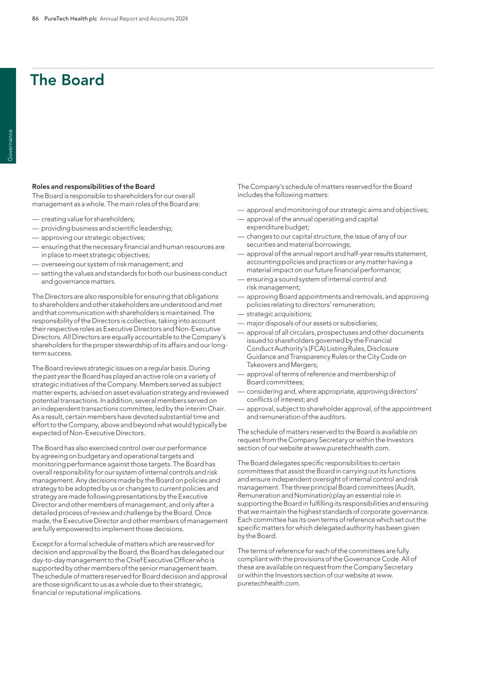 PureTech Health plc Annual Report and Accounts 2024 219 Risk Factor Annex continued A d d itio nal info rm atio n company and a major change in the nature, conduct or scale of the trade), we expect these to be eligible for carry forward and utilization against future U.K. operating profits. Future changes to tax laws could materially adversely affect our company and reduce net returns to our shareholders. The tax treatment of the company is subject to changes in tax laws, regulations and treaties, or the interpretation thereof, tax policy initiatives and reforms under consideration and the practices of tax authorities in jurisdictions in which we operate, as well as tax policy initiatives and reforms related to the Organisation for Economic Co-Operation and Development’s, or OECD, Base Erosion and Profit Shifting, or BEPS, Project, the European Commission’s state aid investigations and other initiatives. Such changes may include (but are not limited to) the taxation of operating income, investment income, dividends received or (in the specific context of withholding tax) dividends paid. We are unable to predict what tax reform may be proposed or enacted in the future or what effect such changes would have on our business, but such changes, to the extent they are brought into tax legislation, regulations, policies or practices, could affect our financial position and overall or effective tax rates in the future in countries where we have operations, reduce post-tax returns to our shareholders, and increase the complexity, burden and cost of tax compliance. Tax authorities may disagree with our positions and conclusions regarding certain tax positions, resulting in unanticipated costs, taxes or non- realization of expected benefits. A tax authority may disagree with tax positions that we have taken, which could result in increased tax liabilities. For example, HM Revenue & Customs, or HMRC, the Internal Revenue Service or another tax authority could challenge our allocation of income by tax jurisdiction and the amounts paid between certain of our Founded Entities pursuant to our intercompany arrangements and transfer pricing policies, including amounts paid with respect to our intellectual property development. Similarly, a tax authority could assert that we are subject to tax in a jurisdiction where we believe we have not established a taxable connection, often referred to as a “permanent establishment” under international tax treaties, and such an assertion, if successful, could increase our expected tax liability in one or more jurisdictions. A tax authority may take the position that material income tax liabilities, interest and penalties are payable by us, in which case, we expect that we might contest such assessment. Contesting such an assessment may be lengthy and costly and if we were unsuccessful in disputing the assessment, the implications could increase our anticipated effective tax rate, where applicable. Shareholder protections found in provisions under the U.K. City Code on Takeovers and Mergers, or the Takeover Code, will not apply if our securities are no longer admitted to trading on a regulated market or a multilateral trading facility in the United Kingdom or on any stock exchange in the Channel Islands or the Isle of Man and our place of management and control is considered to change to outside the United Kingdom. We are registered as a public limited company incorporated in England and Wales and have our ordinary shares admitted to trading on a regulated market in the United Kingdom (being the main market of the LSE). Accordingly, we are currently subject to the Takeover Code and, as a result, our shareholders are entitled to the benefit of certain takeover offer protections provided under the Takeover Code. The Takeover Code provides a framework within which takeovers of companies are regulated and conducted. If, at the time of a takeover offer, we have de-listed from the main market of the LSE (and do not maintain a listing of securities on any other regulated market or a multilateral trading facility in the United Kingdom or on any stock exchange in the Channel Islands or the Isle of Man) and the Panel on Takeovers and Mergers determine that we do not have our place of central management and control in the United Kingdom, then the Takeover Code may not apply to us and our shareholders would not be entitled to the benefit of the various protections that the Takeover Code affords. In particular, we would not be subject to the rules regarding mandatory takeover bids. The following is a brief summary of some of the most important rules of the Takeover Code: — when any person acquires, whether by a series of transactions over a period of time or not, an interest in shares which (taken together with shares already held by that person and an interest in shares held or acquired by persons acting in concert with him or her) carry 30 percent or more of the voting rights of a company that is subject to the Takeover Code, that person is generally required to make a mandatory offer to all the holders of any class of equity share capital or other class of transferable securities carrying voting rights in that company to acquire the balance of their interests in the company; — when any person who, together with persons acting in concert with him or her, is interested in shares representing not less than 30 percent but does not hold more than 50 percent of the voting rights of a company that is subject to the Takeover Code, and such person, or any person acting in concert with him or her, acquires an additional interest in shares which increases the percentage of shares carrying voting rights in which he or she is interested, then such person is generally required to make a mandatory offer to all the holders of any class of equity share capital or other class of transferable securities carrying voting rights of that company to acquire the balance of their interests in