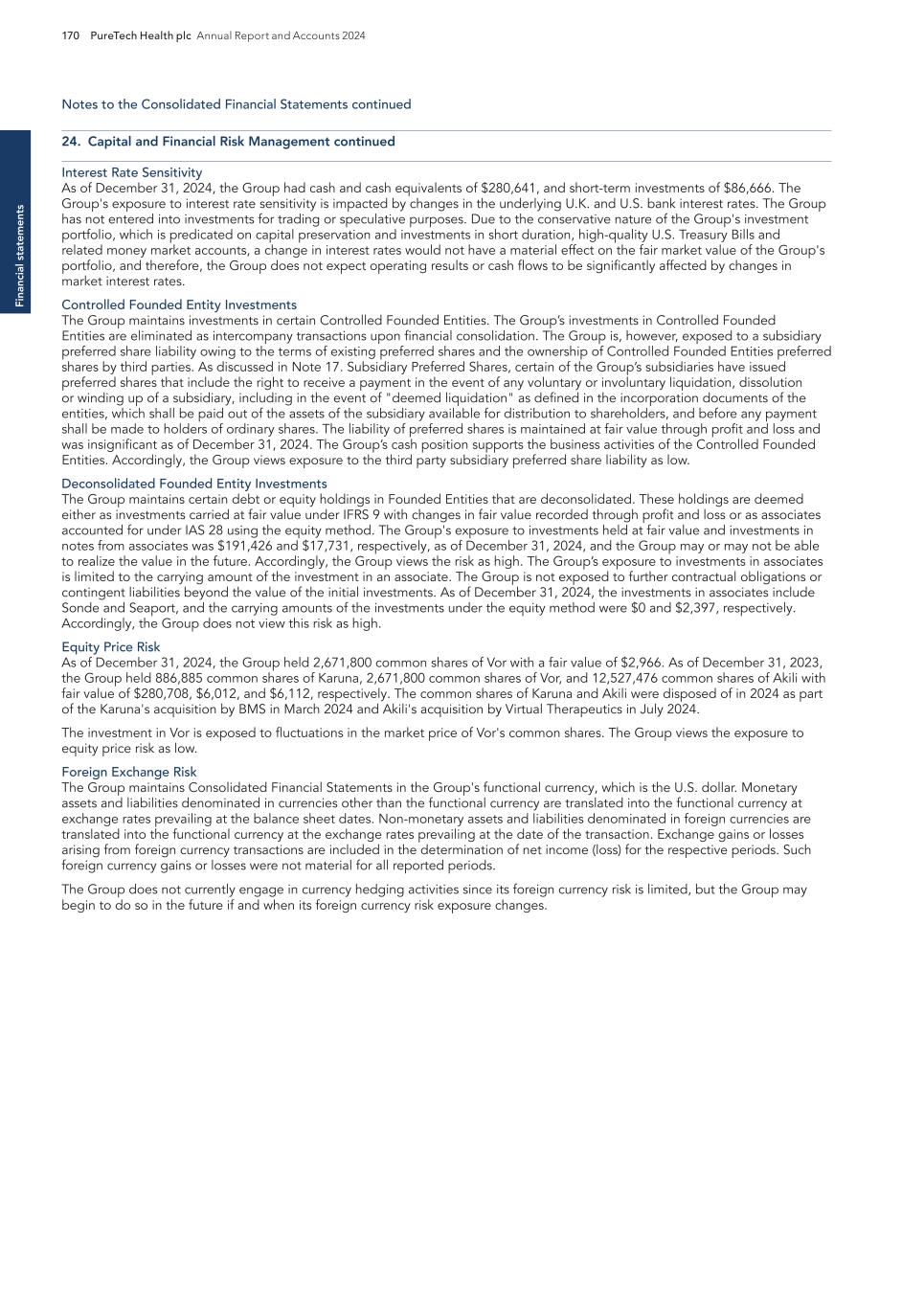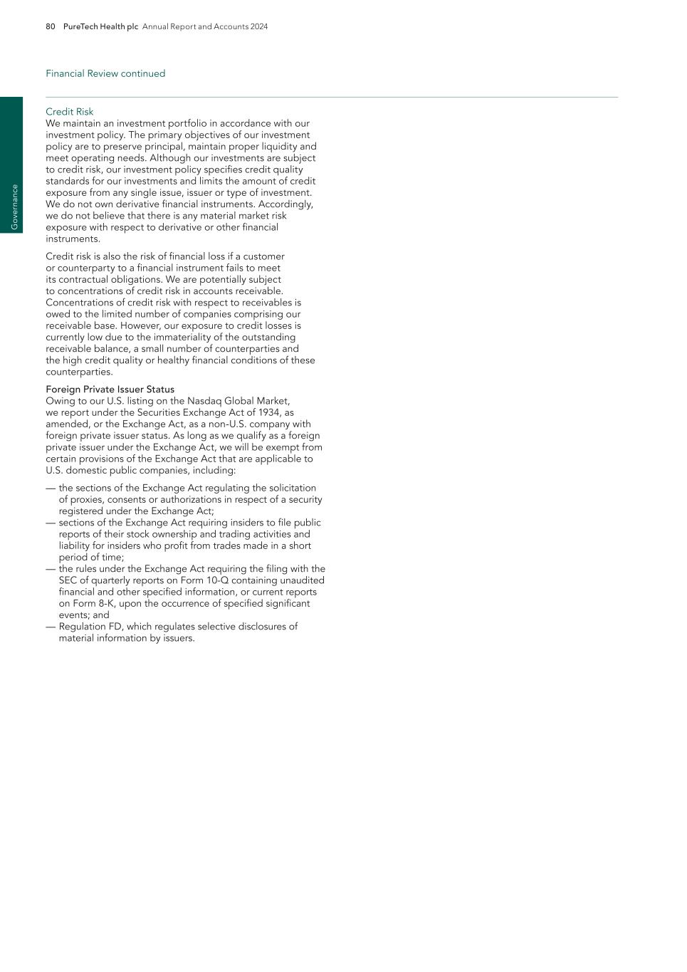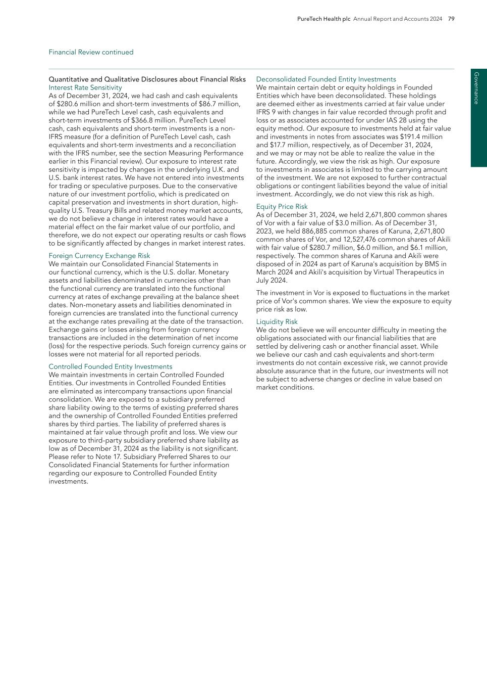 PureTech Health plc Annual Report and Accounts 2024 215 Risk Factor Annex continued A d d itio nal info rm atio n The United Kingdom’s withdrawal from the European Union may have a negative effect on our business. Since the end of the Brexit transition period on January 1, 2021, and the implementation of the Windsor Framework on January 1, 2025, the UK has not been directly subject to EU laws with respect to medicinal products As a result of the Northern Ireland Protocol, different rules applied in Northern Ireland than in Great Britain; broadly, Northern Ireland continued to follow the EU regulatory regime. However, on January 1, 2025, a new arrangement called the “Windsor Agreement” came into effect and reintegrated Northern Ireland under the regulatory authority of the MHRA with respect to medicinal products. The Windsor Framework removes EU licensing processes, and EU labelling and serialization requirements in relation to Northern Ireland, and introduces a UK-wide licensing process for medicinal products. There could be additional uncertainty and risk around what these changes mean to our business. It is currently unclear to what extent the UK Government will seek to align its regulations with the EU. The EU laws that have been transposed into UK law through secondary legislation remain applicable in Great Britain, but new legislation such as the (EU) CTR is not applicable in Great Britain. Whilst the EU-UK Trade and Cooperation Agreement, or TCA, includes the mutual recognition of Good Manufacturing Practice, or GMP, inspections of manufacturing facilities for medicinal products and GMP documents issued, it does not contain wholesale mutual recognition of UK and EU pharmaceutical regulations and product standards. There may be divergent local requirements in Great Britain from the EU in the future, which may impact clinical and development activities that occur in the UK in the future. Similarly, clinical trial submissions in the UK cannot be bundled with those of EU member states within the EMA Clinical Trial Information System, or CTIS, adding further complexity, cost and potential risk to future clinical and development activity in the UK. Exchange rate fluctuations may materially affect our results of operations and financial condition. Although we are based in the United Kingdom, our financial statements are denominated in U.S dollars and many of our business activities are carried out with partners outside the U.S. and United Kingdom and these transactions may be denominated in another currency. As a result, our business and the price of our ADSs may be affected by fluctuations in foreign exchange rates not only between the pound sterling and the U.S. dollar, but also the currencies of other countries, which may have a significant impact on our results of operations and cash flows from period to period. Currently, we do not have any exchange rate hedging arrangements in place. Risks Related to Our Equity Securities and ADSs The market price of our ADSs has been and will likely continue to be highly volatile, and you could lose all or part of your investment. The market price of our ADSs has been and will likely continue to be volatile. The stock market in general, and the market for biopharmaceutical companies in particular, has experienced extreme volatility that has often been unrelated to the operating performance of particular companies. As a result of this volatility, you may not be able to sell your ADSs at or above the purchase price. The market price for our ADSs may be influenced by many factors, including: — adverse results or delays in our preclinical studies or clinical trials; — reports of AEs or other negative results in clinical trials of third parties’ therapeutic candidates that target the therapeutic candidates within our Wholly-Owned Programs or our Founded Entities’ therapeutic candidates’ target indications; — an inability for us to obtain additional funding on reasonable terms or at all; — any delay in submitting an IND, BLA or NDA for the therapeutic candidates within our Wholly-Owned Programs or our Founded Entities’ therapeutic candidates and any adverse development or perceived adverse development with respect to the FDA’s review of that IND, BLA or NDA; — failure to develop successfully and commercialize the therapeutic candidates within our Wholly-Owned Programs or our Founded Entities’ therapeutic candidates; — announcements we make regarding our current therapeutic candidates, acquisition of potential new therapeutic candidates and companies and/ or in-licensing; — failure to maintain our or our Founded Entities’ existing license arrangements or enter into new licensing and collaboration agreements; — failure by us, our Founded Entities or our licensors to prosecute, maintain or enforce our intellectual property rights; — changes in laws or regulations applicable to future therapeutics; availability, fluctuating interest and inflation rates, tariffs and trade wars, declines in consumer confidence, declines in economic growth, increases in unemployment rates and uncertainty about economic stability. A severe or prolonged economic downturn could result in a variety of risks to our business, including a reduced ability to raise additional capital when needed on acceptable terms, if at all, and weakened demand for the therapeutic candidates within our Wholly-Owned Programs or our Founded Entities’ therapeutic candidates. A weak or declining economy could also strain our suppliers, possibly resulting in supply disruption. Any of the foregoing could harm our business and we cannot anticipate all of the ways in which the current economic climate and financial market conditions could adversely impact our business. Additionally, we maintain the majority of our cash and cash equivalents in accounts with major U.S. and multi-national financial institutions, and our deposits at certain of these institutions exceed insu