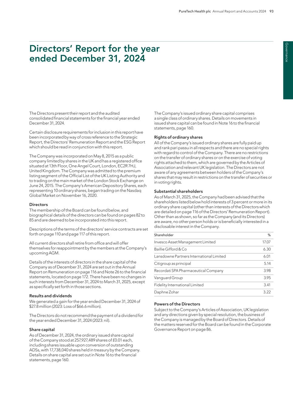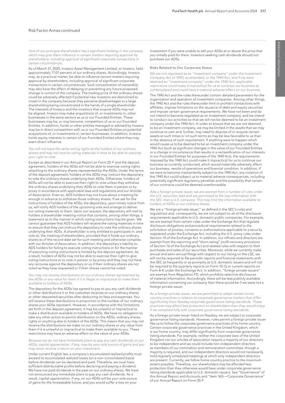 PureTech Health plc Annual Report and Accounts 2024 217 Risk Factor Annex continued A d d itio nal info rm atio n One of our principal shareholders has a significant holding in the company which may give them influence in certain matters requiring approval by shareholders, including approval of significant corporate transactions in certain circumstances. As of March 31, 2025, Invesco Asset Management Limited, or Invesco, held approximately 17.07 percent of our ordinary shares. Accordingly, Invesco may, as a practical matter, be able to influence certain matters requiring approval by shareholders, including approval of significant corporate transactions in certain circumstances. Such concentration of ownership may also have the effect of delaying or preventing any future proposed change in control of the company. The trading price of the ordinary shares could be adversely affected if potential new investors are disinclined to invest in the company because they perceive disadvantages to a large shareholding being concentrated in the hands of a single shareholder. The interests of Invesco and the investors that acquire ADSs may not be aligned. Invesco may make acquisitions of, or investments in, other businesses in the same sectors as us or our Founded Entities. These businesses may be, or may become, competitors of us or our Founded Entities. In addition, funds or other entities managed or advised by Invesco may be in direct competition with us or our Founded Entities on potential acquisitions of, or investments in, certain businesses. In addition, Invesco holds equity interests in certain of our Founded Entities where they may exert direct influence. You will not have the same voting rights as the holders of our ordinary shares and may not receive voting materials in time to be able to exercise your right to vote. Except as described in our Annual Report on Form 20-F and the deposit agreement, holders of the ADSs will not be able to exercise voting rights attaching to the ordinary shares represented by the ADSs. Under the terms of the deposit agreement, holders of the ADSs may instruct the depositary to vote the ordinary shares underlying their ADSs. Otherwise, holders of ADSs will not be able to exercise their right to vote unless they withdraw the ordinary shares underlying their ADSs to vote them in person or by proxy in accordance with applicable laws and regulations and our Articles of Association. Even so, ADS holders may not know about a meeting far enough in advance to withdraw those ordinary shares. If we ask for the instructions of holders of the ADSs, the depositary, upon timely notice from us, will notify ADS holders of the upcoming vote and arrange to deliver our voting materials to them. Upon our request, the depositary will mail to holders a shareholder meeting notice that contains, among other things, a statement as to the manner in which voting instructions may be given. We cannot guarantee that ADS holders will receive the voting materials in time to ensure that they can instruct the depositary to vote the ordinary shares underlying their ADSs. A shareholder is only entitled to participate in, and vote at, the meeting of shareholders, provided that it holds our ordinary shares as of the record date set for such meeting and otherwise complies with our Articles of Association. In addition, the depositary’s liability to ADS holders for failing to execute voting instructions or for the manner of executing voting instructions is limited by the deposit agreement. As a result, holders of ADSs may not be able to exercise their right to give voting instructions or to vote in person or by proxy and they may not have any recourse against the depositary or us if their ordinary shares are not voted as they have requested or if their shares cannot be voted. You may not receive distributions on our ordinary shares represented by the ADSs or any value for them if it is illegal or impractical to make them available to holders of ADSs. The depositary for the ADSs has agreed to pay to you any cash dividends or other distributions it or the custodian receives on our ordinary shares or other deposited securities after deducting its fees and expenses. You will receive these distributions in proportion to the number of our ordinary shares your ADSs represent. However, in accordance with the limitations set forth in the deposit agreement, it may be unlawful or impractical to make a distribution available to holders of ADSs. We have no obligation to take any other action to permit distribution on the ADSs, ordinary shares, rights or anything else to holders of the ADSs. This means that you may not receive the distributions we make on our ordinary shares or any value from them if it is unlawful or impractical to make them available to you. These restrictions may have an adverse effect on the value of your ADSs. Because we do not have immediate plans to pay any cash dividends on our ADSs, capital appreciation, if any, may be your sole source of gains and you may never receive a return on your investment. Under current English law, a company’s accumulated realized profits must exceed its accumulated realized losses (on a non-consolidated basis) before dividends can be declared and paid. Therefore, we must have sufficient distributable profits before declaring and paying a dividend. We have not paid dividends in the past on our ordinary shares. We have not announced any immediate plans to pay any cash dividends. As a result, capital appreciation, if any, on our ADSs will be your sole source of gains for the foreseeable future, and you would suffer a loss on your investment if you were unable to sell your ADSs at or above the price that you initially paid for them. Investors seeking cash dividends should not purchase our ADSs. Risks Related to Our Corporate Status We are not regulated as an “investment company” under the Investment Company Act of 1940, as amended, or the 1940 Act, and if we w