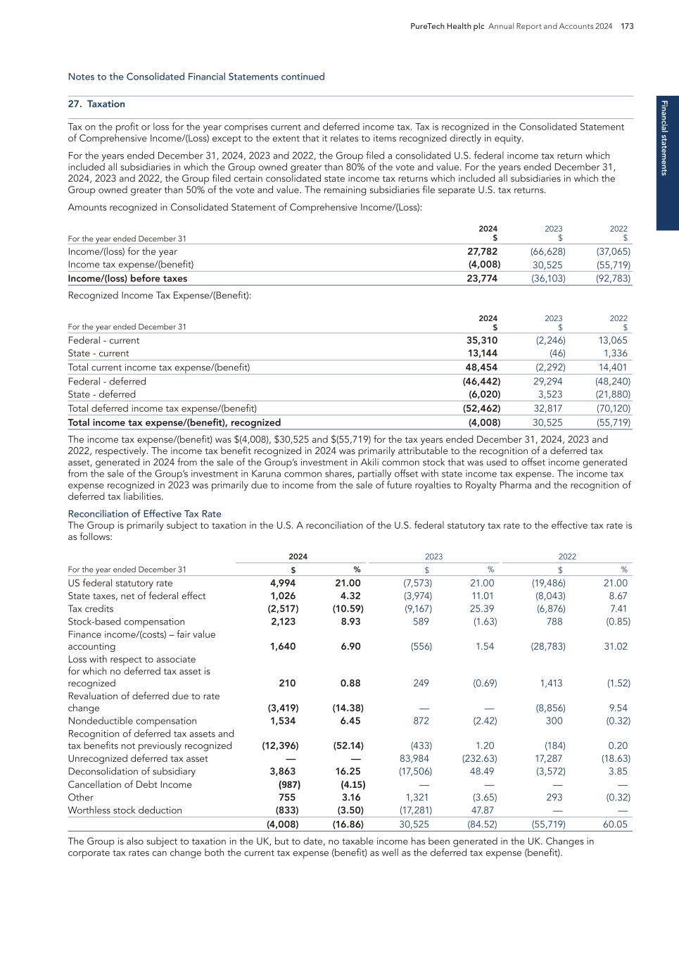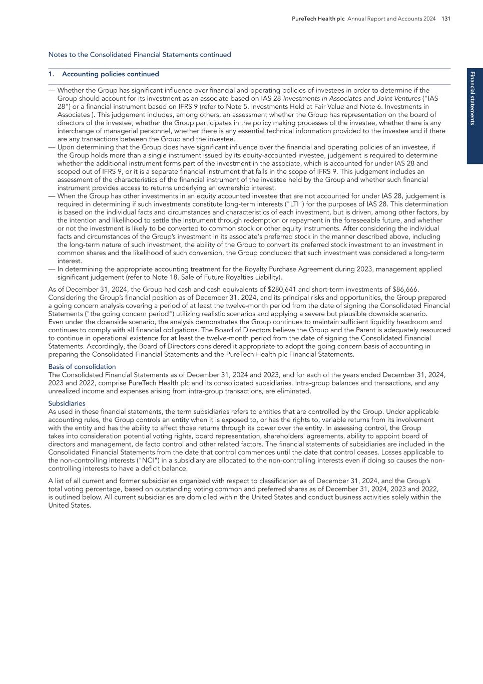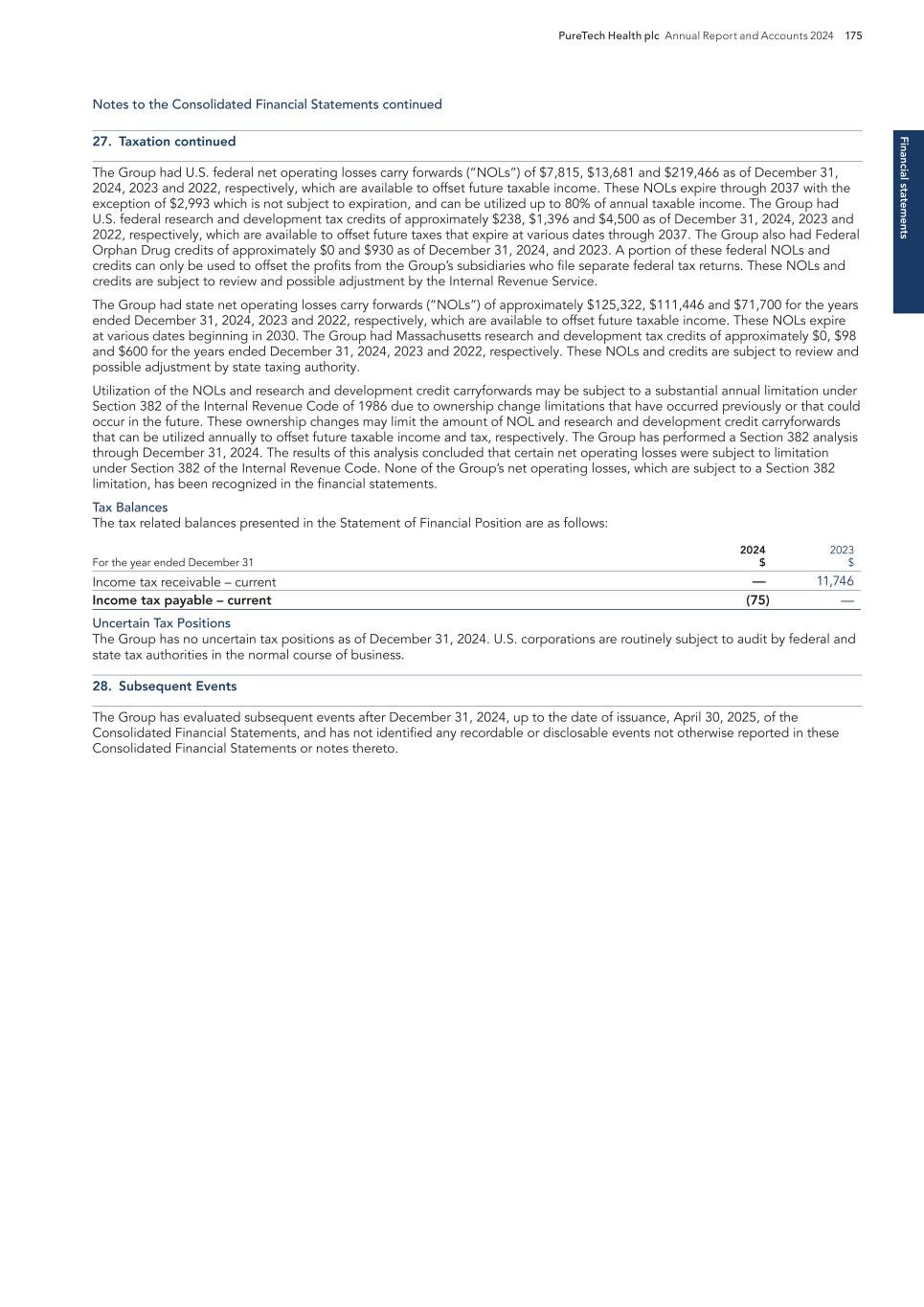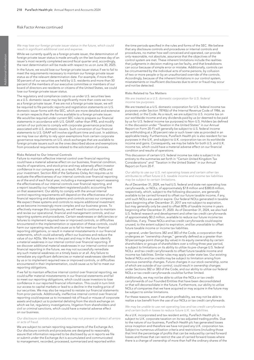 218 PureTech Health plc Annual Report and Accounts 2024 Risk Factor Annex continued A d d it io na l i nf o rm at io n the time periods specified in the rules and forms of the SEC. We believe that any disclosure controls and procedures or internal controls and procedures, no matter how well conceived and operated, can provide only reasonable, not absolute, assurance that the objectives of the control system are met. These inherent limitations include the realities that judgments in decision-making can be faulty, and that breakdowns can occur because of simple error or mistake. Additionally, controls can be circumvented by the individual acts of some persons, by collusion of two or more people or by an unauthorized override of the controls. Accordingly, because of the inherent limitations in our control system, misstatements or insufficient disclosures due to error or fraud may occur and not be detected. Risks Related to Tax Matters We are treated as a U.S. domestic corporation for U.S. federal income tax purposes. We are treated as a U.S. domestic corporation for U.S. federal income tax purposes under Section 7874(b) of the Internal Revenue Code of 1986, as amended, or the Code. As a result, we are subject to U.S. income tax on our worldwide income and any dividends paid by us (or deemed to be paid by us for U.S. federal income tax purposes) to Non-U.S. Holders (as defined in the discussion under “Taxation in the United States” in our Annual Report on Form 20-F) will generally be subject to U.S. federal income tax withholding at a 30 percent rate or such lower rate as provided in an applicable treaty. Furthermore, PureTech Health plc is also resident for tax purposes in the U.K. and subject to U.K. corporation tax on its worldwide income and gains. Consequently, we may be liable for both U.S. and U.K. income tax, which could have a material adverse effect on our financial condition and results of operations. This discussion of certain U.S. federal income tax risks is subject in its entirety to the summaries set forth in “Certain United Kingdom Tax Considerations” and “Taxation in the United States” in our Annual Report on Form 20-F. Our ability to use our U.S. net operating losses and certain other tax attributes to offset future U.S. taxable income and income tax liabilities may be subject to certain limitations. As of December 31, 2024, we had U.S. federal and state net operating loss carryforwards, or NOLs, of approximately $7.8 million and $380.8 million, respectively, which, subject to the following discussion, are generally available to be carried forward to offset our future taxable income, if any, until such NOLs are used or expire. Our federal NOLs generated in taxable years beginning after December 31, 2017 are not subject to expiration, but may generally only be used to offset 80% of taxable income in years beginning after December 31, 2020. As of December 31, 2024, we also had U.S. federal research and development and other tax credit carryforwards of approximately $0.2 million, available to reduce our future income tax liabilities, if any. These NOLs and tax credit carryforwards could expire unused, to the extent subject to expiration, and be unavailable to offset future taxable income or income tax liabilities. In general, under Sections 382 and 383 of the Code, a corporation that undergoes an “ownership change,” generally defined as a greater than 50 percentage point change (by value) in its equity ownership by certain shareholders or groups of shareholders over a rolling three year period, is subject to limitations on its ability to utilize its pre-change U.S. federal NOLs and tax credit carryforwards to offset future taxable income and income tax liabilities. Similar rules may apply under state law. Our existing federal NOLs and tax credits may be subject to limitation arising from previous ownership changes. Future changes in our stock ownership, some of which are outside of our control, could result in ownership changes under Sections 382 or 383 of the Code, and our ability to utilize our federal NOLs or tax credit carryforwards could be further limited. Additionally, we may not be able to utilize the NOLs or tax credit carryforwards of our Founded Entities that have been deconsolidated or that will deconsolidate in the future. Furthermore, our ability to utilize NOLs of companies that we have acquired or may acquire in the future may be subject to similar limitations. For these reasons, even if we attain profitability, we may not be able to realize a tax benefit from the use of our NOLs or tax credit carryforwards. We may be unable to use net operating loss and tax credit carryforwards and certain built-in losses to reduce future U.K. tax liabilities. As a U.K. incorporated and tax resident entity, PureTech Health plc is subject to U.K. corporate taxation on its tax-adjusted trading profits. Due to the nature of our business, PureTech Health plc has generated losses since inception and therefore we have not paid any U.K. corporation tax. Subject to numerous utilization criteria and restrictions (including those that limit the percentage of profits that can be reduced by carried forward losses and those that can restrict the use of carried forward losses where there is a change of ownership of more than half the ordinary shares of the We may lose our foreign private issuer status in the future, which could result in significant additional cost and expense. While we currently qualify as a foreign private issuer, the determination of foreign private issuer status is made annually on the last business day of an issuer’s most recently completed second fiscal quarter and, accordingly, the next determination will be made with respect to us on June 30, 2025. In the future, we would lose our foreign private issuer status if we to fail to meet the requirements necessary to maintain our foreign private issuer status as of the relevant determination date. For ex