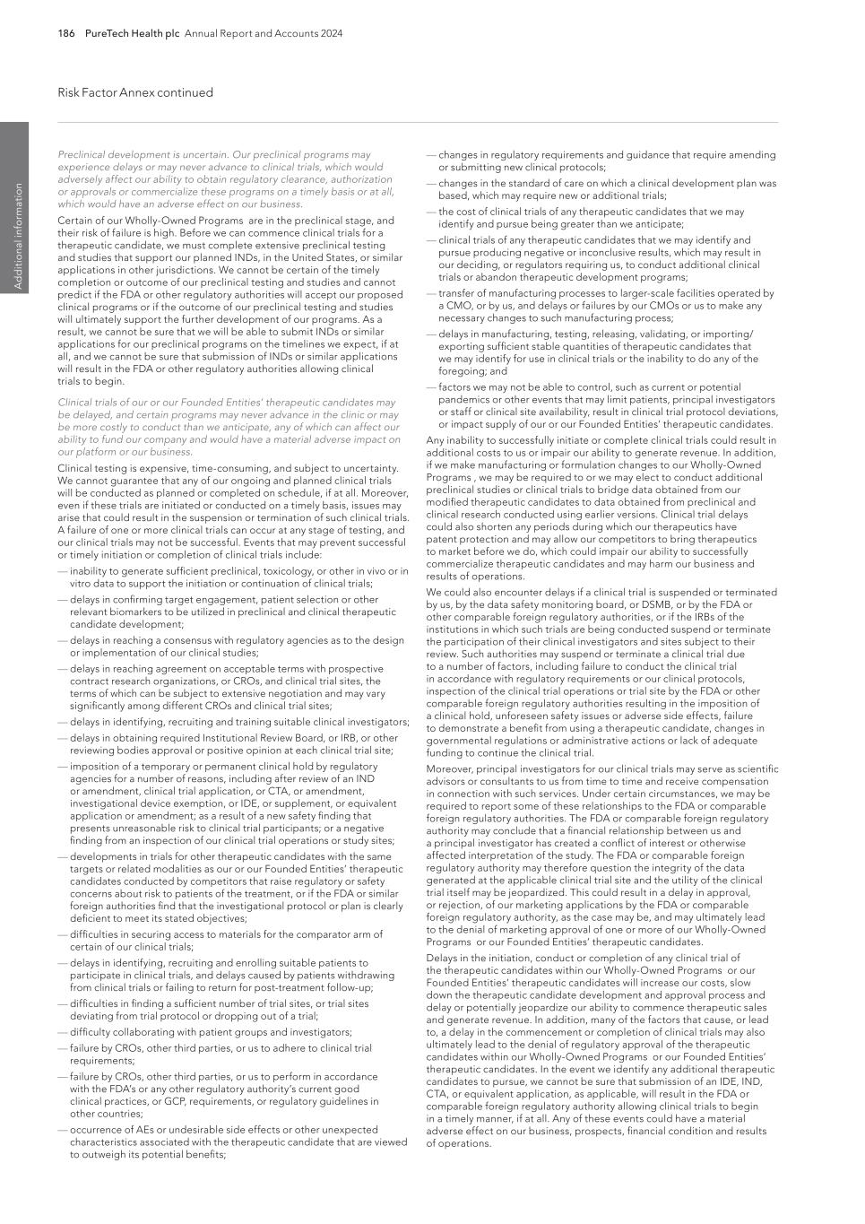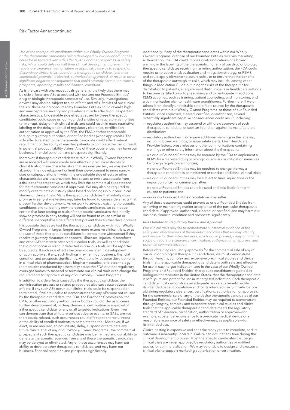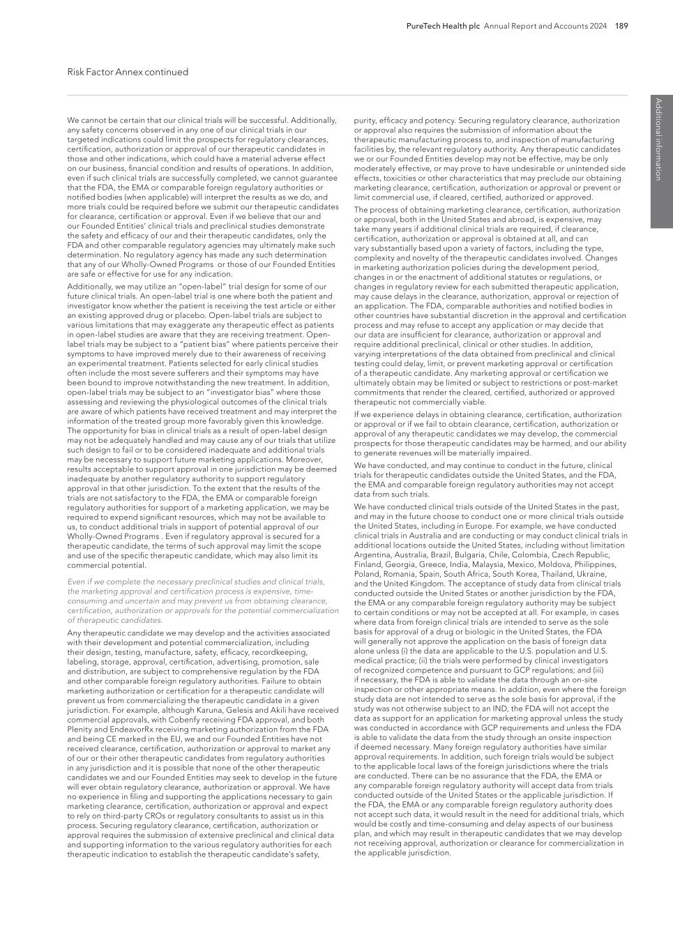 PureTech Health plc Annual Report and Accounts 2024 189 Risk Factor Annex continued A d d itio nal info rm atio n purity, efficacy and potency. Securing regulatory clearance, authorization or approval also requires the submission of information about the therapeutic manufacturing process to, and inspection of manufacturing facilities by, the relevant regulatory authority. Any therapeutic candidates we or our Founded Entities develop may not be effective, may be only moderately effective, or may prove to have undesirable or unintended side effects, toxicities or other characteristics that may preclude our obtaining marketing clearance, certification, authorization or approval or prevent or limit commercial use, if cleared, certified, authorized or approved. The process of obtaining marketing clearance, certification, authorization or approval, both in the United States and abroad, is expensive, may take many years if additional clinical trials are required, if clearance, certification, authorization or approval is obtained at all, and can vary substantially based upon a variety of factors, including the type, complexity and novelty of the therapeutic candidates involved. Changes in marketing authorization policies during the development period, changes in or the enactment of additional statutes or regulations, or changes in regulatory review for each submitted therapeutic application, may cause delays in the clearance, authorization, approval or rejection of an application. The FDA, comparable authorities and notified bodies in other countries have substantial discretion in the approval and certification process and may refuse to accept any application or may decide that our data are insufficient for clearance, authorization or approval and require additional preclinical, clinical or other studies. In addition, varying interpretations of the data obtained from preclinical and clinical testing could delay, limit, or prevent marketing approval or certification of a therapeutic candidate. Any marketing approval or certification we ultimately obtain may be limited or subject to restrictions or post-market commitments that render the cleared, certified, authorized or approved therapeutic not commercially viable. If we experience delays in obtaining clearance, certification, authorization or approval or if we fail to obtain clearance, certification, authorization or approval of any therapeutic candidates we may develop, the commercial prospects for those therapeutic candidates may be harmed, and our ability to generate revenues will be materially impaired. We have conducted, and may continue to conduct in the future, clinical trials for therapeutic candidates outside the United States, and the FDA, the EMA and comparable foreign regulatory authorities may not accept data from such trials. We have conducted clinical trials outside of the United States in the past, and may in the future choose to conduct one or more clinical trials outside the United States, including in Europe. For example, we have conducted clinical trials in Australia and are conducting or may conduct clinical trials in additional locations outside the United States, including without limitation Argentina, Australia, Brazil, Bulgaria, Chile, Colombia, Czech Republic, Finland, Georgia, Greece, India, Malaysia, Mexico, Moldova, Philippines, Poland, Romania, Spain, South Africa, South Korea, Thailand, Ukraine, and the United Kingdom. The acceptance of study data from clinical trials conducted outside the United States or another jurisdiction by the FDA, the EMA or any comparable foreign regulatory authority may be subject to certain conditions or may not be accepted at all. For example, in cases where data from foreign clinical trials are intended to serve as the sole basis for approval of a drug or biologic in the United States, the FDA will generally not approve the application on the basis of foreign data alone unless (i) the data are applicable to the U.S. population and U.S. medical practice; (ii) the trials were performed by clinical investigators of recognized competence and pursuant to GCP regulations; and (iii) if necessary, the FDA is able to validate the data through an on-site inspection or other appropriate means. In addition, even where the foreign study data are not intended to serve as the sole basis for approval, if the study was not otherwise subject to an IND, the FDA will not accept the data as support for an application for marketing approval unless the study was conducted in accordance with GCP requirements and unless the FDA is able to validate the data from the study through an onsite inspection if deemed necessary. Many foreign regulatory authorities have similar approval requirements. In addition, such foreign trials would be subject to the applicable local laws of the foreign jurisdictions where the trials are conducted. There can be no assurance that the FDA, the EMA or any comparable foreign regulatory authority will accept data from trials conducted outside of the United States or the applicable jurisdiction. If the FDA, the EMA or any comparable foreign regulatory authority does not accept such data, it would result in the need for additional trials, which would be costly and time-consuming and delay aspects of our business plan, and which may result in therapeutic candidates that we may develop not receiving approval, authorization or clearance for commercialization in the applicable jurisdiction. We cannot be certain that our clinical trials will be successful. Additionally, any safety concerns observed in any one of our clinical trials in our targeted indications could limit the prospects for regulatory clearances, certification, authorization or approval of our therapeutic candidates in those and other indications, which could have a material adverse effect on our business, financial condition and results of operations. In addition, even if such clinical trials are successfully completed, we can