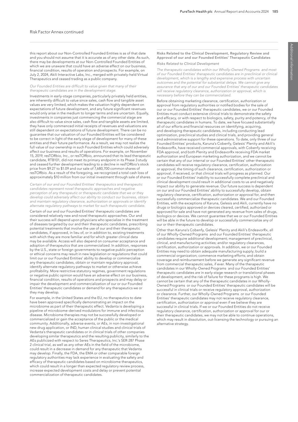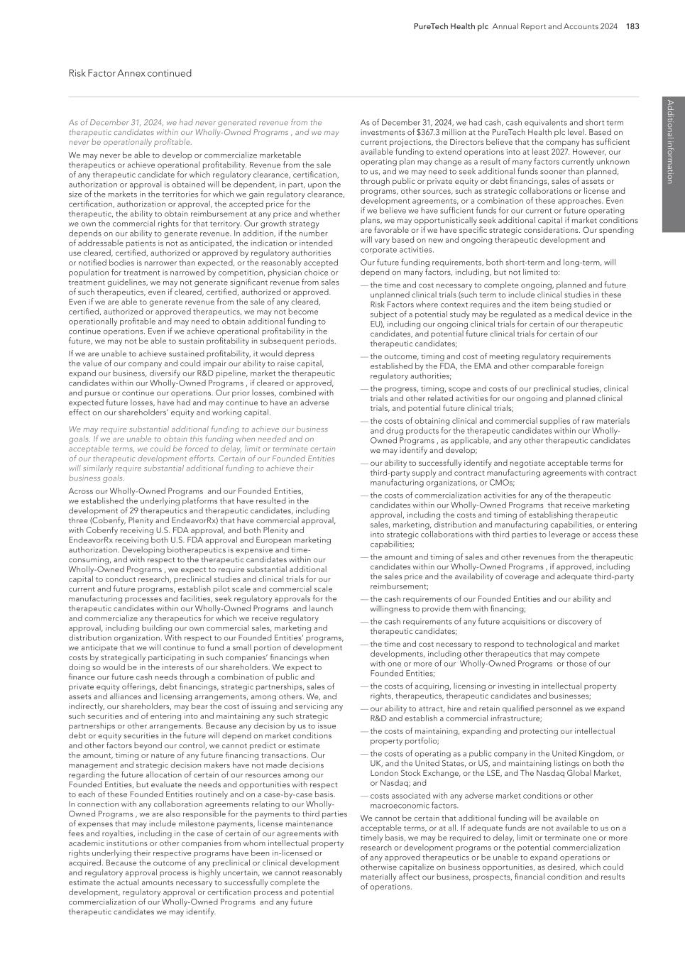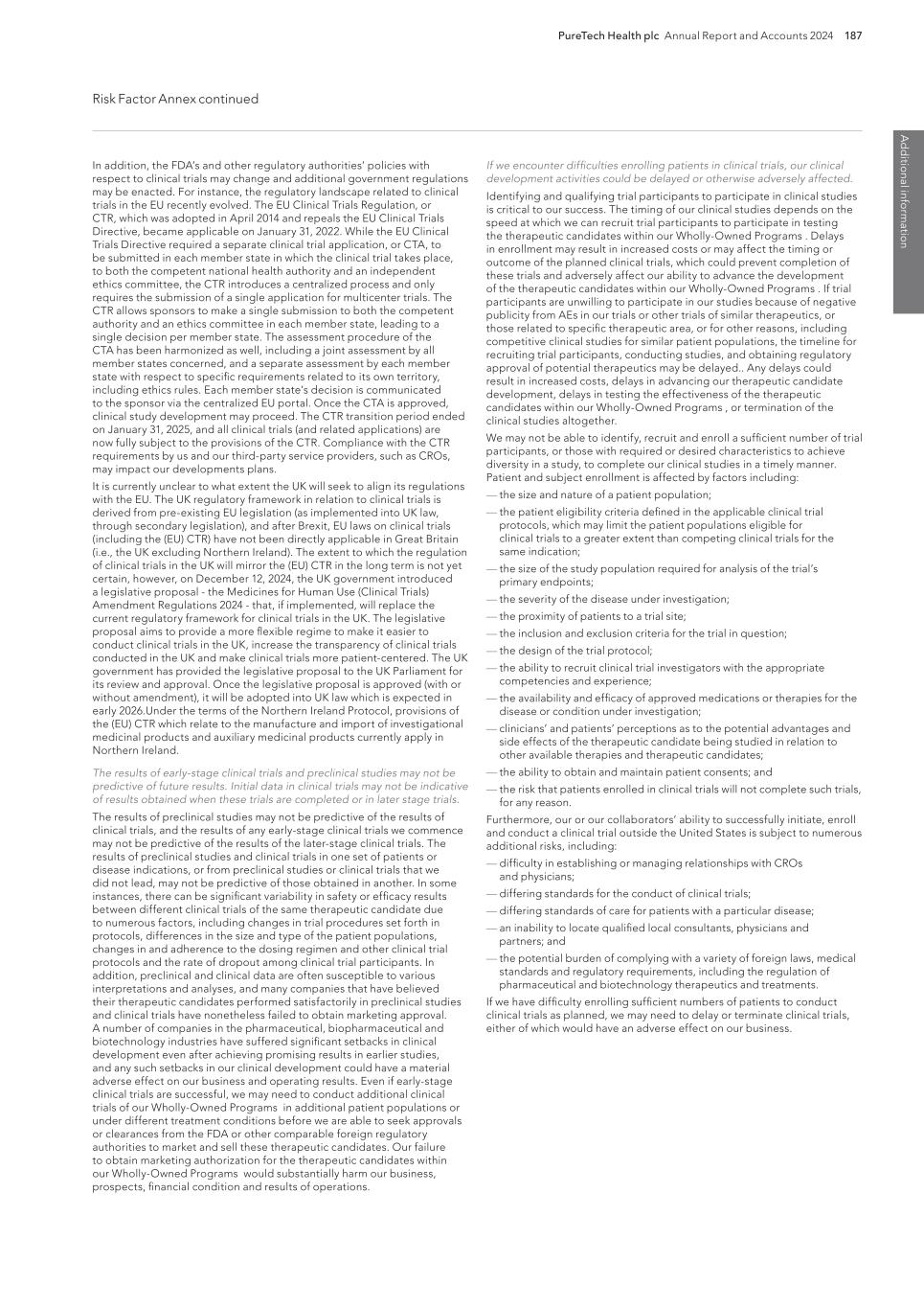 PureTech Health plc Annual Report and Accounts 2024 189 Risk Factor Annex continued A d d itio nal info rm atio n purity, efficacy and potency. Securing regulatory clearance, authorization or approval also requires the submission of information about the therapeutic manufacturing process to, and inspection of manufacturing facilities by, the relevant regulatory authority. Any therapeutic candidates we or our Founded Entities develop may not be effective, may be only moderately effective, or may prove to have undesirable or unintended side effects, toxicities or other characteristics that may preclude our obtaining marketing clearance, certification, authorization or approval or prevent or limit commercial use, if cleared, certified, authorized or approved. The process of obtaining marketing clearance, certification, authorization or approval, both in the United States and abroad, is expensive, may take many years if additional clinical trials are required, if clearance, certification, authorization or approval is obtained at all, and can vary substantially based upon a variety of factors, including the type, complexity and novelty of the therapeutic candidates involved. Changes in marketing authorization policies during the development period, changes in or the enactment of additional statutes or regulations, or changes in regulatory review for each submitted therapeutic application, may cause delays in the clearance, authorization, approval or rejection of an application. The FDA, comparable authorities and notified bodies in other countries have substantial discretion in the approval and certification process and may refuse to accept any application or may decide that our data are insufficient for clearance, authorization or approval and require additional preclinical, clinical or other studies. In addition, varying interpretations of the data obtained from preclinical and clinical testing could delay, limit, or prevent marketing approval or certification of a therapeutic candidate. Any marketing approval or certification we ultimately obtain may be limited or subject to restrictions or post-market commitments that render the cleared, certified, authorized or approved therapeutic not commercially viable. If we experience delays in obtaining clearance, certification, authorization or approval or if we fail to obtain clearance, certification, authorization or approval of any therapeutic candidates we may develop, the commercial prospects for those therapeutic candidates may be harmed, and our ability to generate revenues will be materially impaired. We have conducted, and may continue to conduct in the future, clinical trials for therapeutic candidates outside the United States, and the FDA, the EMA and comparable foreign regulatory authorities may not accept data from such trials. We have conducted clinical trials outside of the United States in the past, and may in the future choose to conduct one or more clinical trials outside the United States, including in Europe. For example, we have conducted clinical trials in Australia and are conducting or may conduct clinical trials in additional locations outside the United States, including without limitation Argentina, Australia, Brazil, Bulgaria, Chile, Colombia, Czech Republic, Finland, Georgia, Greece, India, Malaysia, Mexico, Moldova, Philippines, Poland, Romania, Spain, South Africa, South Korea, Thailand, Ukraine, and the United Kingdom. The acceptance of study data from clinical trials conducted outside the United States or another jurisdiction by the FDA, the EMA or any comparable foreign regulatory authority may be subject to certain conditions or may not be accepted at all. For example, in cases where data from foreign clinical trials are intended to serve as the sole basis for approval of a drug or biologic in the United States, the FDA will generally not approve the application on the basis of foreign data alone unless (i) the data are applicable to the U.S. population and U.S. medical practice; (ii) the trials were performed by clinical investigators of recognized competence and pursuant to GCP regulations; and (iii) if necessary, the FDA is able to validate the data through an on-site inspection or other appropriate means. In addition, even where the foreign study data are not intended to serve as the sole basis for approval, if the study was not otherwise subject to an IND, the FDA will not accept the data as support for an application for marketing approval unless the study was conducted in accordance with GCP requirements and unless the FDA is able to validate the data from the study through an onsite inspection if deemed necessary. Many foreign regulatory authorities have similar approval requirements. In addition, such foreign trials would be subject to the applicable local laws of the foreign jurisdictions where the trials are conducted. There can be no assurance that the FDA, the EMA or any comparable foreign regulatory authority will accept data from trials conducted outside of the United States or the applicable jurisdiction. If the FDA, the EMA or any comparable foreign regulatory authority does not accept such data, it would result in the need for additional trials, which would be costly and time-consuming and delay aspects of our business plan, and which may result in therapeutic candidates that we may develop not receiving approval, authorization or clearance for commercialization in the applicable jurisdiction. We cannot be certain that our clinical trials will be successful. Additionally, any safety concerns observed in any one of our clinical trials in our targeted indications could limit the prospects for regulatory clearances, certification, authorization or approval of our therapeutic candidates in those and other indications, which could have a material adverse effect on our business, financial condition and results of operations. In addition, even if such clinical trials are successfully completed, we can