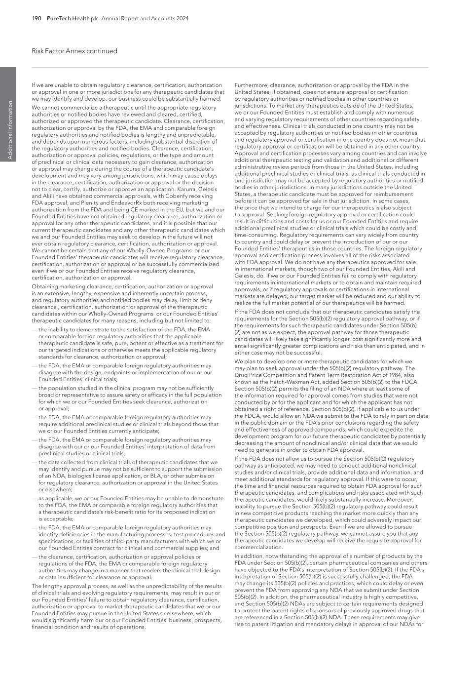 190 PureTech Health plc Annual Report and Accounts 2024 Risk Factor Annex continued A d d it io na l i nf o rm at io n Furthermore, clearance, authorization or approval by the FDA in the United States, if obtained, does not ensure approval or certification by regulatory authorities or notified bodies in other countries or jurisdictions. To market any therapeutics outside of the United States, we or our Founded Entities must establish and comply with numerous and varying regulatory requirements of other countries regarding safety and effectiveness. Clinical trials conducted in one country may not be accepted by regulatory authorities or notified bodies in other countries, and regulatory approval or certification in one country does not mean that regulatory approval or certification will be obtained in any other country. Approval and certification processes vary among countries and can involve additional therapeutic testing and validation and additional or different administrative review periods from those in the United States, including additional preclinical studies or clinical trials, as clinical trials conducted in one jurisdiction may not be accepted by regulatory authorities or notified bodies in other jurisdictions. In many jurisdictions outside the United States, a therapeutic candidate must be approved for reimbursement before it can be approved for sale in that jurisdiction. In some cases, the price that we intend to charge for our therapeutics is also subject to approval. Seeking foreign regulatory approval or certification could result in difficulties and costs for us or our Founded Entities and require additional preclinical studies or clinical trials which could be costly and time-consuming. Regulatory requirements can vary widely from country to country and could delay or prevent the introduction of our or our Founded Entities’ therapeutics in those countries. The foreign regulatory approval and certification process involves all of the risks associated with FDA approval. We do not have any therapeutics approved for sale in international markets, though two of our Founded Entities, Akili and Gelesis, do. If we or our Founded Entities fail to comply with regulatory requirements in international markets or to obtain and maintain required approvals, or if regulatory approvals or certifications in international markets are delayed, our target market will be reduced and our ability to realize the full market potential of our therapeutics will be harmed. If the FDA does not conclude that our therapeutic candidates satisfy the requirements for the Section 505(b)(2) regulatory approval pathway, or if the requirements for such therapeutic candidates under Section 505(b) (2) are not as we expect, the approval pathway for those therapeutic candidates will likely take significantly longer, cost significantly more and entail significantly greater complications and risks than anticipated, and in either case may not be successful. We plan to develop one or more therapeutic candidates for which we may plan to seek approval under the 505(b)(2) regulatory pathway. The Drug Price Competition and Patent Term Restoration Act of 1984, also known as the Hatch-Waxman Act, added Section 505(b)(2) to the FDCA. Section 505(b)(2) permits the filing of an NDA where at least some of the information required for approval comes from studies that were not conducted by or for the applicant and for which the applicant has not obtained a right of reference. Section 505(b)(2), if applicable to us under the FDCA, would allow an NDA we submit to the FDA to rely in part on data in the public domain or the FDA’s prior conclusions regarding the safety and effectiveness of approved compounds, which could expedite the development program for our future therapeutic candidates by potentially decreasing the amount of nonclinical and/or clinical data that we would need to generate in order to obtain FDA approval. If the FDA does not allow us to pursue the Section 505(b)(2) regulatory pathway as anticipated, we may need to conduct additional nonclinical studies and/or clinical trials, provide additional data and information, and meet additional standards for regulatory approval. If this were to occur, the time and financial resources required to obtain FDA approval for such therapeutic candidates, and complications and risks associated with such therapeutic candidates, would likely substantially increase. Moreover, inability to pursue the Section 505(b)(2) regulatory pathway could result in new competitive products reaching the market more quickly than any therapeutic candidates we developed, which could adversely impact our competitive position and prospects. Even if we are allowed to pursue the Section 505(b)(2) regulatory pathway, we cannot assure you that any therapeutic candidates we develop will receive the requisite approval for commercialization. In addition, notwithstanding the approval of a number of products by the FDA under Section 505(b)(2), certain pharmaceutical companies and others have objected to the FDA’s interpretation of Section 505(b)(2). If the FDA’s interpretation of Section 505(b)(2) is successfully challenged, the FDA may change its 505(b)(2) policies and practices, which could delay or even prevent the FDA from approving any NDA that we submit under Section 505(b)(2). In addition, the pharmaceutical industry is highly competitive, and Section 505(b)(2) NDAs are subject to certain requirements designed to protect the patent rights of sponsors of previously approved drugs that are referenced in a Section 505(b)(2) NDA. These requirements may give rise to patent litigation and mandatory delays in approval of our NDAs for If we are unable to obtain regulatory clearance, certification, authorization or approval in one or more jurisdictions for any therapeutic candidates that we may identify and develop, our business could be substantially harmed. We cannot commercialize a therapeutic until the