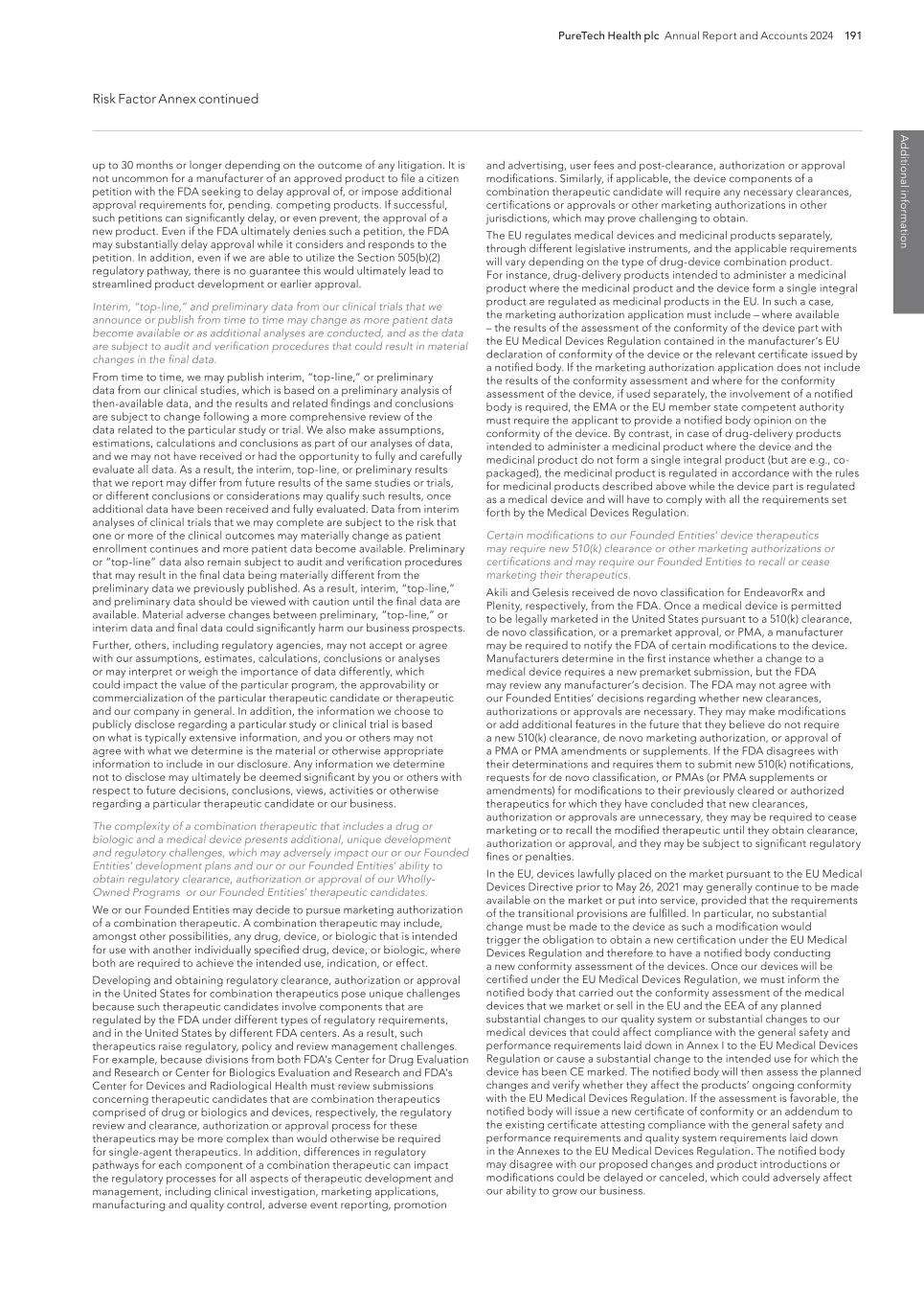 PureTech Health plc Annual Report and Accounts 2024 191 Risk Factor Annex continued A d d itio nal info rm atio n and advertising, user fees and post-clearance, authorization or approval modifications. Similarly, if applicable, the device components of a combination therapeutic candidate will require any necessary clearances, certifications or approvals or other marketing authorizations in other jurisdictions, which may prove challenging to obtain. The EU regulates medical devices and medicinal products separately, through different legislative instruments, and the applicable requirements will vary depending on the type of drug-device combination product. For instance, drug-delivery products intended to administer a medicinal product where the medicinal product and the device form a single integral product are regulated as medicinal products in the EU. In such a case, the marketing authorization application must include – where available – the results of the assessment of the conformity of the device part with the EU Medical Devices Regulation contained in the manufacturer’s EU declaration of conformity of the device or the relevant certificate issued by a notified body. If the marketing authorization application does not include the results of the conformity assessment and where for the conformity assessment of the device, if used separately, the involvement of a notified body is required, the EMA or the EU member state competent authority must require the applicant to provide a notified body opinion on the conformity of the device. By contrast, in case of drug-delivery products intended to administer a medicinal product where the device and the medicinal product do not form a single integral product (but are e.g., co- packaged), the medicinal product is regulated in accordance with the rules for medicinal products described above while the device part is regulated as a medical device and will have to comply with all the requirements set forth by the Medical Devices Regulation. Certain modifications to our Founded Entities’ device therapeutics may require new 510(k) clearance or other marketing authorizations or certifications and may require our Founded Entities to recall or cease marketing their therapeutics. Akili and Gelesis received de novo classification for EndeavorRx and Plenity, respectively, from the FDA. Once a medical device is permitted to be legally marketed in the United States pursuant to a 510(k) clearance, de novo classification, or a premarket approval, or PMA, a manufacturer may be required to notify the FDA of certain modifications to the device. Manufacturers determine in the first instance whether a change to a medical device requires a new premarket submission, but the FDA may review any manufacturer’s decision. The FDA may not agree with our Founded Entities’ decisions regarding whether new clearances, authorizations or approvals are necessary. They may make modifications or add additional features in the future that they believe do not require a new 510(k) clearance, de novo marketing authorization, or approval of a PMA or PMA amendments or supplements. If the FDA disagrees with their determinations and requires them to submit new 510(k) notifications, requests for de novo classification, or PMAs (or PMA supplements or amendments) for modifications to their previously cleared or authorized therapeutics for which they have concluded that new clearances, authorization or approvals are unnecessary, they may be required to cease marketing or to recall the modified therapeutic until they obtain clearance, authorization or approval, and they may be subject to significant regulatory fines or penalties. In the EU, devices lawfully placed on the market pursuant to the EU Medical Devices Directive prior to May 26, 2021 may generally continue to be made available on the market or put into service, provided that the requirements of the transitional provisions are fulfilled. In particular, no substantial change must be made to the device as such a modification would trigger the obligation to obtain a new certification under the EU Medical Devices Regulation and therefore to have a notified body conducting a new conformity assessment of the devices. Once our devices will be certified under the EU Medical Devices Regulation, we must inform the notified body that carried out the conformity assessment of the medical devices that we market or sell in the EU and the EEA of any planned substantial changes to our quality system or substantial changes to our medical devices that could affect compliance with the general safety and performance requirements laid down in Annex I to the EU Medical Devices Regulation or cause a substantial change to the intended use for which the device has been CE marked. The notified body will then assess the planned changes and verify whether they affect the products’ ongoing conformity with the EU Medical Devices Regulation. If the assessment is favorable, the notified body will issue a new certificate of conformity or an addendum to the existing certificate attesting compliance with the general safety and performance requirements and quality system requirements laid down in the Annexes to the EU Medical Devices Regulation. The notified body may disagree with our proposed changes and product introductions or modifications could be delayed or canceled, which could adversely affect our ability to grow our business. up to 30 months or longer depending on the outcome of any litigation. It is not uncommon for a manufacturer of an approved product to file a citizen petition with the FDA seeking to delay approval of, or impose additional approval requirements for, pending. competing products. If successful, such petitions can significantly delay, or even prevent, the approval of a new product. Even if the FDA ultimately denies such a petition, the FDA may substantially delay approval while it considers and responds to the petition. In addition,