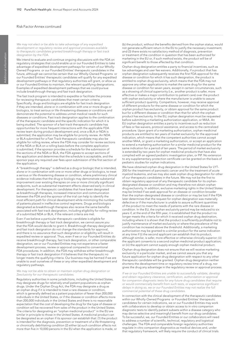 192 PureTech Health plc Annual Report and Accounts 2024 Risk Factor Annex continued A d d it io na l i nf o rm at io n (b) the product, without the benefits derived from the orphan status, would not generate sufficient return in the EU to justify the necessary investment; and (3) there exists no satisfactory method of diagnosis, prevention or treatment of the condition in question that has been authorized for marketing in the EU or, if such method exists, the product will be of significant benefit to those affected by that condition. Orphan drug designation entitles a party to financial incentives, such as tax advantages and user fee waivers. Additionally, if a product that has orphan designation subsequently receives the first FDA approval for the disease or condition for which it has such designation, the product is entitled to orphan drug exclusivity, which means that the FDA may not approve any other applications to market the same drug for the same disease or condition for seven years, except in certain circumstances, such as a showing of clinical superiority (i.e., another product is safer, more effective or makes a major contribution to patient care) over the product with orphan exclusivity or where the manufacturer is unable to assure sufficient product quantity. Competitors, however, may receive approval of different products for the same disease or condition for which the orphan product has exclusivity, or obtain approval for the same product but for a different disease or condition than that for which the orphan product has exclusivity. In the EU, orphan designation must be requested before submitting a marketing authorization application, or MAA. An EU orphan designation entitles a party to incentives such as reduction of fees or fee waivers, protocol assistance, and access to the centralized procedure. Upon grant of a marketing authorization, orphan medicinal products are entitled to ten years of market exclusivity for the approved indication, which means that the competent authorities cannot accept another MAA, or grant a marketing authorization, or accept an application to extend a marketing authorization for a similar medicinal product for the same indication for a period of ten years. The period of market exclusivity is extended by two years for orphan medicinal products that have also complied with an agreed pediatric investigation plan, or PIP. No extension to any supplementary protection certificate can be granted on the basis of pediatric studies for orphan indications. We have obtained orphan drug designation in the United States for LYT- 200 for the treatment of pancreatic cancer and for the treatment of acute myeloid leukemia, and we may also seek orphan drug designation for other of our therapeutic candidates in the future. We may not be the first to obtain regulatory approval of any therapeutic candidate for its orphan- designated disease or condition and may therefore not obtain orphan drug exclusivity. In addition, exclusive marketing rights in the United States may be limited if we seek approval for an disease or condition broader than the orphan-designated disease or condition or may be lost if the FDA later determines that the request for orphan designation was materially defective or if the manufacturer is unable to assure sufficient quantities of the product to meet the needs of patients with the rare disease or condition. In the EU, the orphan exclusivity period may be reduced to six years if, at the end of the fifth year, it is established that the product no longer meets the criteria for which it received orphan drug destination, including where it is shown that the product is sufficiently profitable not to justify maintenance of market exclusivity or where the prevalence of the condition has increased above the threshold. Additionally, a marketing authorization may be granted to a similar product for the same indication at any time if (i) the second applicant can establish that its product, although similar, is safer, more effective or otherwise clinically superior; (ii) the applicant consents to a second orphan medicinal product application; or (iii) the applicant cannot supply enough orphan medicinal product. Orphan drug designation does not ensure that we will receive marketing exclusivity in a particular market, and we cannot assure you that any future application for orphan drug designation with respect to any other therapeutic candidate will be granted. Orphan drug designation neither shortens the development time or regulatory review time of a drug, nor gives the drug any advantage in the regulatory review or approval process. If we or our Founded Entities are unable to successfully validate, develop and obtain regulatory clearance, certification, authorization or approval for companion diagnostic tests for any future drug candidates that require or would commercially benefit from such tests, or experience significant delays in doing so, we or our Founded Entities may not realize the full commercial potential of these drug candidates. In connection with the clinical development of the therapeutic candidates within our Wholly-Owned Programs or Founded Entities’ therapeutic candidates for certain indications, we or our Founded Entities may work with collaborators to develop or obtain access to in vitro companion diagnostic tests to identify patient subsets within a disease category who may derive selective and meaningful benefit from our drug candidates. To be successful, we, our Founded Entities or our collaborators will need to address a number of scientific, technical, regulatory and logistical challenges. The FDA and comparable foreign regulatory authorities regulate in vitro companion diagnostics as medical devices and, under that regulatory framework, will likely require the conduct of clinical trials We may not elect or be able to take advantage of any expedited development or regulatory review and approval processes available to therape