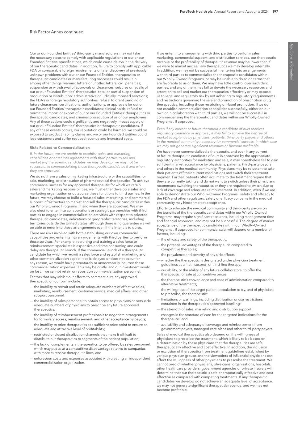 PureTech Health plc Annual Report and Accounts 2024 197 Risk Factor Annex continued A d d itio nal info rm atio n If we enter into arrangements with third parties to perform sales, marketing, commercial support, and distribution services, our therapeutic revenue or the profitability of therapeutic revenue may be lower than if we were to market and sell any therapeutics we may develop internally. In addition, we may not be successful in entering into arrangements with third parties to commercialize the therapeutic candidates within our Wholly-Owned Programs or may be unable to do so on terms that are favorable to us or them. We may have little control over such third parties, and any of them may fail to devote the necessary resources and attention to sell and market our therapeutics effectively or may expose us to legal and regulatory risk by not adhering to regulatory requirements and restrictions governing the sale and promotion of prescription drug therapeutics, including those restricting off-label promotion. If we do not establish commercialization capabilities successfully, either on our own or in collaboration with third parties, we will not be successful in commercializing the therapeutic candidates within our Wholly-Owned Programs , if approved. Even if any current or future therapeutic candidate of ours receives regulatory clearance or approval, it may fail to achieve the degree of market acceptance by physicians, patients, third-party payors and others in the medical community necessary for commercial success, in which case we may not generate significant revenues or become profitable. We have never commercialized a therapeutic, and even if any current or future therapeutic candidate of ours is approved by the appropriate regulatory authorities for marketing and sale, it may nonetheless fail to gain sufficient market acceptance by physicians, patients, third-party payors and others in the medical community. Physicians may be reluctant to take their patients off their current medications and switch their treatment regimen. Further, patients often acclimate to the treatment regime that they are currently taking and do not want to switch unless their physicians recommend switching therapeutics or they are required to switch due to lack of coverage and adequate reimbursement. In addition, even if we are able to demonstrate our Wholly-Owned Programs ’ safety and efficacy to the FDA and other regulators, safety or efficacy concerns in the medical community may hinder market acceptance. Efforts to educate the medical community and third-party payors on the benefits of the therapeutic candidates within our Wholly-Owned Programs may require significant resources, including management time and financial resources, and may not be successful. The degree of market acceptance of the therapeutic candidates within our Wholly-Owned Programs , if approved for commercial sale, will depend on a number of factors, including: — the efficacy and safety of the therapeutic; — the potential advantages of the therapeutic compared to competitive therapies; — the prevalence and severity of any side effects; — whether the therapeutic is designated under physician treatment guidelines as a first-, second- or third-line therapy; — our ability, or the ability of any future collaborators, to offer the therapeutic for sale at competitive prices; — the therapeutic’s convenience and ease of administration compared to alternative treatments; — the willingness of the target patient population to try, and of physicians to prescribe, the therapeutic; — limitations or warnings, including distribution or use restrictions contained in the therapeutic’s approved labelling; — the strength of sales, marketing and distribution support; — changes in the standard of care for the targeted indications for the therapeutic; and — availability and adequacy of coverage and reimbursement from government payors, managed care plans and other third-party payors. Sales of medical therapeutics also depend on the willingness of physicians to prescribe the treatment, which is likely to be based on a determination by these physicians that the therapeutics are safe, therapeutically effective and cost effective. In addition, the inclusion or exclusion of therapeutics from treatment guidelines established by various physician groups and the viewpoints of influential physicians can affect the willingness of other physicians to prescribe the treatment. We cannot predict whether physicians, physicians’ organizations, hospitals, other healthcare providers, government agencies or private insurers will determine that our therapeutic is safe, therapeutically effective and cost effective as compared with competing treatments. If any therapeutic candidates we develop do not achieve an adequate level of acceptance, we may not generate significant therapeutic revenue, and we may not become profitable. Our or our Founded Entities’ third-party manufacturers may not take the necessary steps to comply with applicable regulations or our or our Founded Entities’ specifications, which could cause delays in the delivery of our therapeutic candidates. In addition, failure to comply with applicable FDA or comparable foreign requirements or later discovery of previously unknown problems with our or our Founded Entities’ therapeutics or therapeutic candidates or manufacturing processes could result in, among other things: warning letters or untitled letters; civil penalties; suspension or withdrawal of approvals or clearances; seizures or recalls of our or our Founded Entities’ therapeutics; total or partial suspension of production or distribution; administrative or judicially imposed sanctions; the FDA’s or foreign regulatory authorities’ refusal to grant pending or future clearances, certifications, authorizations, or approvals for our or our Founded Entities’ therapeutic candidates; clinical holds; refusal to permit the