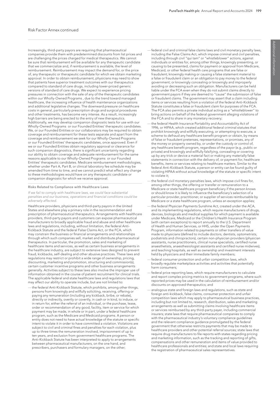 PureTech Health plc Annual Report and Accounts 2024 199 Risk Factor Annex continued A d d itio nal info rm atio n — federal civil and criminal false claims laws and civil monetary penalty laws, including the False Claims Act, which impose criminal and civil penalties, including through civil “qui tam” or “whistleblower” actions, against individuals or entities for, among other things, knowingly presenting, or causing to be presented, claims for payment or approval from Medicare, Medicaid, or other federal health care programs that are false or fraudulent; knowingly making or causing a false statement material to a false or fraudulent claim or an obligation to pay money to the federal government; or knowingly concealing or knowingly and improperly avoiding or decreasing such an obligation. Manufacturers can be held liable under the FCA even when they do not submit claims directly to government payors if they are deemed to “cause” the submission of false or fraudulent claims. The government may assert that a claim including items or services resulting from a violation of the federal Anti-Kickback Statute constitutes a false or fraudulent claim for purposes of the FCA. The FCA also permits a private individual acting as a “whistleblower” to bring actions on behalf of the federal government alleging violations of the FCA and to share in any monetary recovery; — the federal Health Insurance Portability and Accountability Act of 1996, or HIPAA, which created additional federal criminal statutes that prohibit knowingly and willfully executing, or attempting to execute, a scheme to defraud any healthcare benefit program or obtain, by means of false or fraudulent pretenses, representations, or promises, any of the money or property owned by, or under the custody or control of, any healthcare benefit program, regardless of the payor (e.g., public or private) and knowingly and willfully falsifying, concealing or covering up by any trick or device a material fact or making any materially false statements in connection with the delivery of, or payment for, healthcare benefits, items or services relating to healthcare matters. Similar to the federal Anti-Kickback Statute, a person or entity can be found guilty of violating HIPAA without actual knowledge of the statute or specific intent to violate it; — the federal civil monetary penalties laws, which impose civil fines for, among other things, the offering or transfer or remuneration to a Medicare or state healthcare program beneficiary if the person knows or should know it is likely to influence the beneficiary’s selection of a particular provider, practitioner, or supplier of services reimbursable by Medicare or a state healthcare program, unless an exception applies; — the federal Physician Payments Sunshine Act, created under the ACA, and its implementing regulations, which require manufacturers of drugs, devices, biologicals and medical supplies for which payment is available under Medicare, Medicaid or the Children’s Health Insurance Program (with certain exceptions) to report annually to the U.S. Department of Health and Human Services, or HHS, under the Open Payments Program, information related to payments or other transfers of value made to physicians (defined to include doctors, dentists, optometrists, podiatrists and chiropractors), certain non-physician providers (physician assistants, nurse practitioners, clinical nurse specialists, certified nurse anaesthetists, anaesthesiologist assistants and certified nurse midwives), and teaching hospitals, as well as ownership and investment interests held by physicians and their immediate family members; — federal consumer protection and unfair competition laws, which broadly regulate marketplace activities and activities that potentially harm consumers; — federal price reporting laws, which require manufacturers to calculate and report complex pricing metrics to government programs, where such reported prices may be used in the calculation of reimbursement and/or discounts on approved therapeutics; and — analogous state and foreign laws and regulations, such as state and foreign anti-kickback, false claims, consumer protection and unfair competition laws which may apply to pharmaceutical business practices, including but not limited to, research, distribution, sales and marketing arrangements as well as submitting claims involving healthcare items or services reimbursed by any third-party payer, including commercial insurers; state laws that require pharmaceutical companies to comply with the pharmaceutical industry’s voluntary compliance guidelines and the relevant compliance guidance promulgated by the federal government that otherwise restricts payments that may be made to healthcare providers and other potential referral sources; state laws that require drug manufacturers to file reports with states regarding pricing and marketing information, such as the tracking and reporting of gifts, compensations and other remuneration and items of value provided to healthcare professionals and entities; and state and local laws requiring the registration of pharmaceutical sales representatives. Increasingly, third-party payors are requiring that pharmaceutical companies provide them with predetermined discounts from list prices and are challenging the prices charged for medical therapeutics. We cannot be sure that reimbursement will be available for any therapeutic candidate that we commercialize and, if reimbursement is available, the level of reimbursement. Reimbursement may impact the demand for, or the price of, any therapeutic or therapeutic candidate for which we obtain marketing approval. In order to obtain reimbursement, physicians may need to show that patients have superior treatment outcomes with our therapeutics compared to standard of care drugs, including lower-priced generic versions of standard of care drugs. We expect to experience pricing pressures 