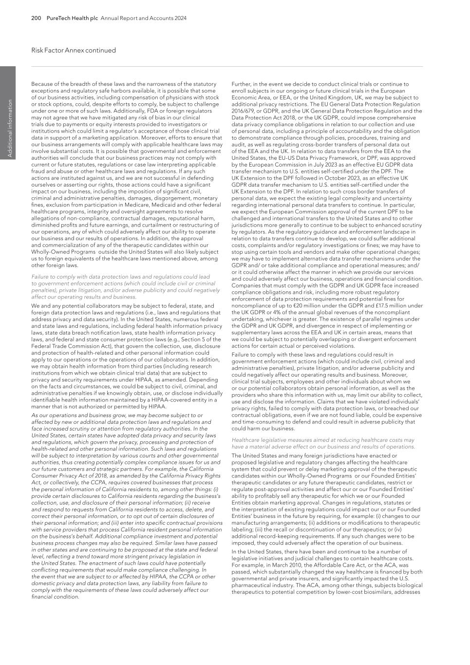 200 PureTech Health plc Annual Report and Accounts 2024 Risk Factor Annex continued A d d it io na l i nf o rm at io n Further, in the event we decide to conduct clinical trials or continue to enroll subjects in our ongoing or future clinical trials in the European Economic Area, or EEA, or the United Kingdom, UK, we may be subject to additional privacy restrictions. The EU General Data Protection Regulation 2016/679, or GDPR, and the UK General Data Protection Regulation and the Data Protection Act 2018, or the UK GDPR, could impose comprehensive data privacy compliance obligations in relation to our collection and use of personal data, including a principle of accountability and the obligation to demonstrate compliance through policies, procedures, training and audit, as well as regulating cross-border transfers of personal data out of the EEA and the UK. In relation to data transfers from the EEA to the United States, the EU-US Data Privacy Framework, or DPF, was approved by the European Commission in July 2023 as an effective EU GDPR data transfer mechanism to U.S. entities self-certified under the DPF. The UK Extension to the DPF followed in October 2023, as an effective UK GDPR data transfer mechanism to U.S. entities self-certified under the UK Extension to the DPF. In relation to such cross border transfers of personal data, we expect the existing legal complexity and uncertainty regarding international personal data transfers to continue. In particular, we expect the European Commission approval of the current DPF to be challenged and international transfers to the United States and to other jurisdictions more generally to continue to be subject to enhanced scrutiny by regulators. As the regulatory guidance and enforcement landscape in relation to data transfers continue to develop, we could suffer additional costs, complaints and/or regulatory investigations or fines; we may have to stop using certain tools and vendors and make other operational changes; we may have to implement alternative data transfer mechanisms under the GDPR and/ or take additional compliance and operational measures; and/ or it could otherwise affect the manner in which we provide our services and could adversely affect our business, operations and financial condition. Companies that must comply with the GDPR and UK GDPR face increased compliance obligations and risk, including more robust regulatory enforcement of data protection requirements and potential fines for noncompliance of up to €20 million under the GDPR and £17.5 million under the UK GDPR or 4% of the annual global revenues of the noncompliant undertaking, whichever is greater. The existence of parallel regimes under the GDPR and UK GDPR, and divergence in respect of implementing or supplementary laws across the EEA and UK in certain areas, means that we could be subject to potentially overlapping or divergent enforcement actions for certain actual or perceived violations. Failure to comply with these laws and regulations could result in government enforcement actions (which could include civil, criminal and administrative penalties), private litigation, and/or adverse publicity and could negatively affect our operating results and business. Moreover, clinical trial subjects, employees and other individuals about whom we or our potential collaborators obtain personal information, as well as the providers who share this information with us, may limit our ability to collect, use and disclose the information. Claims that we have violated individuals’ privacy rights, failed to comply with data protection laws, or breached our contractual obligations, even if we are not found liable, could be expensive and time-consuming to defend and could result in adverse publicity that could harm our business. Healthcare legislative measures aimed at reducing healthcare costs may have a material adverse effect on our business and results of operations. The United States and many foreign jurisdictions have enacted or proposed legislative and regulatory changes affecting the healthcare system that could prevent or delay marketing approval of the therapeutic candidates within our Wholly-Owned Programs or our Founded Entities’ therapeutic candidates or any future therapeutic candidates, restrict or regulate post-approval activities and affect our or our Founded Entities’ ability to profitably sell any therapeutic for which we or our Founded Entities obtain marketing approval. Changes in regulations, statutes or the interpretation of existing regulations could impact our or our Founded Entities’ business in the future by requiring, for example: (i) changes to our manufacturing arrangements; (ii) additions or modifications to therapeutic labeling; (iii) the recall or discontinuation of our therapeutics; or (iv) additional record-keeping requirements. If any such changes were to be imposed, they could adversely affect the operation of our business. In the United States, there have been and continue to be a number of legislative initiatives and judicial challenges to contain healthcare costs. For example, in March 2010, the Affordable Care Act, or the ACA, was passed, which substantially changed the way healthcare is financed by both governmental and private insurers, and significantly impacted the U.S. pharmaceutical industry. The ACA, among other things, subjects biological therapeutics to potential competition by lower-cost biosimilars, addresses Because of the breadth of these laws and the narrowness of the statutory exceptions and regulatory safe harbors available, it is possible that some of our business activities, including compensation of physicians with stock or stock options, could, despite efforts to comply, be subject to challenge under one or more of such laws. Additionally, FDA or foreign regulators may not agree that we have mitigated any risk of bias in our clinical trials due to payments or equity interests provided to investigators or ins