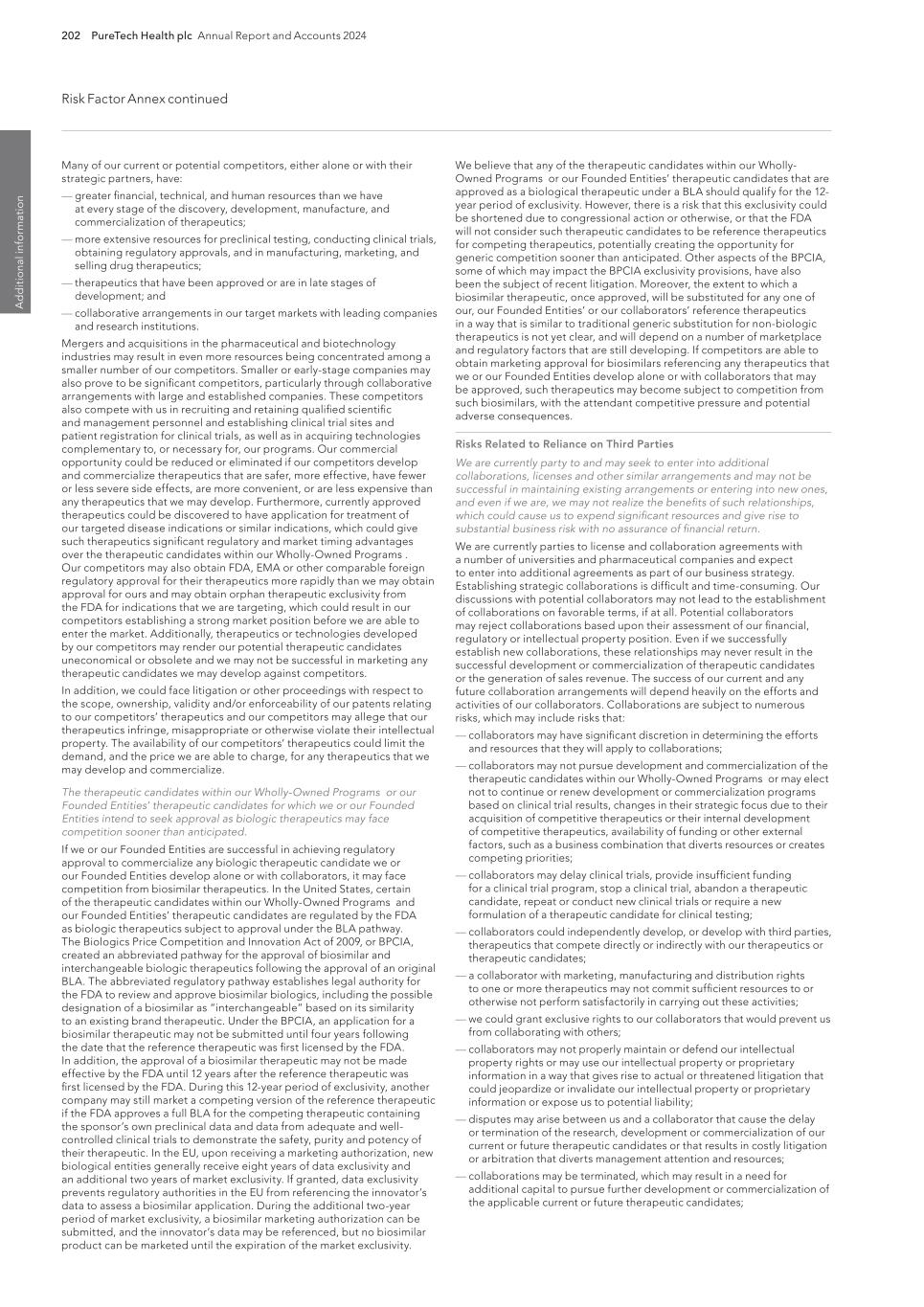 202 PureTech Health plc Annual Report and Accounts 2024 Risk Factor Annex continued A d d it io na l i nf o rm at io n We believe that any of the therapeutic candidates within our Wholly- Owned Programs or our Founded Entities’ therapeutic candidates that are approved as a biological therapeutic under a BLA should qualify for the 12- year period of exclusivity. However, there is a risk that this exclusivity could be shortened due to congressional action or otherwise, or that the FDA will not consider such therapeutic candidates to be reference therapeutics for competing therapeutics, potentially creating the opportunity for generic competition sooner than anticipated. Other aspects of the BPCIA, some of which may impact the BPCIA exclusivity provisions, have also been the subject of recent litigation. Moreover, the extent to which a biosimilar therapeutic, once approved, will be substituted for any one of our, our Founded Entities’ or our collaborators’ reference therapeutics in a way that is similar to traditional generic substitution for non-biologic therapeutics is not yet clear, and will depend on a number of marketplace and regulatory factors that are still developing. If competitors are able to obtain marketing approval for biosimilars referencing any therapeutics that we or our Founded Entities develop alone or with collaborators that may be approved, such therapeutics may become subject to competition from such biosimilars, with the attendant competitive pressure and potential adverse consequences. Risks Related to Reliance on Third Parties We are currently party to and may seek to enter into additional collaborations, licenses and other similar arrangements and may not be successful in maintaining existing arrangements or entering into new ones, and even if we are, we may not realize the benefits of such relationships, which could cause us to expend significant resources and give rise to substantial business risk with no assurance of financial return. We are currently parties to license and collaboration agreements with a number of universities and pharmaceutical companies and expect to enter into additional agreements as part of our business strategy. Establishing strategic collaborations is difficult and time-consuming. Our discussions with potential collaborators may not lead to the establishment of collaborations on favorable terms, if at all. Potential collaborators may reject collaborations based upon their assessment of our financial, regulatory or intellectual property position. Even if we successfully establish new collaborations, these relationships may never result in the successful development or commercialization of therapeutic candidates or the generation of sales revenue. The success of our current and any future collaboration arrangements will depend heavily on the efforts and activities of our collaborators. Collaborations are subject to numerous risks, which may include risks that: — collaborators may have significant discretion in determining the efforts and resources that they will apply to collaborations; — collaborators may not pursue development and commercialization of the therapeutic candidates within our Wholly-Owned Programs or may elect not to continue or renew development or commercialization programs based on clinical trial results, changes in their strategic focus due to their acquisition of competitive therapeutics or their internal development of competitive therapeutics, availability of funding or other external factors, such as a business combination that diverts resources or creates competing priorities; — collaborators may delay clinical trials, provide insufficient funding for a clinical trial program, stop a clinical trial, abandon a therapeutic candidate, repeat or conduct new clinical trials or require a new formulation of a therapeutic candidate for clinical testing; — collaborators could independently develop, or develop with third parties, therapeutics that compete directly or indirectly with our therapeutics or therapeutic candidates; — a collaborator with marketing, manufacturing and distribution rights to one or more therapeutics may not commit sufficient resources to or otherwise not perform satisfactorily in carrying out these activities; — we could grant exclusive rights to our collaborators that would prevent us from collaborating with others; — collaborators may not properly maintain or defend our intellectual property rights or may use our intellectual property or proprietary information in a way that gives rise to actual or threatened litigation that could jeopardize or invalidate our intellectual property or proprietary information or expose us to potential liability; — disputes may arise between us and a collaborator that cause the delay or termination of the research, development or commercialization of our current or future therapeutic candidates or that results in costly litigation or arbitration that diverts management attention and resources; — collaborations may be terminated, which may result in a need for additional capital to pursue further development or commercialization of the applicable current or future therapeutic candidates; Many of our current or potential competitors, either alone or with their strategic partners, have: — greater financial, technical, and human resources than we have at every stage of the discovery, development, manufacture, and commercialization of therapeutics; — more extensive resources for preclinical testing, conducting clinical trials, obtaining regulatory approvals, and in manufacturing, marketing, and selling drug therapeutics; — therapeutics that have been approved or are in late stages of development; and — collaborative arrangements in our target markets with leading companies and research institutions. Mergers and acquisitions in the pharmaceutical and biotechnology industries may result in even more resources being concentrated among a smaller n