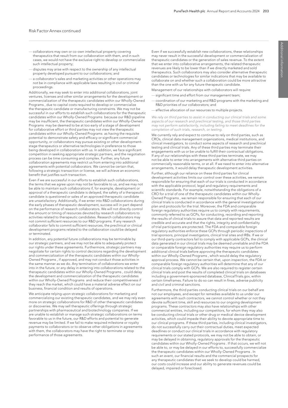 PureTech Health plc Annual Report and Accounts 2024 203 Risk Factor Annex continued A d d itio nal info rm atio n Even if we successfully establish new collaborations, these relationships may never result in the successful development or commercialization of therapeutic candidates or the generation of sales revenue. To the extent that we enter into collaborative arrangements, the related therapeutic revenues are likely to be lower than if we directly marketed and sold therapeutics. Such collaborators may also consider alternative therapeutic candidates or technologies for similar indications that may be available to collaborate on and whether such a collaboration could be more attractive than the one with us for any future therapeutic candidate. Management of our relationships with collaborators will require: — significant time and effort from our management team; — coordination of our marketing and R&D programs with the marketing and R&D priorities of our collaborators; and — effective allocation of our resources to multiple projects. We rely on third parties to assist in conducting our clinical trials and some aspects of our research and preclinical testing, and those third parties may not perform satisfactorily, including failing to meet deadlines for the completion of such trials, research, or testing. We currently rely and expect to continue to rely on third parties, such as CROs, clinical data management organizations, medical institutions, and clinical investigators, to conduct some aspects of research and preclinical testing and clinical trials. Any of these third parties may terminate their engagements with us or be unable to fulfill their contractual obligations. If any of our relationships with these third parties terminate, we may not be able to enter into arrangements with alternative third parties on commercially reasonable terms, or at all. If we need to enter into alternative arrangements, it would delay therapeutic development activities. Further, although our reliance on these third parties for clinical development activities limits our control over these activities, we remain responsible for ensuring that each of our trials is conducted in accordance with the applicable protocol, legal and regulatory requirements and scientific standards. For example, notwithstanding the obligations of a CRO for a trial of one of the therapeutic candidates within our Wholly- Owned Programs , we remain responsible for ensuring that each of our clinical trials is conducted in accordance with the general investigational plan and protocols for the trial. Moreover, the FDA and comparable foreign regulatory authorities require us to comply with requirements, commonly referred to as GCPs, for conducting, recording and reporting the results of clinical trials to assure that data and reported results are credible and accurate and that the rights, integrity and confidentiality of trial participants are protected. The FDA and comparable foreign regulatory authorities enforce these GCPs through periodic inspections of trial sponsors, principal investigators, clinical trial sites and IRBs. If we or our third-party contractors fail to comply with applicable GCPs, the clinical data generated in our clinical trials may be deemed unreliable and the FDA or comparable foreign regulatory authorities may require us to perform additional clinical trials before approving the therapeutic candidates within our Wholly-Owned Programs , which would delay the regulatory approval process. We cannot be certain that, upon inspection, the FDA or comparable foreign regulatory authorities will determine that any of our clinical trials comply with GCPs. We are also required to register certain clinical trials and post the results of completed clinical trials on databases including a government-sponsored database, ClinicalTrials.gov, within certain timeframes. Failure to do so can result in fines, adverse publicity and civil and criminal sanctions. Furthermore, the third parties conducting clinical trials on our behalf are not our employees, and except for remedies available to us under our agreements with such contractors, we cannot control whether or not they devote sufficient time, skill and resources to our ongoing development programs. These contractors may also have relationships with other commercial entities, including our competitors, for whom they may also be conducting clinical trials or other drug or medical device development activities, which could impede their ability to devote appropriate time to our clinical programs. If these third parties, including clinical investigators, do not successfully carry out their contractual duties, meet expected deadlines or conduct our clinical trials in accordance with regulatory requirements or our stated protocols, we may not be able to obtain, or may be delayed in obtaining, regulatory approvals for the therapeutic candidates within our Wholly-Owned Programs . If that occurs, we will not be able to, or may be delayed in our efforts to, successfully commercialize the therapeutic candidates within our Wholly-Owned Programs . In such an event, our financial results and the commercial prospects for any therapeutic candidates that we seek to develop could be harmed, our costs could increase and our ability to generate revenues could be delayed, impaired or foreclosed. — collaborators may own or co-own intellectual property covering therapeutics that result from our collaboration with them, and in such cases, we would not have the exclusive right to develop or commercialize such intellectual property; — disputes may arise with respect to the ownership of any intellectual property developed pursuant to our collaborations; and — a collaborator’s sales and marketing activities or other operations may not be in compliance with applicable laws resulting in civil or criminal proceedings. Additionally, we may seek to enter into additional collaborations, joint venture